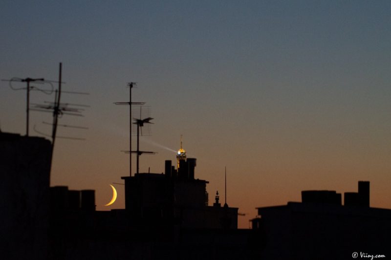 Après bientôt cinq années passées dans cet appartement, il m’arrive encore de découvrir des choses dans le ciel… C’était le 22 juillet dernier, pendant ce qui est à l’heure actuelle la seule semaine estivale dont nous ayons bénéficié cette année. Vous me direz, c’est peut-être ça le truc : il ne fait jamais vraiment beau le 22 juillet, alors comment aurais-je pu voir ça : la Lune et la Tour qui se saluent de près.