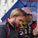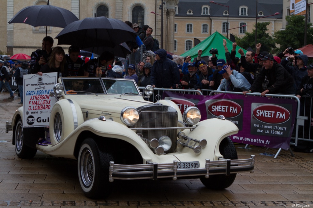 Parmi les autres images d’Épinal dont je m’étais farci la tête, il y a la Parade des Pilotes que l’on peut vivre en plein cœur du Mans. C ‘est en théorie l’occasion pour les pilotes d’être salués tels des héros (ce qu’ils sont, d’ailleurs !) par la foule venue en masse les encourager et les voir de plus près avant le grand sprint. J’avais en tête cette image d’un public chaleureux, de pilotes ravis et souriants, profitant d’un moment de communion avec une foule plus proche que d’ordinaire. Moi, naïf ? Totalement. Cela commençait bien pourtant avec les supercars au milieu de la foule, serpentant entre les tribunes, bien malheureusement sous une bruine persistante et quelques averses malvenues !