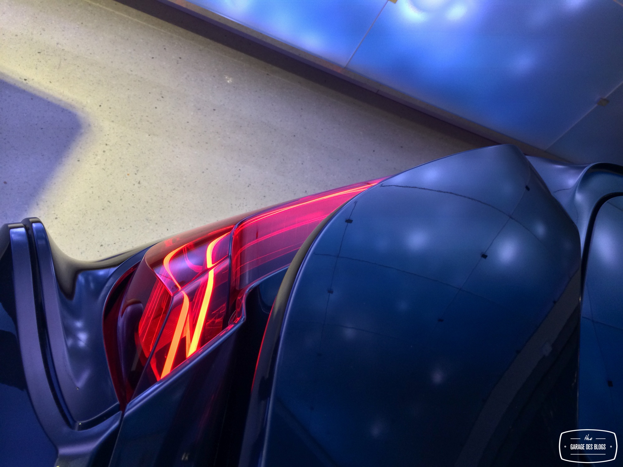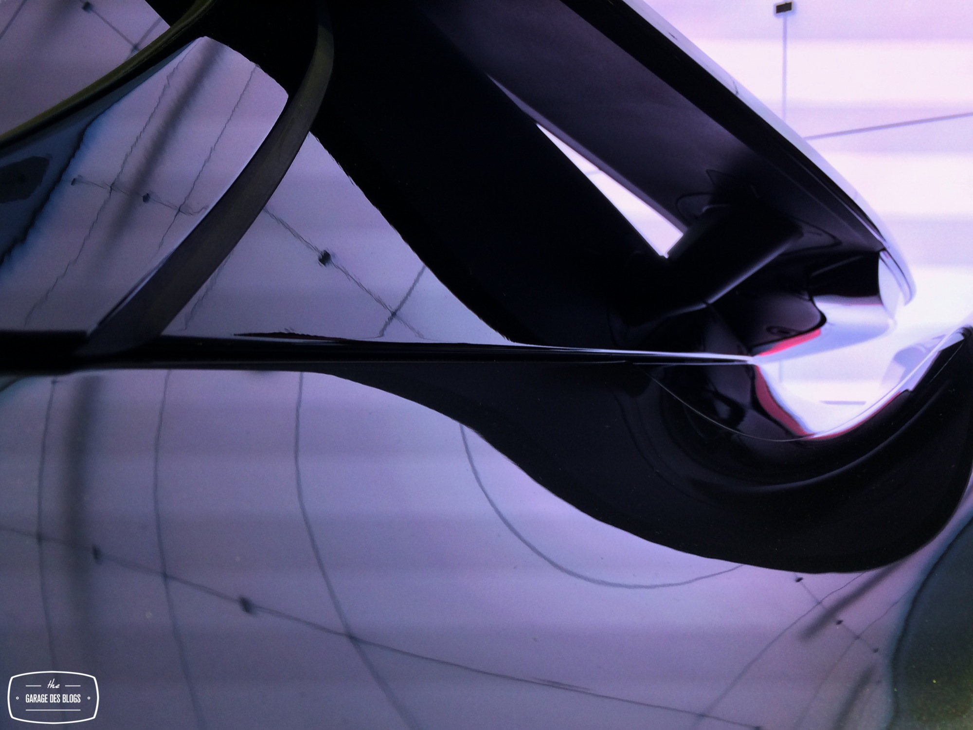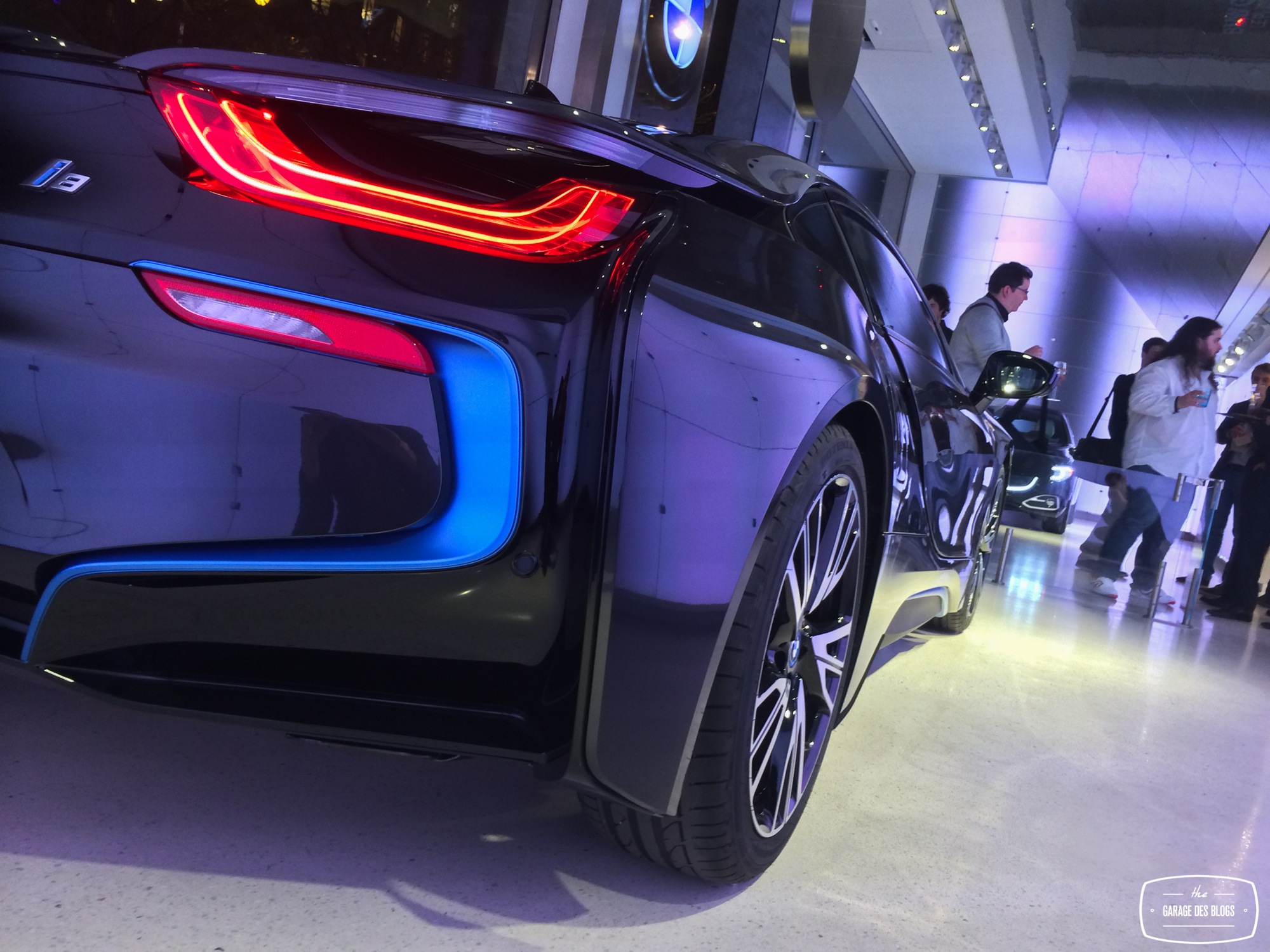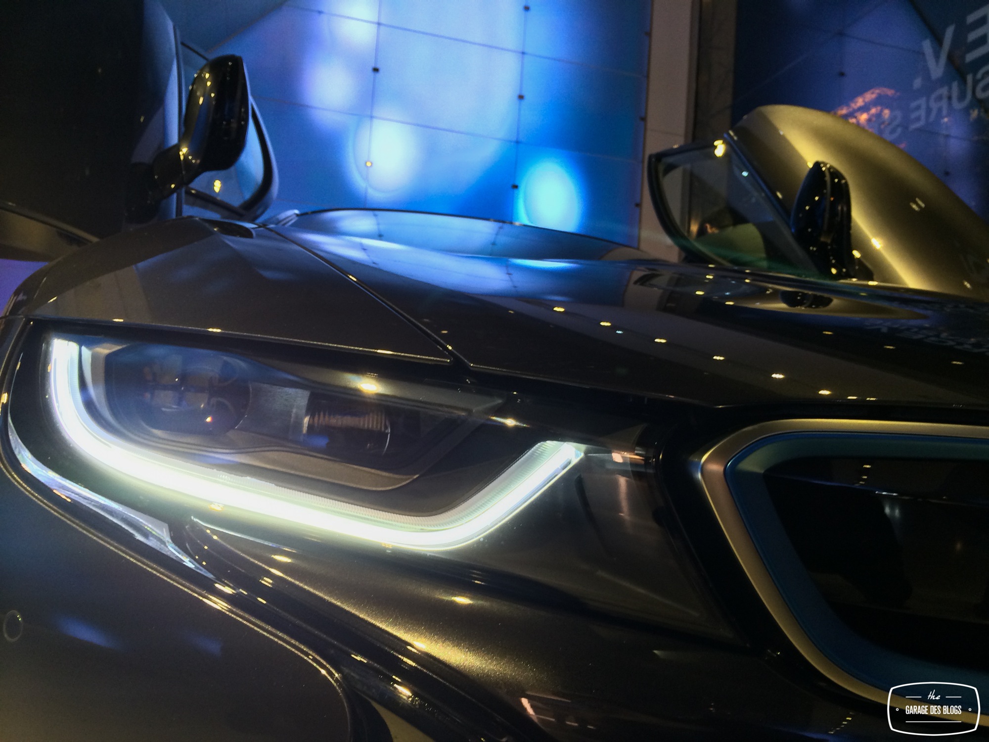 Cette présentation a donc été l’occasion de voir la bête de plus près, “de série”. Il s’avère que la voiture est tout à fait conforme au concept-car, particulièrement au niveau des lignes, uniques et assurant un Cx de 0.26. Le liseré bleu que l’on retrouve autour de la calandre et du sigle BMW court ensuite le long de la caisse. Le centre de gravité de la voiture est le plus bas de la gamme, grâce à l’usage de l’aluminium et grâce à l’habitacle en carbone.