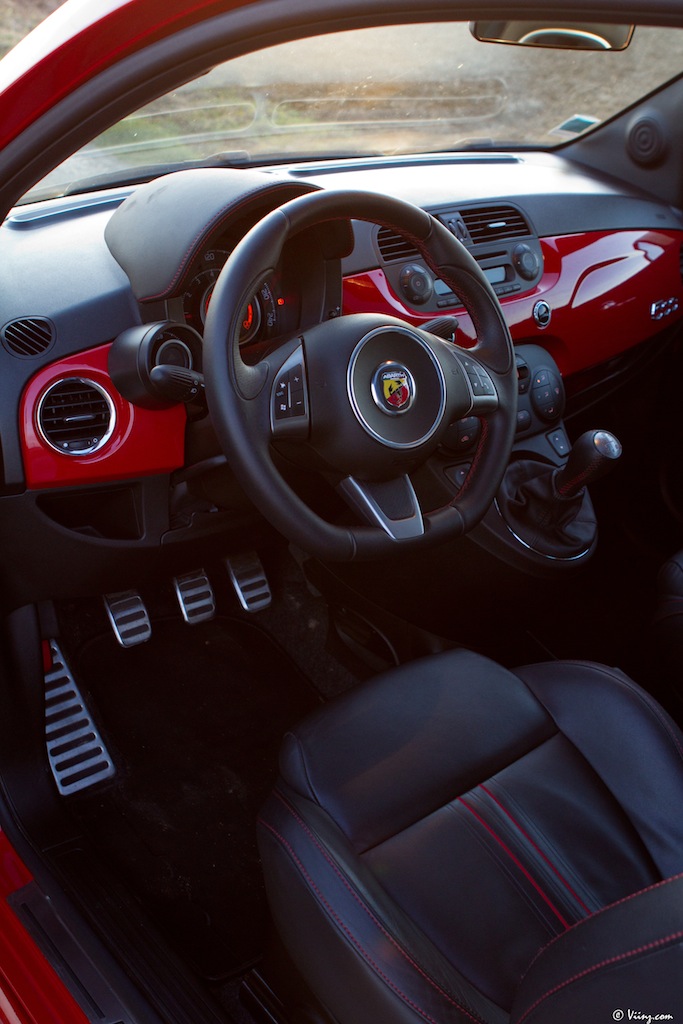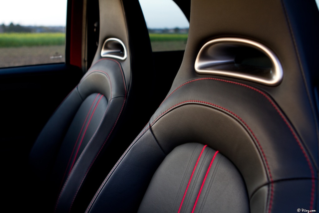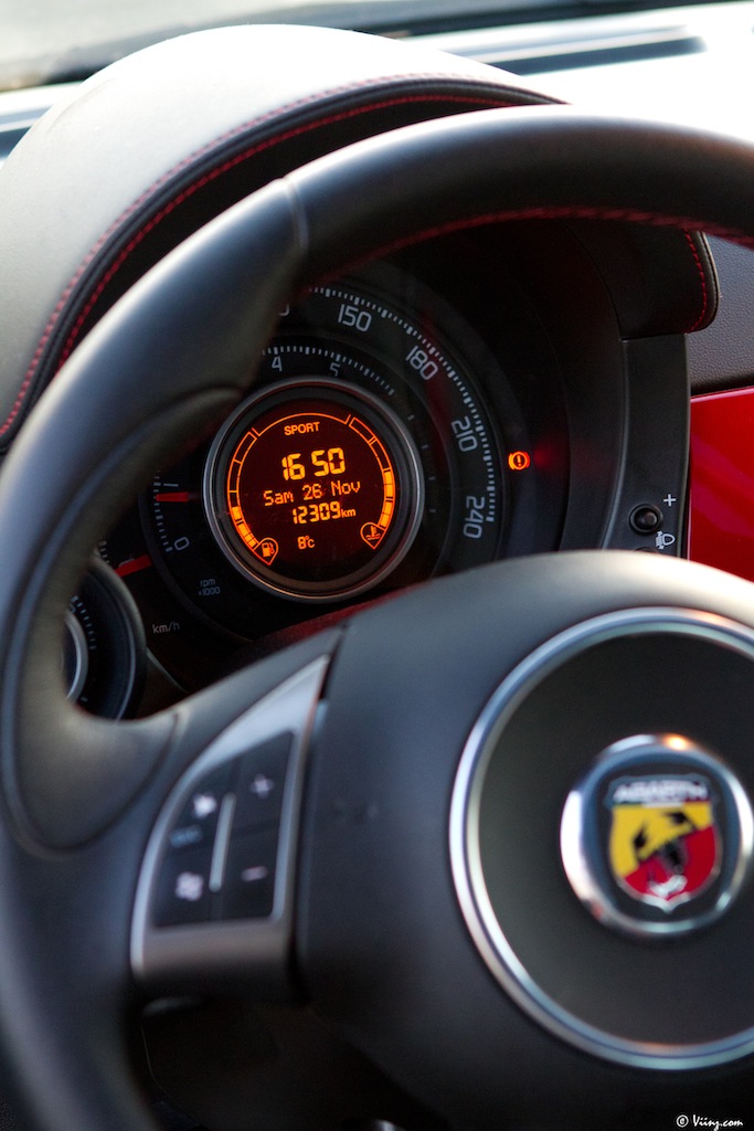 Pas de doute, Abarth a bossé sur l’échappement. Dès l’allumage, c’est une sonate ! Pas évident à faire avec un si petit moteur turbocompressé mais la marque s’en sort bien : c’est rauque à bas régime, ça chantonne à mi régime et ça gueule franchement quand on est haut dans les tours. Si l’on devait considérer le kit esseesse d’un simple point de vue acoustique, c’est tout bonnement un régal à vivre. Intérieurement, on vit aussi assez bien le fait de se retrouver dans cette voiture. Abarth, au contraire de certains concurrents, soigne particulièrement l’intérieur de ses voitures et cela se voit. De jolies commandes, de beaux baquets, de nombreux détails sont soignés et travaillés et font que l’on sait que l’on se trouve dans tout sauf une Fiat 500 de base. Plaisant même si les baquets mériteraient d’être remplacés par de vrais baquets, justement.