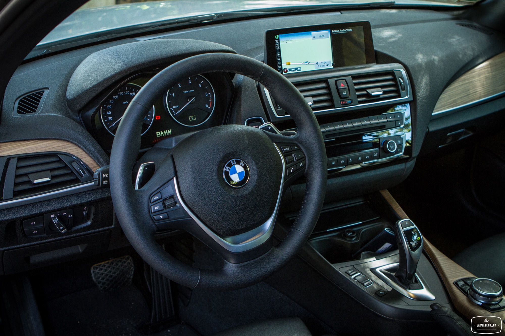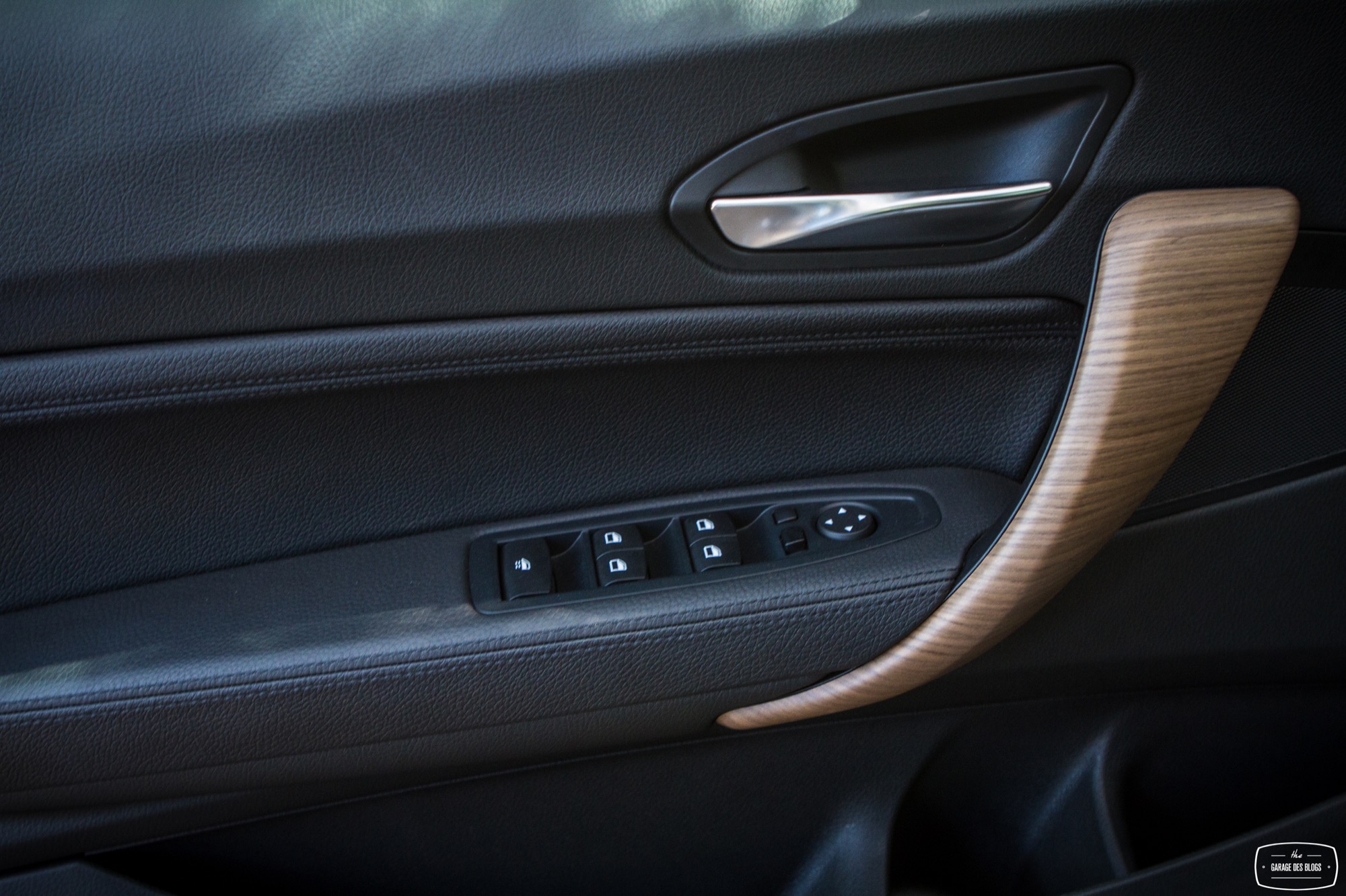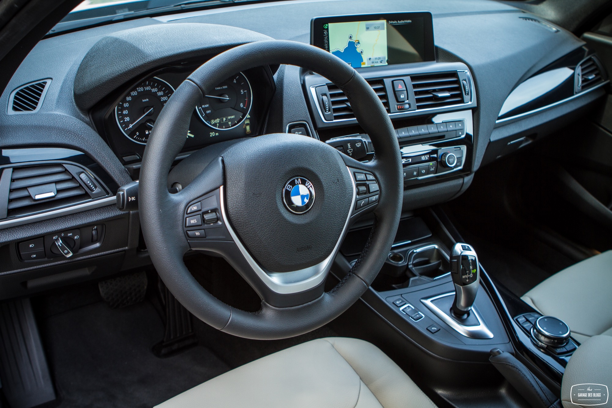 L’intérieur est à comparer à celui de la Série 1 décrit précédemment : même niveau d’équipement mais des inserts en bois joliment faits, même volant très vilain, mêmes avantages et inconvénients pour ce qui est du pavé tactile BMW iDrive et son écran : je ne saurais donc que vous conseiller ici aussi un volant sport en option ! Les sièges, manquant cruellement de maintien dans la 120d, sont ici des sièges “sport” et leur maintien en courbe est un bon compromis entre le sport et le confort. Bref : changez le volant, pour le reste on est globalement bien dans ce cabriolet, en plein soleil !