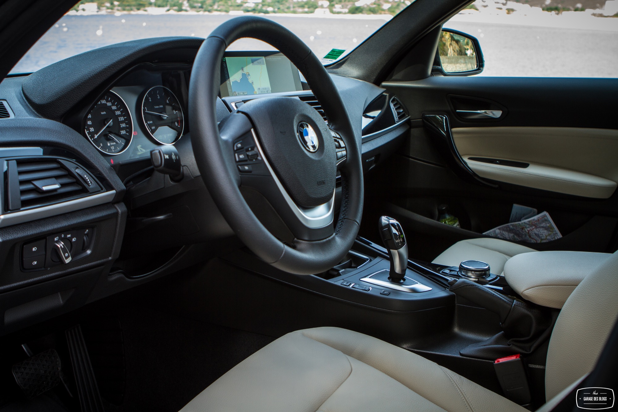 La mise à jour de l’intérieur de cette BMW 120d me laisse en revanche plus mitigé. Le système infotainment a été remis à jour et intègre désormais les nouveaux écrans iDrive 6.5 pouces et le système de mollette tactile sur le tunnel central. La console centrale est également de bonne facture avec des laquages noirs et des plastiques de qualité. C’est propre, très propre, un rien triste car trop noir et également très bien équipé avec les applications connectées, le régulateur adaptatif avec gestion des bouchons, mises à jour GPS via la carte SIM et autres petites délicatesses qui font que je me sens en général très bien pour voyager en BMW. Là où le bât blesse, en revanche, c’est du côté du bloc “pilotage”… Les compteurs sont sans grand intérêt, ce qui n’est pas encore dramatique car ils sont pour le reste tout à fait fonctionnels et les informations sont claires. Le volant. Voilà. Qu’est-ce que c’est que ce volant gros, grand, moche, en plastico-cuir moche ? Gros défaut de cette dotation : la BMW Série 1 dispose de série d’un volant très laid et je ne saurais que trop vous conseiller d’opter pour la version sport ou M. Bref : pas la série, quand bien même la belle coûte déjà 37k€ en base Lounge.