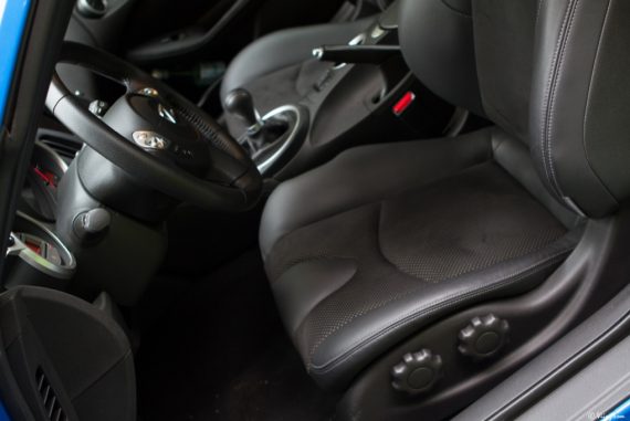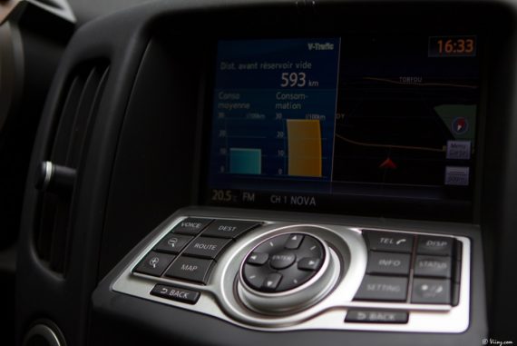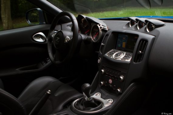 Les clés récupérées (enfin, ce qui sert de clé, keyless Nissan oblige), la première action est de démarrer le moteur tandis qu’on s’installe sans souci au ras du sol et qu’on trouve la position idéale pour les 600 kilomètres à venir. C’est qu’il s’agit de se rendre au Mans Classic (je reviendrai dessus très bientôt…) au volant de la belle. A défaut d’avoir beau temps. Mais je digresse… L’intérieur, donc. Si l’extérieur est beau et soigné, l’intérieur n’est pas en reste avec toutefois une alternance de jolies attentions (plastiques moussés, alcantara, beaux sièges) et de matériaux un peu moins flatteurs. Il s’agit de ne pas oublier que le 370Z n’est pas cher au regard des sensations qu’il procure et donc que l’essentiel n’a pas été de soigner les micro-détails des petits plastiques mais bien de trouver un compromis entre prix / confort à bord / prestations / sensations. L’objectif semble atteint en ce qui me concerne.
