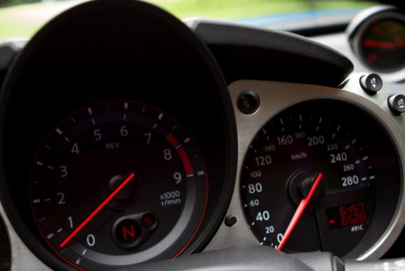 Avant de parler des vraies sensations, je vais m’attarder sur la vie à bord dans les pires conditions : il pleut et vous êtes dans un embouteillage. Les pédales sont fermes de manière générale, voire très ferme pour l’embrayage qui peut vite devenir pénible lors d’une tenue prolongée. De la même manière, la boîte est véritablement dure et les verrouillages nécessitent une certaine détermination malgré l’excellent guidage. Le maniement de la boîte en conduite normale / embouteillage demande donc un petit temps d’adaptation. Au début, à-coups garantis. Mais au bout de quelques kilomètres, on trouve l’équilibre avec l’embrayage sans abuser du patinage et la conduite devient coulée. L’ensemble pédalier / boîte demande donc à être apprivoisé mais une fois que c’est fait, c’est du velours. Dans ces conditions, le moteur se montre économe et discret, presque trop discret d’ailleurs par rapport au moulin. J’attendais un peu plus de coffre, de souffle, que ce soit un peu rauque, rageur, chantant. Au delà du démarrage du moteur, on entend finalement assez peu le V6, dommage, notamment par rapport au 350Z qui grognait nettement plus.