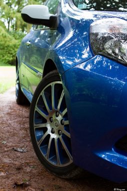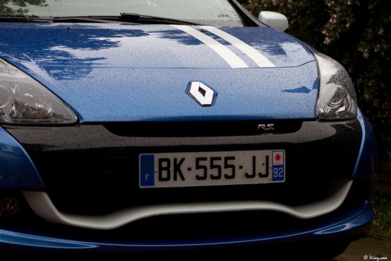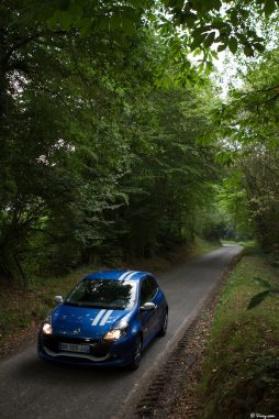 Après l’essai de la démente Mégane RS, j’ai eu la chance de poser mes fesses dans le baquet de sa petite sœur, la Clio RS badgée Gordini et donc dotée du kit purement esthétique de cette version : robe bleu malte, bandes blanches, habitacle revu et corrigé à la sauce Gordini et jantes bleu diamantées du plus bel effet. La petite puce, d’ordinaire assez discrète, est par conséquent métamorphosée et son caractère de mange-bitume étalé aux yeux de tous. J’ai beau regretter que ces “packs” Gordini soient purement esthétiques et non plus mécaniques comme le voudrait l’héritage Gordini, il faut bien avouer que le résultat est splendide et flatte l’œil. Le point de rendez-vous était le même que pour la Mégane RS, j’ai donc retrouvé avec plaisir ce parking et pris la mesure de celle qui ressemble à un hamster bodybuildé en robe de gala… Le bleu malte allume des paillettes dans mes iris, la lèvre blanche du spoiler avant est une invite à la caresse de l’accélérateur, les jantes diamantées sont sublimes. Vite, moteur !