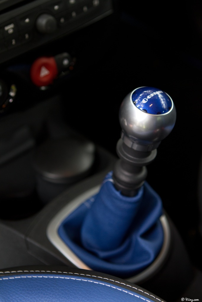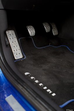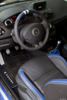 A l’intérieur, une fois la portière refermée dans un claquement sourd, le traitement Gordini est visible, agréablement visible en fait, donnant tout son sens au terme de préparation et rendant l’habitacle de la Clio tout à fait désirable. Volant gainé de bleu et de blanc, baquets en cuir rehaussés du même bleu, pommeau de vitesse en aluminium qui tombe parfaitement sous la main, plaque Gordini sous le tireur de câble, pédales “sport” (oui je dis, “sport”), tout est bien réalisé. Je m’attendais toutefois à une assise un peu plus raide que celle de ces baquets, quelque chose de plus extrême et de moins rembourré / chauffant / électrique. Qu’importe, on est très bien maintenu dans les baquets et la voiture est confortable, Renault Sport ayant réussi comme avec la Mégane à trouver un compromis parfait entre efficacité et confort. Bravo.