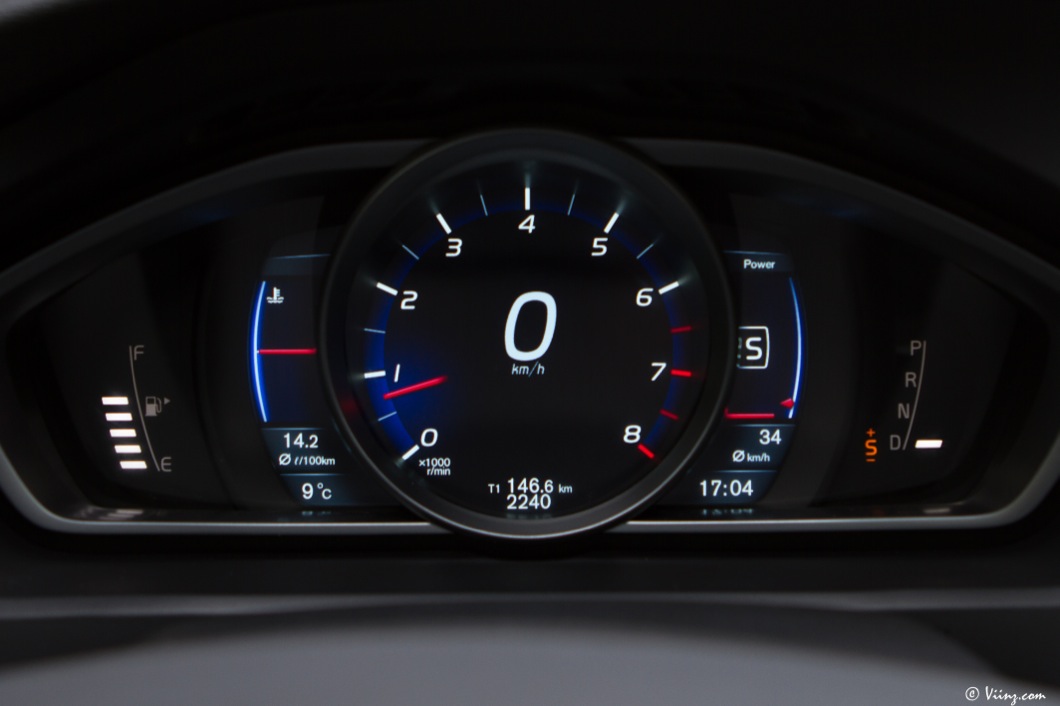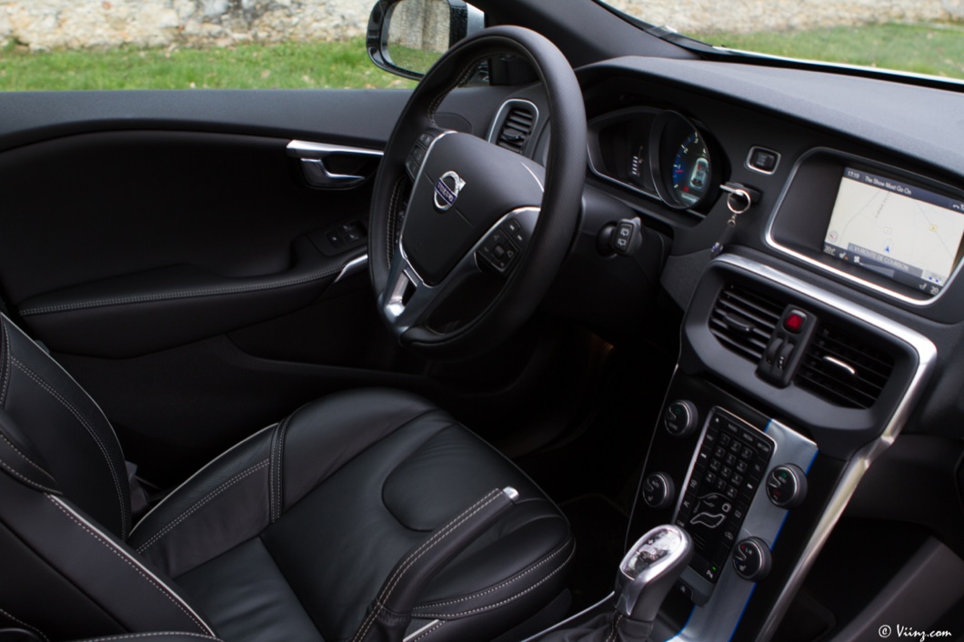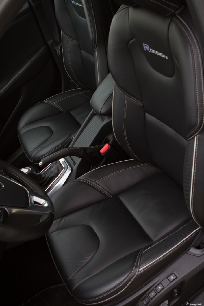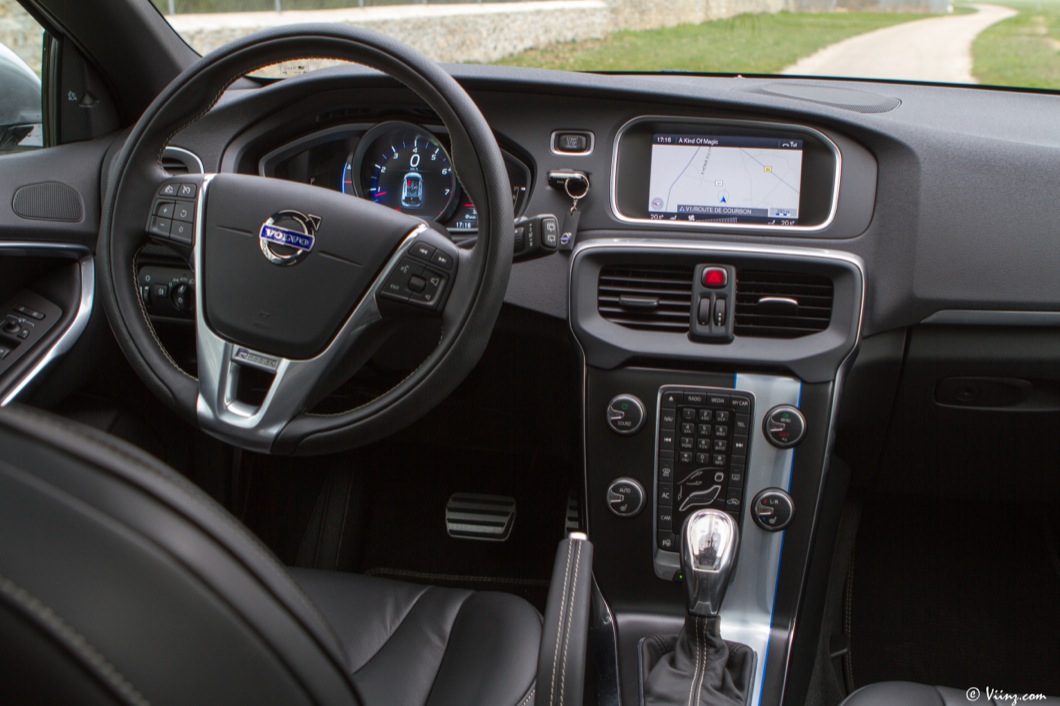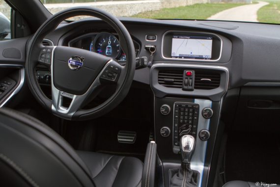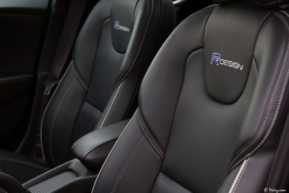 A l’intérieur, le R-Design est sensible également avec un combiné spécifique, des rappels R-Design sur la console centrale, un volant 3 branches et un pédalier spécifiques. Les baquets sont eux-aussi marqués de la griffe mais ne sont à mes yeux pas assez bons. Leur maintien latéral n’est pas au niveau des accélérations que sait générer la voiture ! Pour le reste de l’équipement, la V40 T5 souffre / bénéficie des mêmes défauts / qualités que la D4. Un intérieur de qualité, des features en matière de sécuritéde jolies matières mais aussi quelques plastiques peu flatteurs, un système infotainment de qualité mais sans écran tactile, etc. Cette V40 reste très agréable à vivre, vraiment, malgré ces quelques menus défauts et est à ce titre, une voiture à vivre réussie d’autant plus que le confort n’est pas trop dégradé avec cette version plus sportive. Volvo a semble-t-il trouvé un bon compromis entre dynamisme routier et confort. Bien vu.