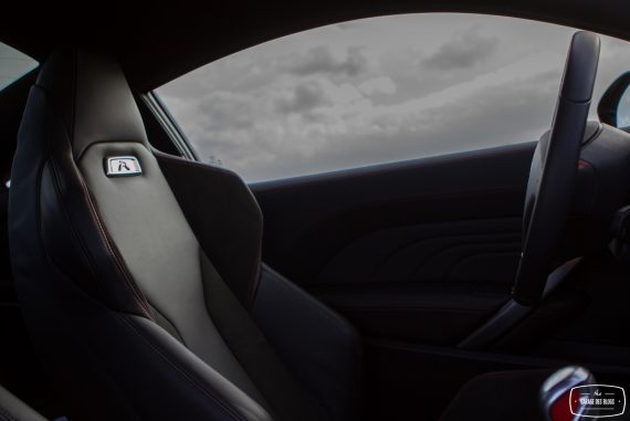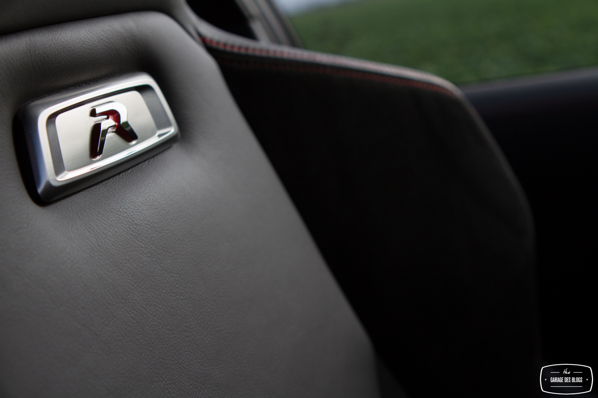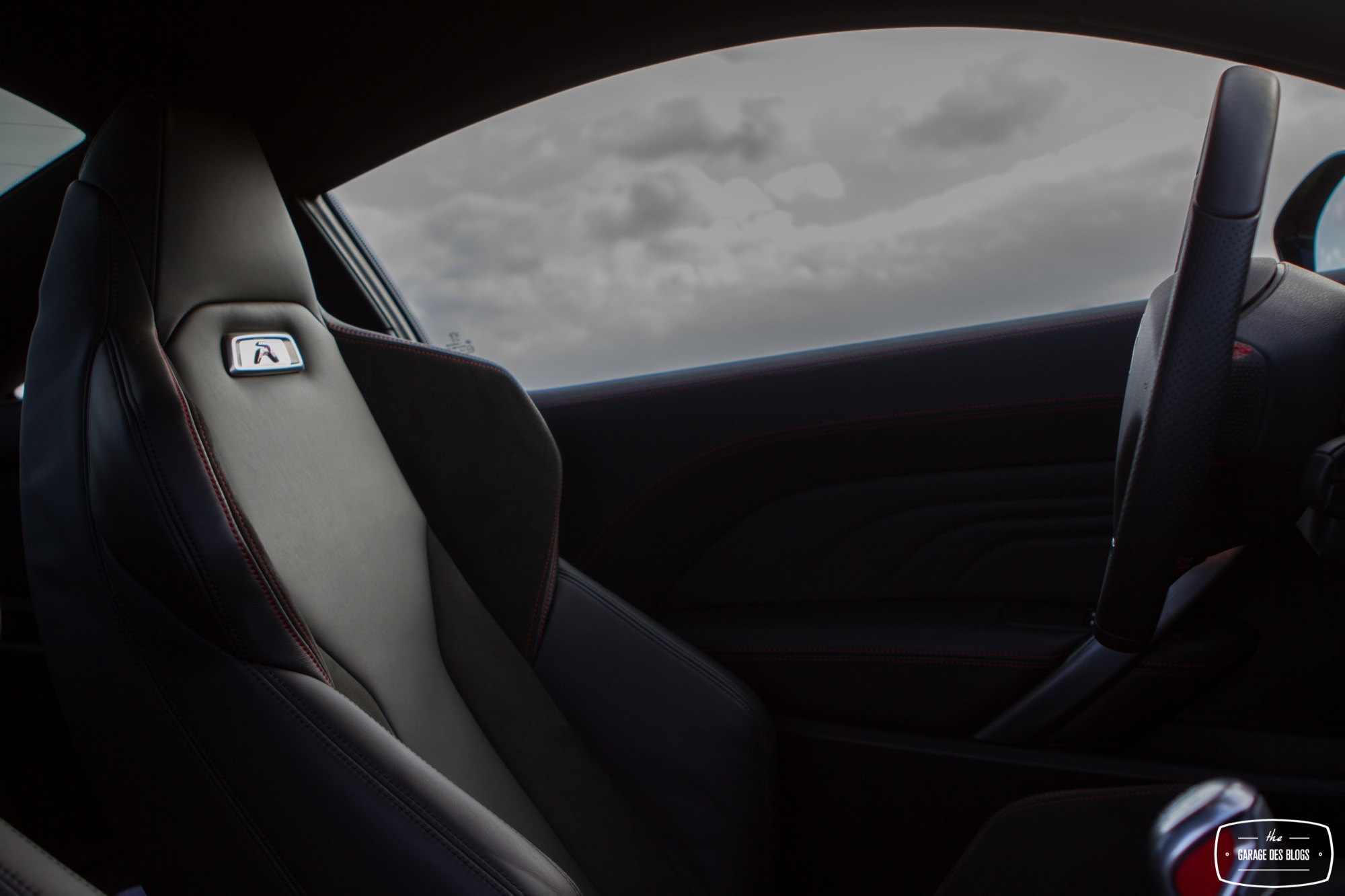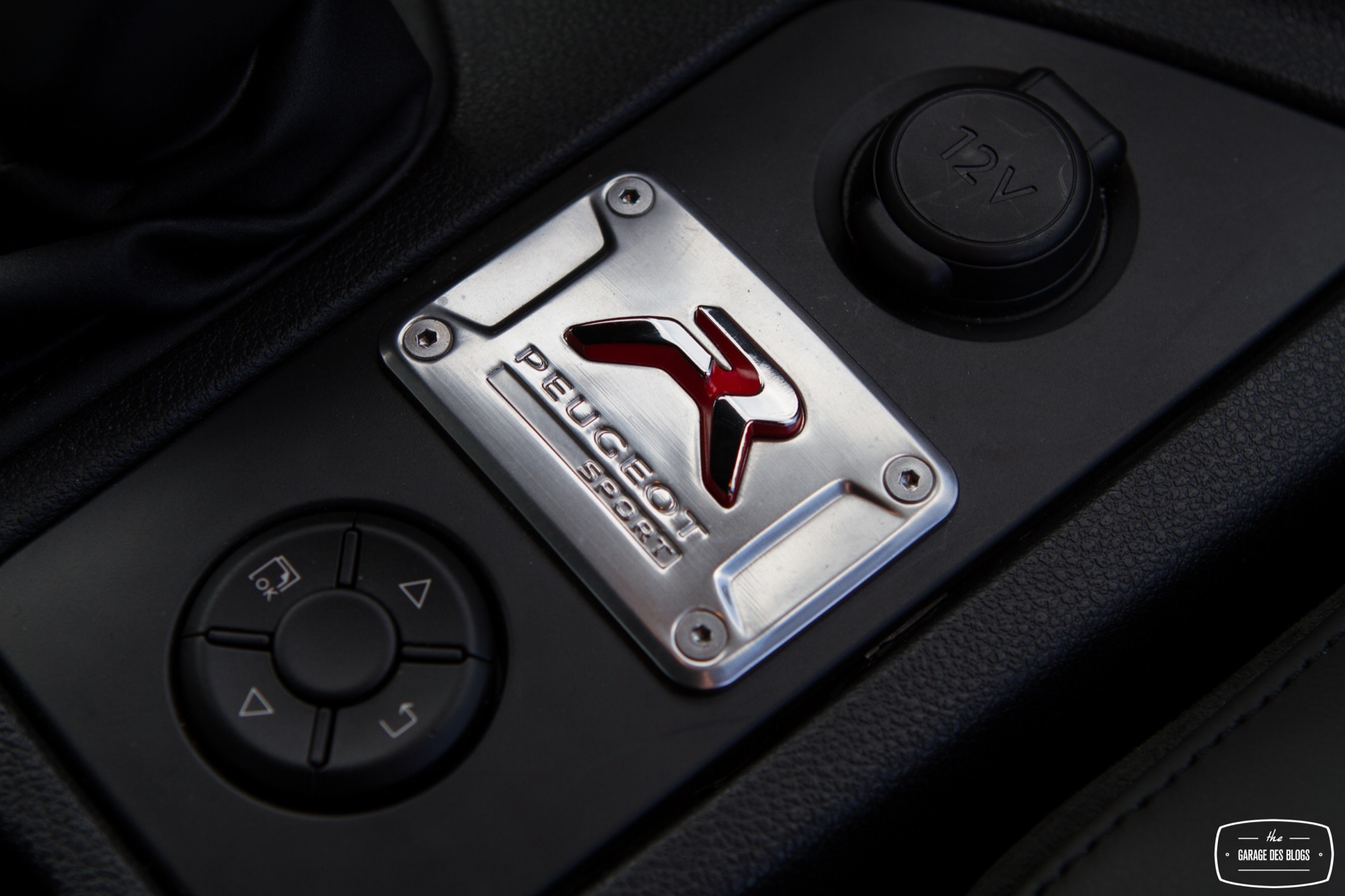 D’un bip sur la clé (oulah, qu’elle est moche mais n’en parlons pas, ça me colle encore des frissons d’y penser), on déverrouille. Les rétroviseurs noirs se déploient joliment et on se glisse sous les arches de toit noir mat pour s’installer à bord, enjambant les seuils spécifiques affichant le Peugeot Sport qui va bien. Les baquets ont été changés et affichent également un R de circonstance. Plus enveloppants, bien galbés et offrant un bon maintien, j’ai tendance à penser qu’ils auraient mérité un réglage supplémentaire du côté du serrage latéral. Un détail, toutefois, car le gabarit moyen que je suis n’a pas été gêné par la chose. Le volant adopte un méplat bien dimensionné sur sa partie basse et se dénude de tout autre bouton. Voilà ici aussi une délicate attention.