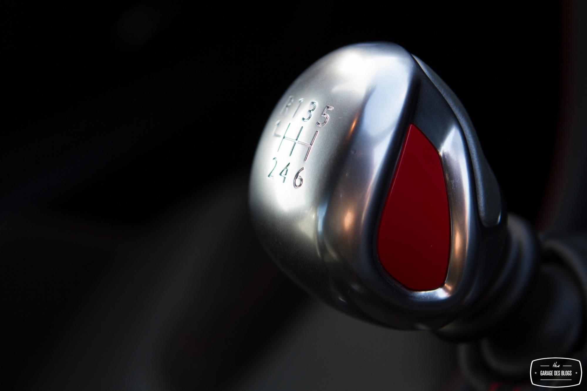 Le levier de vitesse de la boîte 6 se pare du même rouge que les coutures des baquets et du volant tandis qu’une plaque “Peugeot Sport / R” est vissée sur le tunnel central, pile à côté du frein à main. Malheureusement, le plastique de cette zone centrale est moche et les boutons qui l’entourent aussi. Autant pour l’effet p0rn de ladite plaque. Sous les pieds, les pédales sont en aluminium mais les pédales de frein et d’accélérateur m’ont semblé un brin trop espacées. Rien de rédhibitoire toutefois. Enfin, dernier détail à l’intérieur, les flancs de portière sont réussis, avec un beau mélange noir / rouge. C’est d’ailleurs ce que je ressens globalement vis à vis du choix d’ambiance intérieure pour ce RCZ-R.