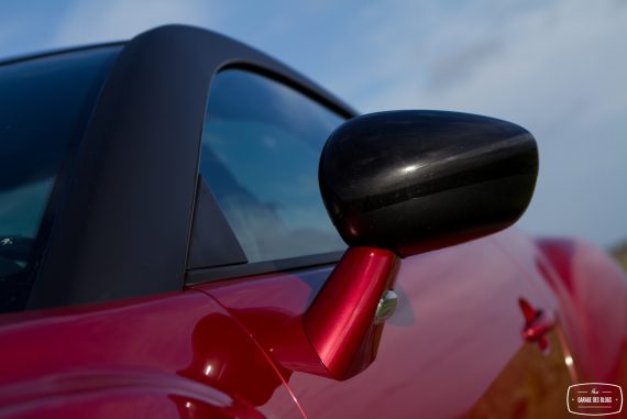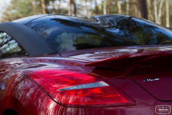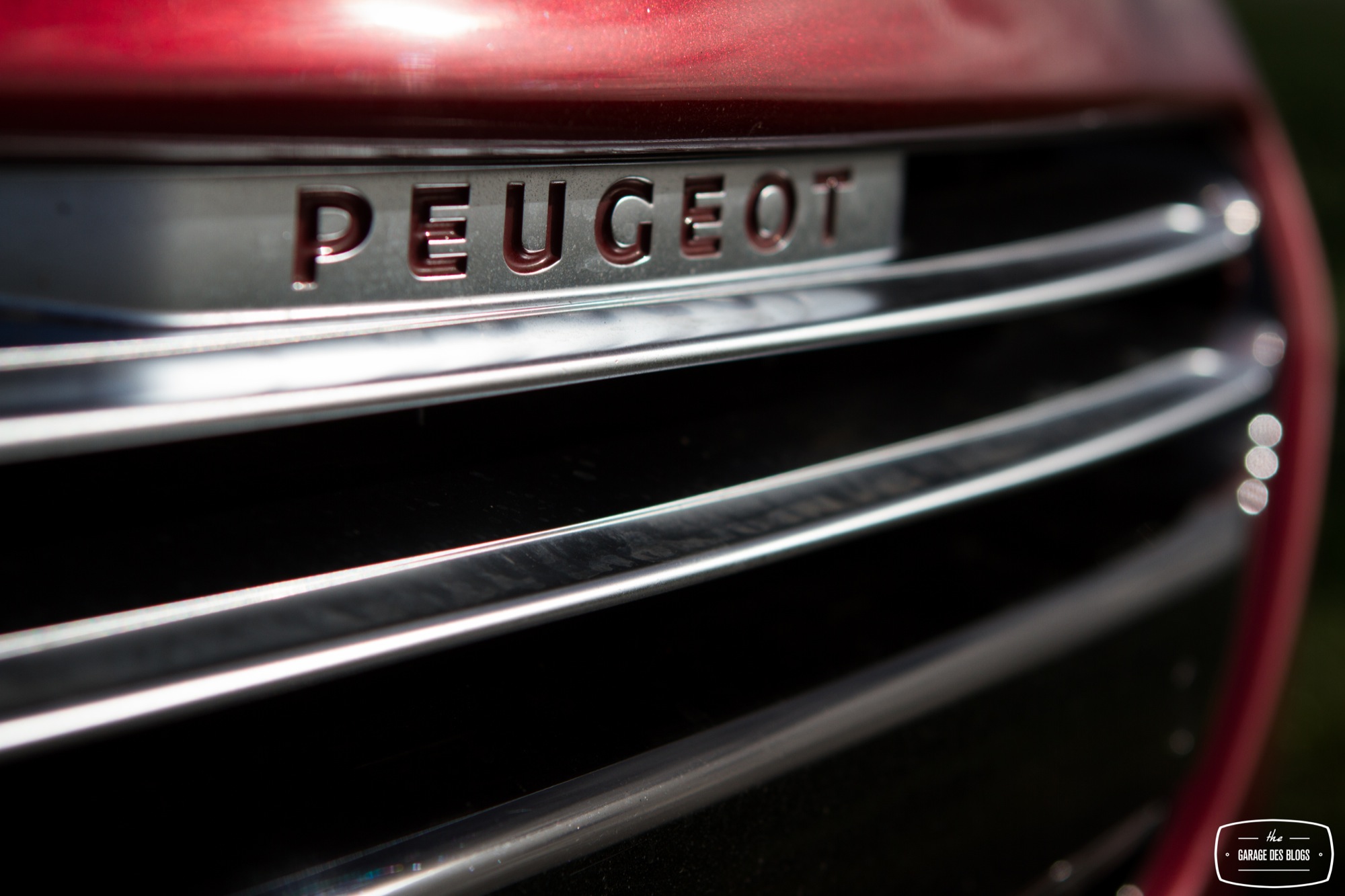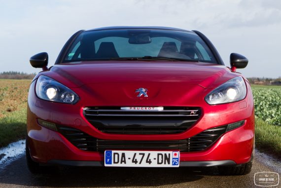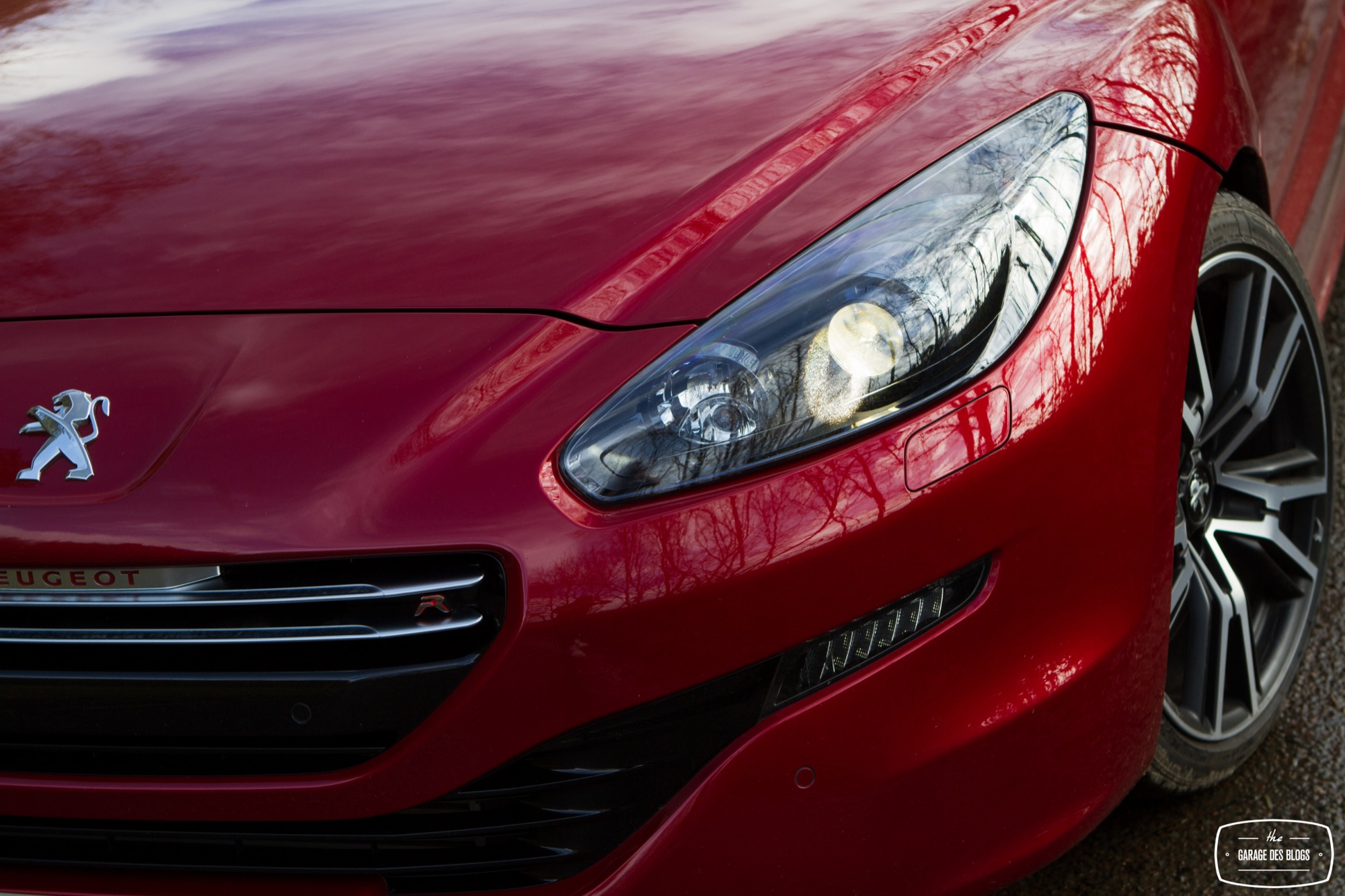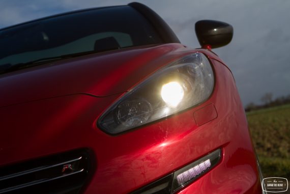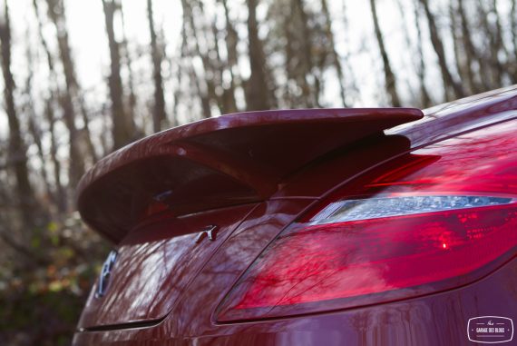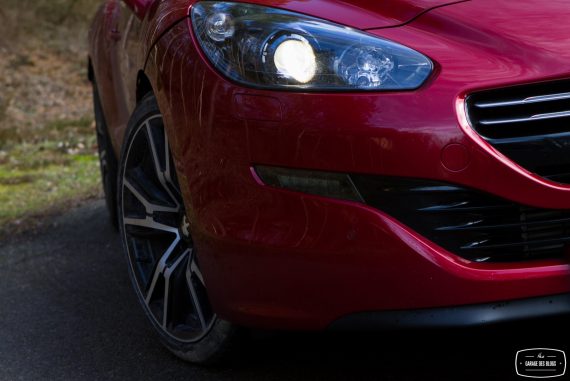 Attardons nous à l’extérieur avant de pénétrer dans l’habitacle et de démarrer ce moulin fort prometteur. Le toit est toujours là, galbé, vitré, magnifique. La ligne générale n’a pas changé non plus, gardant un vrai dynamisme malgré un âge conséquent en cette époque de “toujours du nouveau” automobile. En revanche, le facelift est bien passé par là et a fait un bien fou à cette voiture, l’affranchissant de l’ancien regard Peugeot que je ne supporte plus. Voici donc venu le temps de la calandre flottante, des lames chromées, du “Peugeot” intégré à cette gueule béante surplombée du logo de la marque. Tiens, un petit R vient également s’intégrer là. Premier indicateur de sportivité tandis que les feux diurnes bien intégrés au bumper sont réussis. Il n’y a pas à dire, ce RCZ-R vu de devant et de 3/4 avant en impose et il est beau.