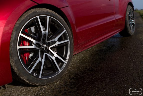 Sur le côté, on note les splendides roues à cinq branches recouvrant les freins et badgées R. A l’avant, on note surtout la présence d’étriers fixes à 4 pistons de couleur rouge là où le RCZ 200ch n’utilisait que des étriers flottants. Surtout, au delà de cette différence technique, ce que l’on remarque, ce sont les disques ! Là où beaucoup de véhicule similaires emploient des disques monobloc en fonte, Peugeot Sport a fait le choix d’appliquer des disques composites à bol aluminium et piste fonte. La thermique n’en sera que meilleure mais aussi et surtout cela permet de gagner un poids certain du côté des masses non suspendues. En clair : Peugeot a fait un choix technique plutôt radical qui augure du très bon pour la suite.