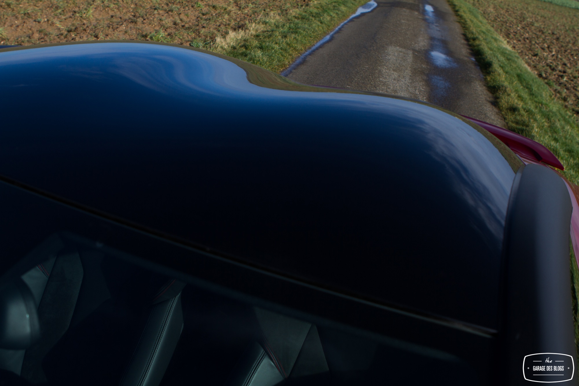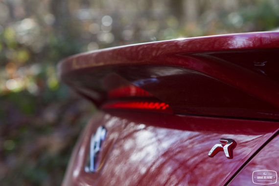 Continuons le tour du propriétaire à l’arrière de la voiture. C’est presque là que les différentes sont les plus flagrantes puisque l’aileron amovible du RCZ se voit transformer en aileron fixe sur ce RCZ-R. La sortie d’échappement devient double et se repartir de part et d’autre du diffuseur. Les ailes s’élargissent un peu et l’ensemble n’en devient que plus musclé et le petit R vu à l’avant se retrouve également ici. Mon regard se perd encore et encore sur le toit… Décidément, celui-ci ne vieillit pas et je le verrais volontiers sur la nouvelle 308. Bon. Trêve de rêve de T95. On monte ?