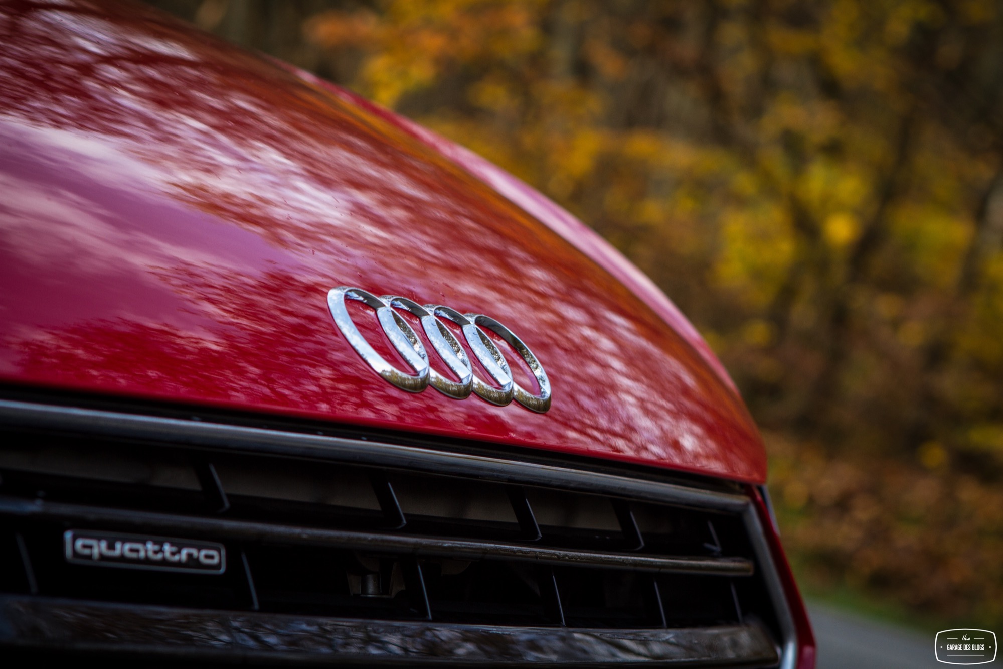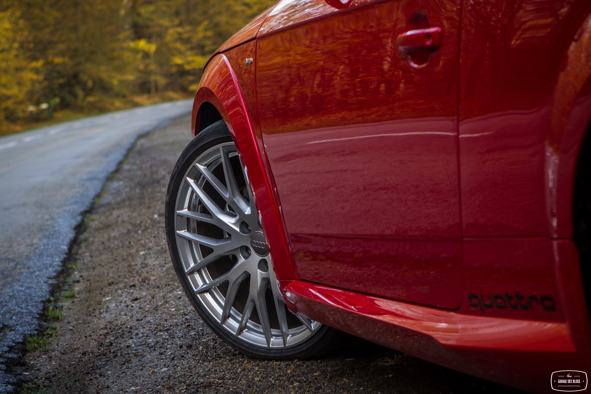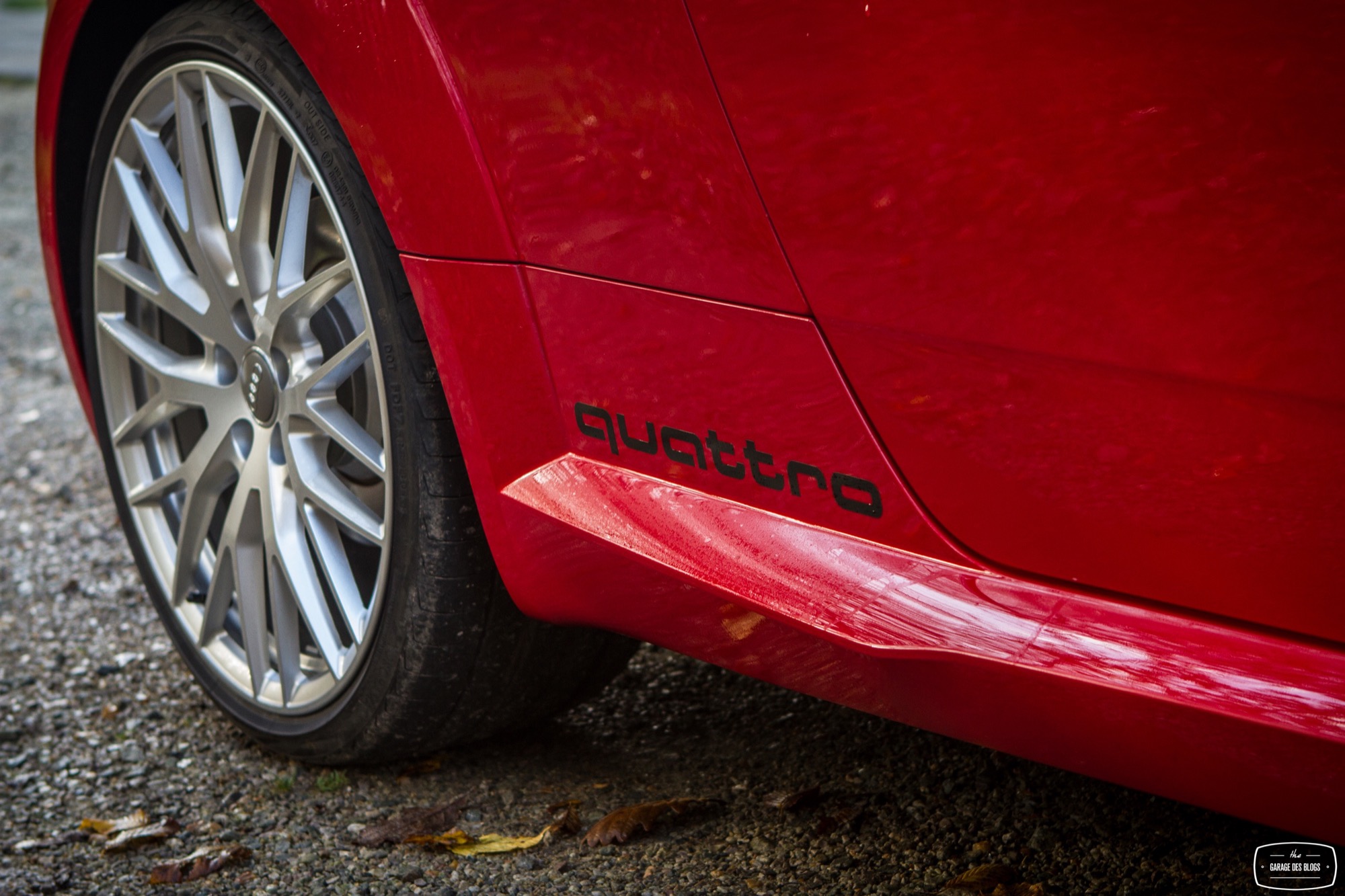 Les quatre anneaux prennent position au centre du nez et on découvre de nouveaux feux de toute beauté surlignés par les traits du capot. On note également les jupes élargies par le pack S, dotées sur mon modèle de petits autocollants quattro optionnels et plutôt jolis. Côté options également, les roues de 20 pouces étaient de sortie avec une monte Yokohama et le design de ces roues est simplement à pleurer, pour plusieurs raisons. D’une, elles sont belles. De deux, elles aiment beaucoup les trottoirs et il faut faire particulièrement attention avec elles ! (pas de bobo à signaler, je précise)