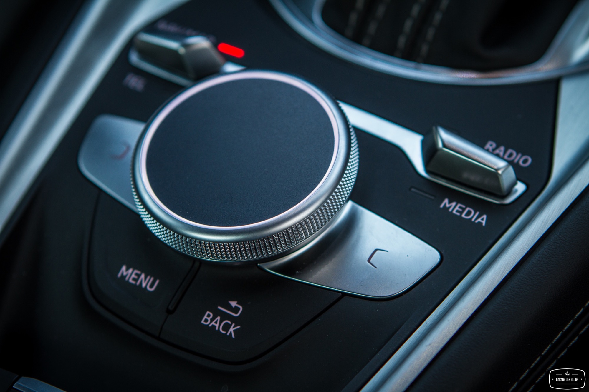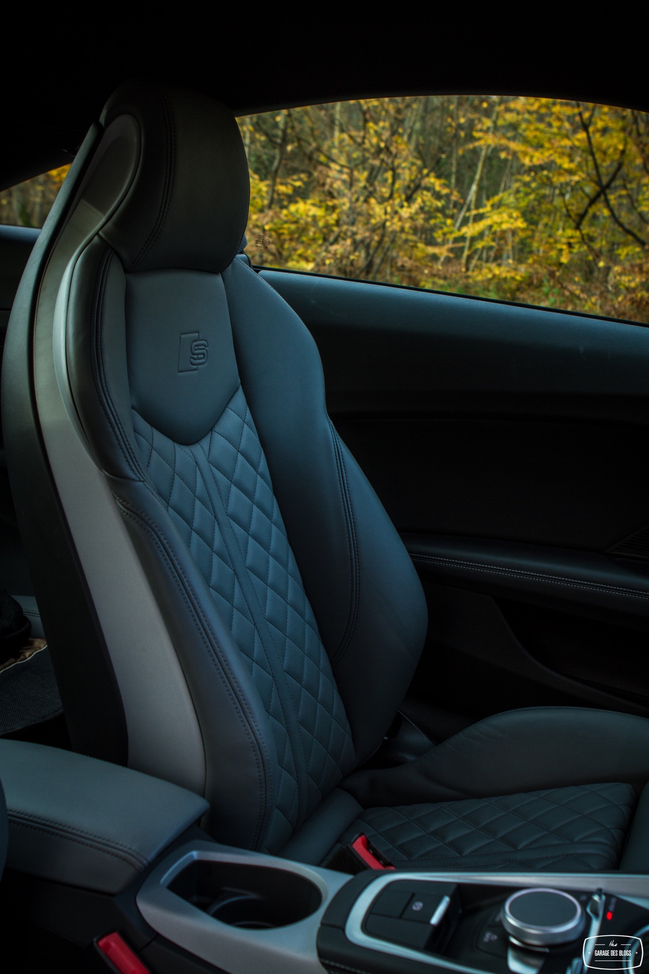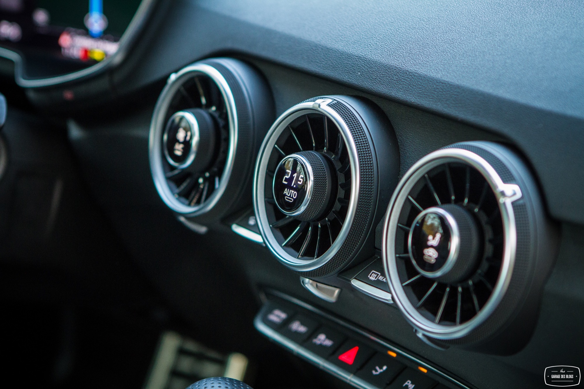 Rentrons un peu dans le détail parce qu’il le faut. Trop de choses qui changent ici pour ne pas en parler ! Je parlais donc des sièges (avec motorisation complète optionnelle) : splendides, offrant un très bon maintien et aux courbes élancées, il n’y a strictement rien à jeter. Le volant reprend les classiques Audi S / RS et il en va de même avec des surpiqûres bien faites et la bonne taille pour une excellente prise en main. Allez, un peu d’alcantara et ça aurait été absolument parfait ! Pour ce qui est du pédalier, rien à signaler non plus. Non, ce qui change vraiment, c’est évidemment le Virtual Cockpit et ses conséquences. Audi a regroupé toutes les commandes et informations dans un seul écran, celui situé derrière le volant. Il en résulte une console centrale épurée et dénuée de beaucoup de boutons. On retrouve simplement les ouïes d’aération, elles aussi compactées. Un petit actionneur situé en dessous permet d’ouvrir le flux, la bague extérieure sert quant à elle à orienter le flux et enfin la bague centrale affiche certaines informations tout en étant cliquable et réglable (température, mode, etc.). C’est intelligent et pratique au quotidien, un vrai bon point puisque la simplification est ici réussie et pragmatique. Même combat pour la rangée de boutons en dessous qui touche au minimalisme : Driving Select, déploiement de l’aileron (bien pour les photos… sinon il se déploie tout seul à 120 et se replie à 80), ESP, warnings, capteurs de parking et start/stop.