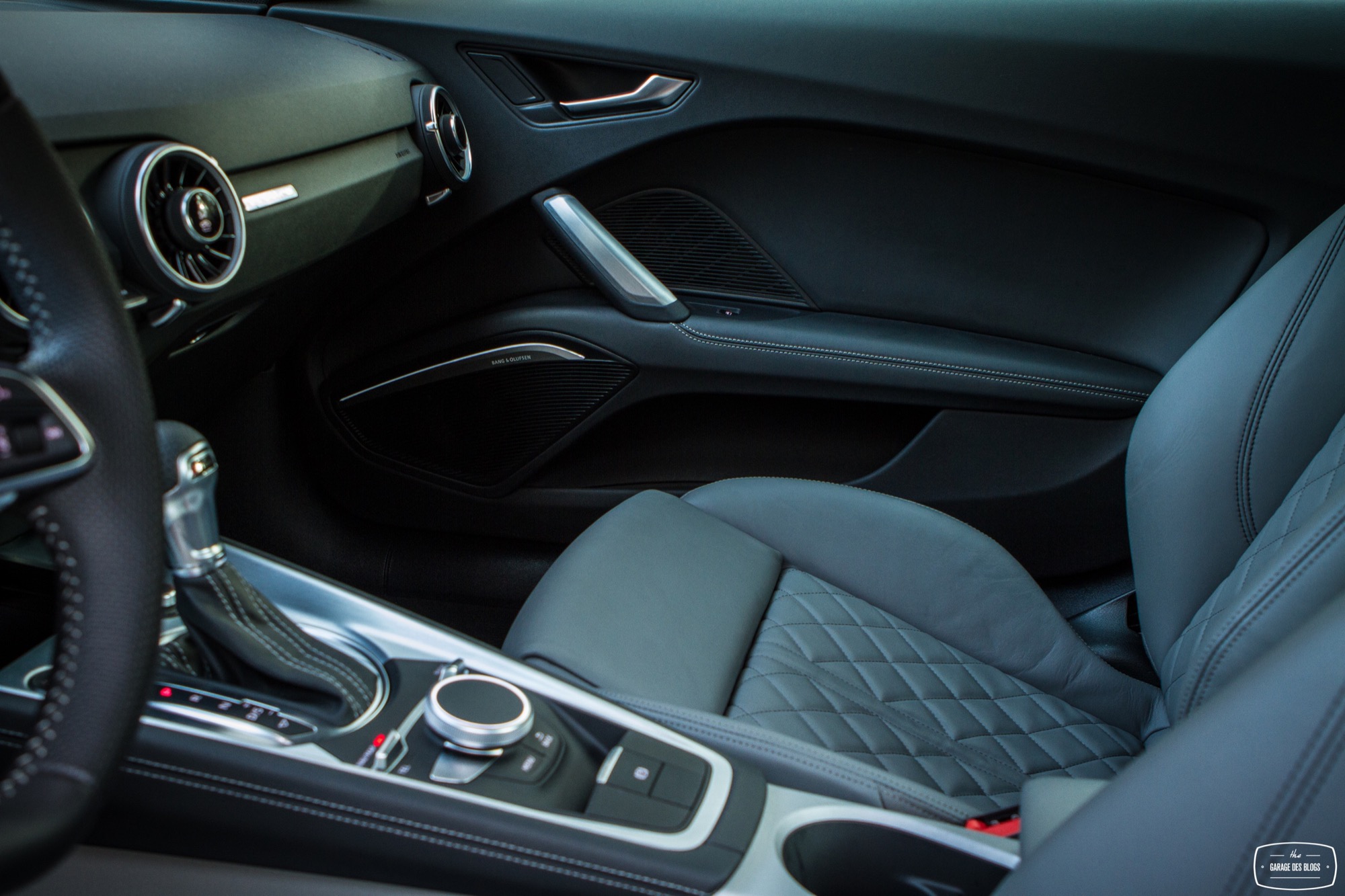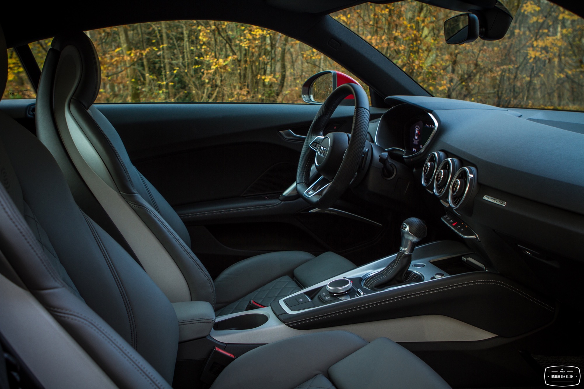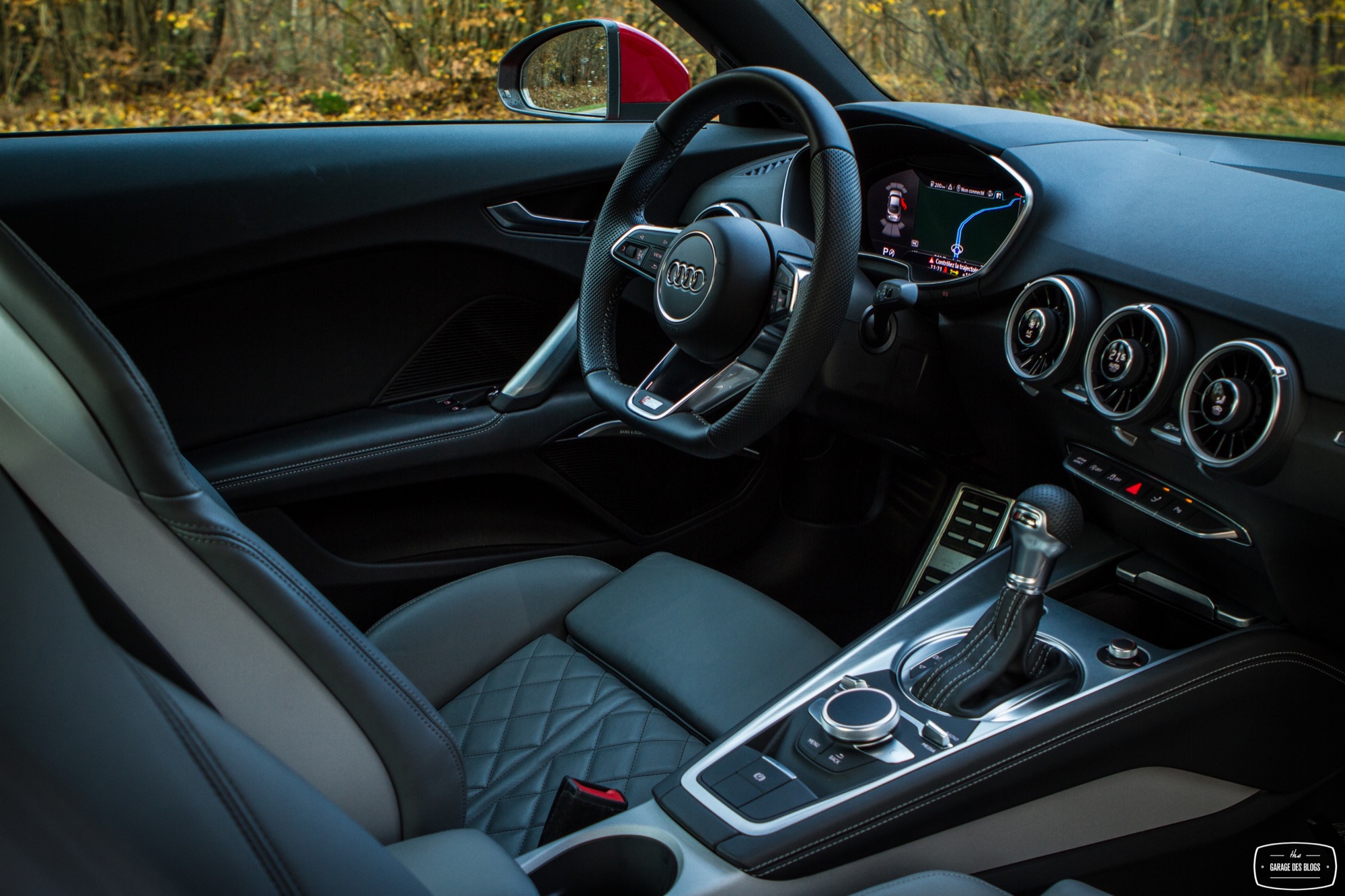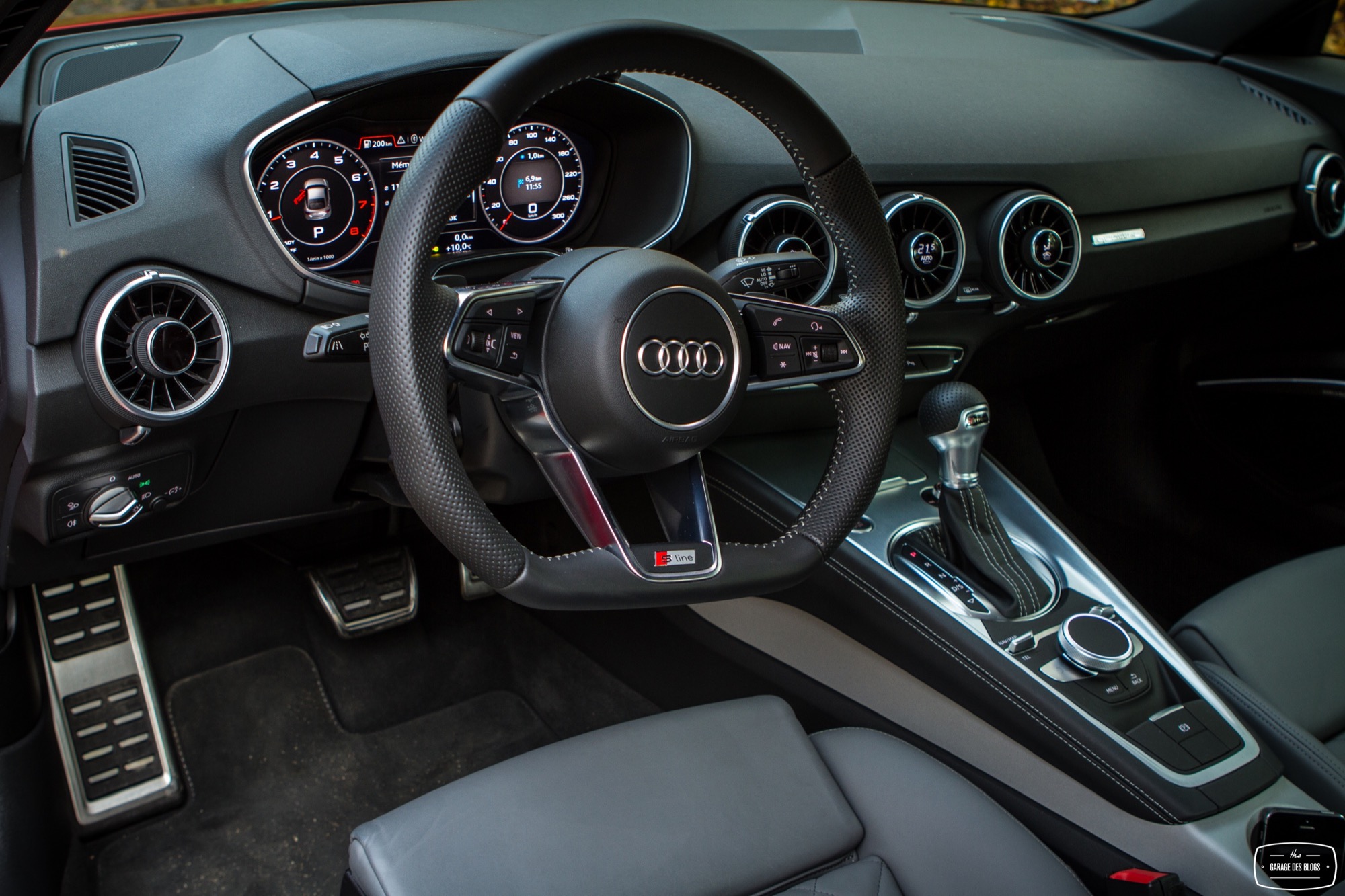On continue le tour du propriétaire à l’intérieur. J’ouvre la portière à la longueur interminable et ma bouche s’ouvre toute seule. L’intérieur est splendide. Parfait. Sièges gris siglés S de toute beauté, plastiques et cuirs de qualité irréprochable, volant S line à la jante et au méplat parfaits, Virtual Cockpit et nouvelles ouïes d’aération, console centrale épurée et tunnel de transmission bien fait. Il y a beaucoup de nouveautés dans ce TT qui marque indubitablement un nouveau saut en terme de qualité et de vie à bord par rapport aux autres modèles du constructeur. Audi a repensé tout le rapport automobile / conducteur et cela se voit.