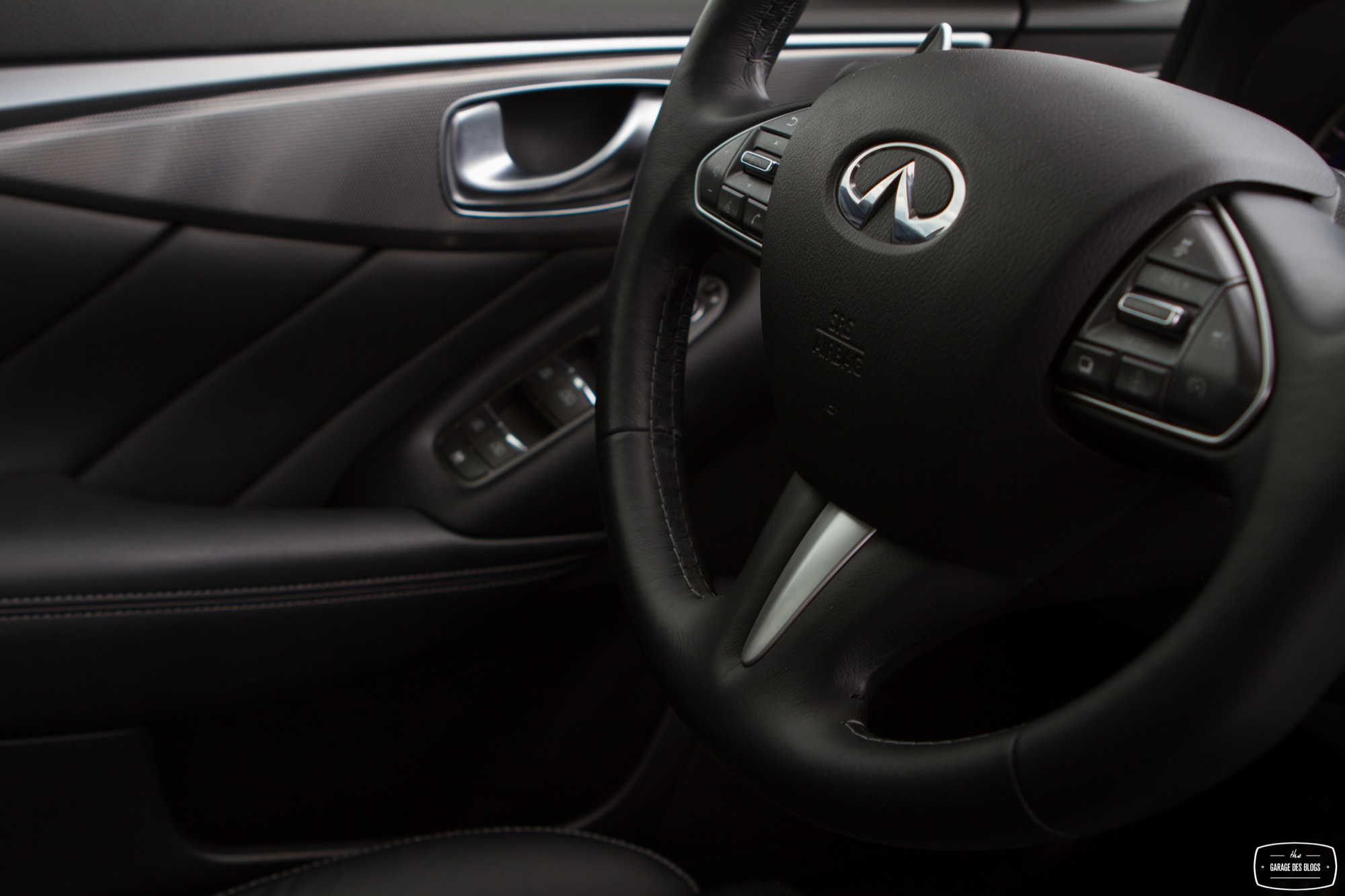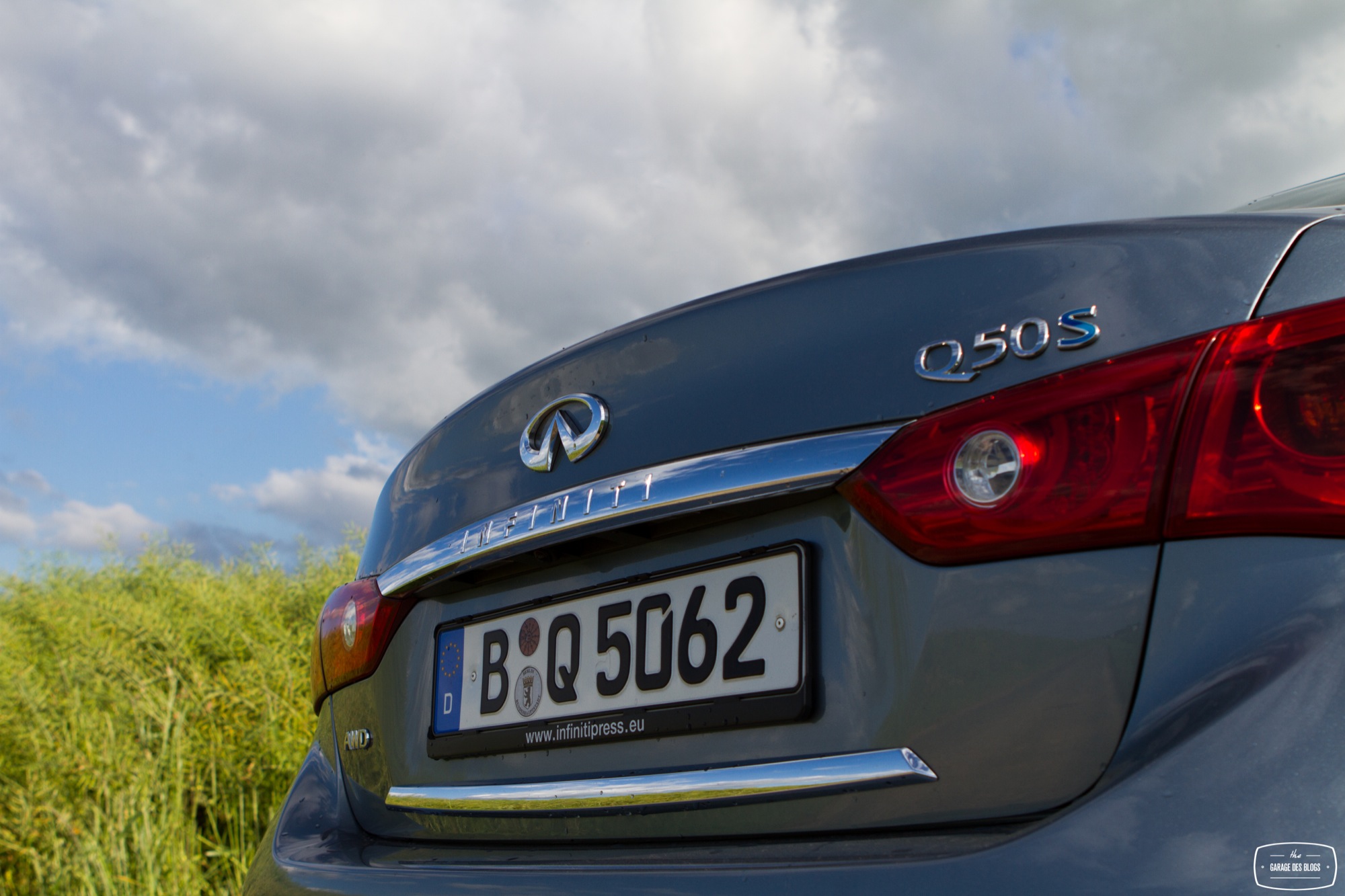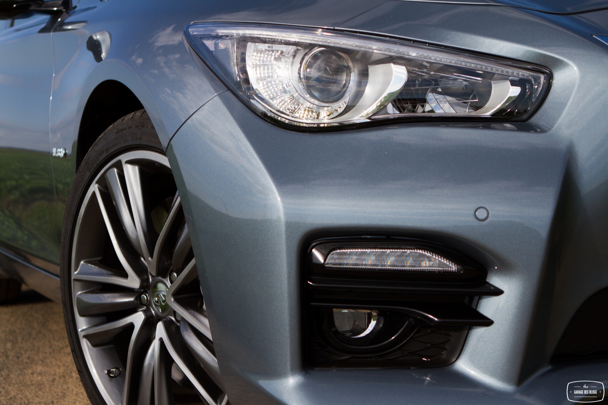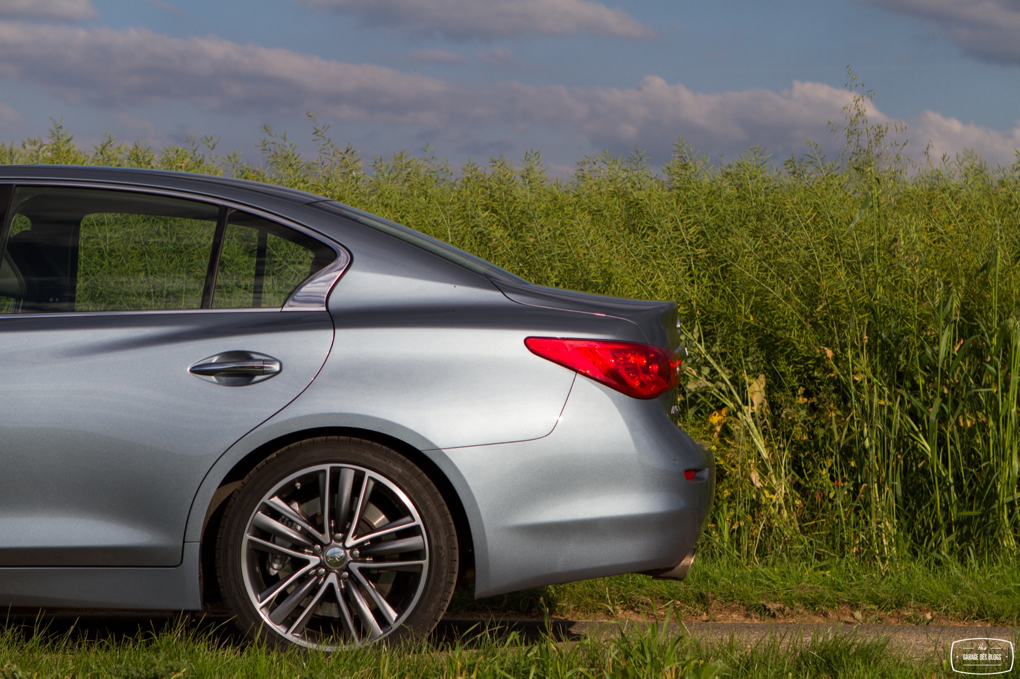 Commençons par la revue esthétique extérieure. Cette version Q50S adopte de splendides roues mais méfiance, elles ont l’air de bien aimer les trottoirs ! La ligne, déjà dynamique, bénéficie de cette monte grandes roues / pneus taille basse et le profil de la voiture s’en sort plutôt bien. Il faut dire que sur ce segment, les lignes sont souvent classiques et sans grande audace. Même si les choses changent peu à peu avec la nouvelle Classe C par exemple, l’Infiniti se démarque du reste de la production japonaise et se colle aux allemandes les plus réussies. Flancs travaillés, belles coques de rétroviseurs et lignes tendues, j’ai apprécié ce profil. Avec le même niveau de réussite, la face avant se montre agressive et très travaillées. Les feux de jours et antibrouillards se lovent dans de petits inserts du bouclier avant tandis qu’une double ligne de coupe mène à la calandre cerclée de chrome et en nid d’abeille. Le regard est également dynamique et surligné d’un sourcil de lumière, menant au capot bombé qui renferme le V6 atmosphérique. Vraiment, ce profil et cette face avant sont splendides à mes yeux et servent vraiment le discours de la marque quant à l’exclusivité et le caractère du modèle. C’est un peu moins vrai du côté de la malle arrière, très classique et sans grand charme. Dommage.