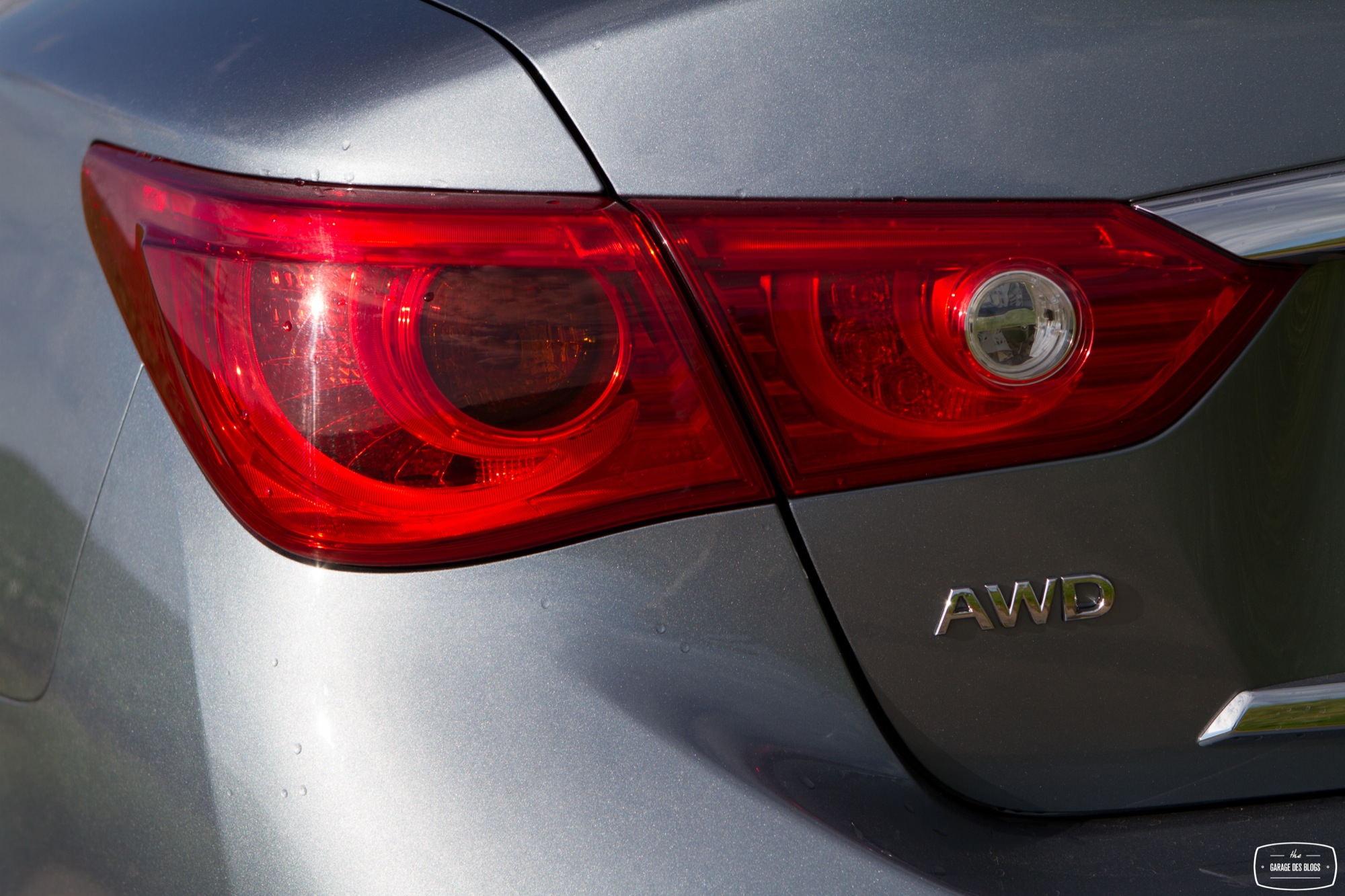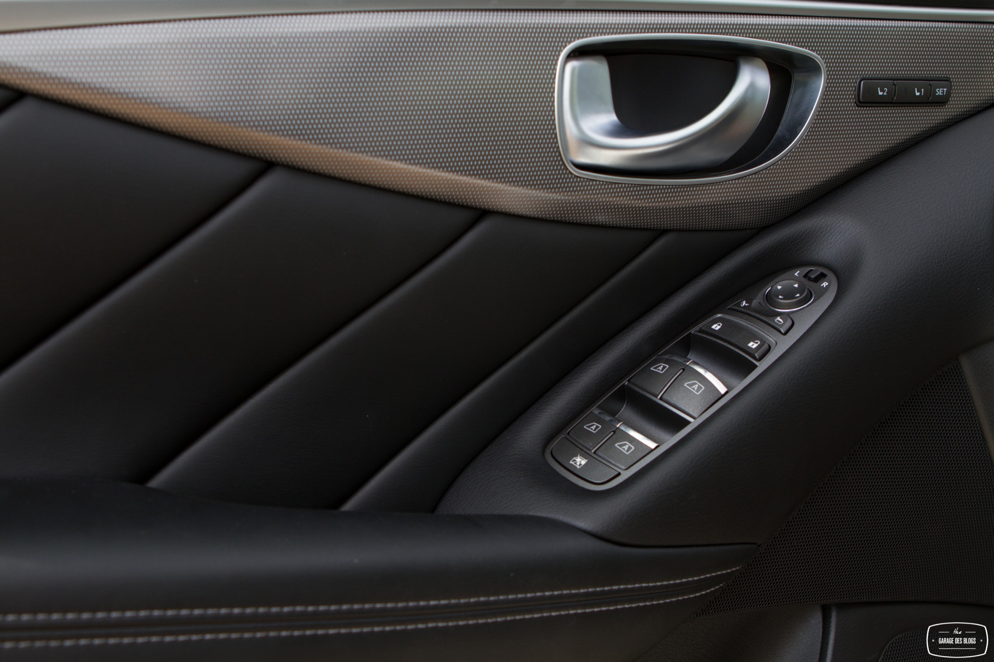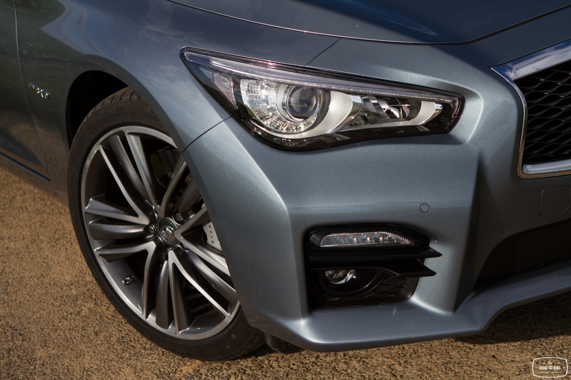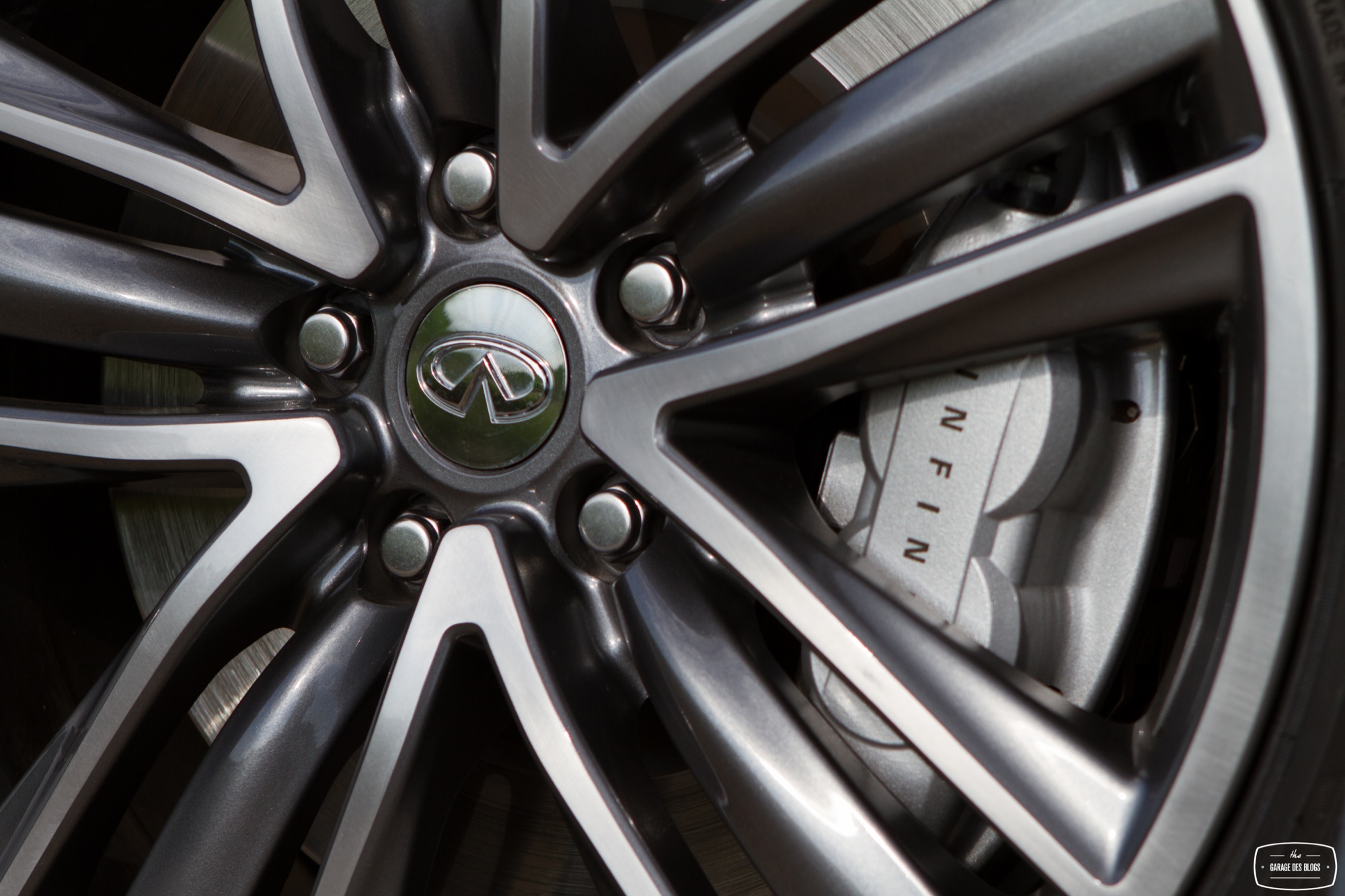 Commençons par la revue esthétique extérieure. Cette version Q50S adopte de splendides roues mais méfiance, elles ont l’air de bien aimer les trottoirs ! La ligne, déjà dynamique, bénéficie de cette monte grandes roues / pneus taille basse et le profil de la voiture s’en sort plutôt bien. Il faut dire que sur ce segment, les lignes sont souvent classiques et sans grande audace. Même si les choses changent peu à peu avec la nouvelle Classe C par exemple, l’Infiniti se démarque du reste de la production japonaise et se colle aux allemandes les plus réussies. Flancs travaillés, belles coques de rétroviseurs et lignes tendues, j’ai apprécié ce profil. Avec le même niveau de réussite, la face avant se montre agressive et très travaillées. Les feux de jours et antibrouillards se lovent dans de petits inserts du bouclier avant tandis qu’une double ligne de coupe mène à la calandre cerclée de chrome et en nid d’abeille. Le regard est également dynamique et surligné d’un sourcil de lumière, menant au capot bombé qui renferme le V6 atmosphérique. Vraiment, ce profil et cette face avant sont splendides à mes yeux et servent vraiment le discours de la marque quant à l’exclusivité et le caractère du modèle. C’est un peu moins vrai du côté de la malle arrière, très classique et sans grand charme. Dommage.