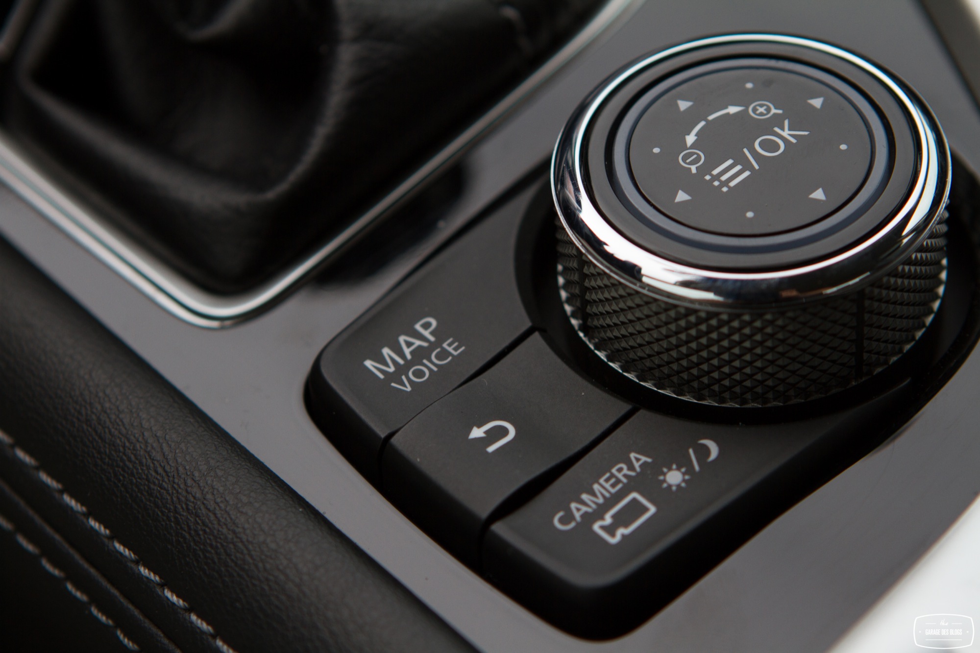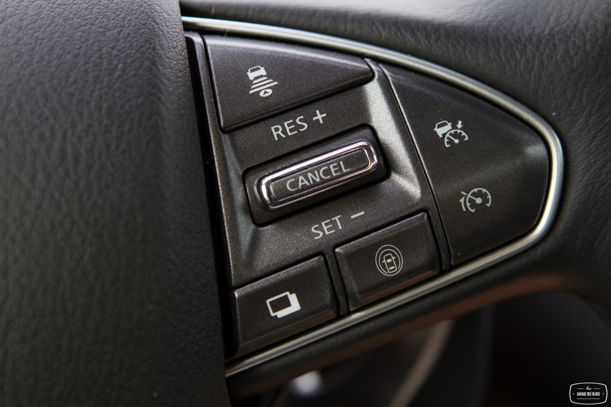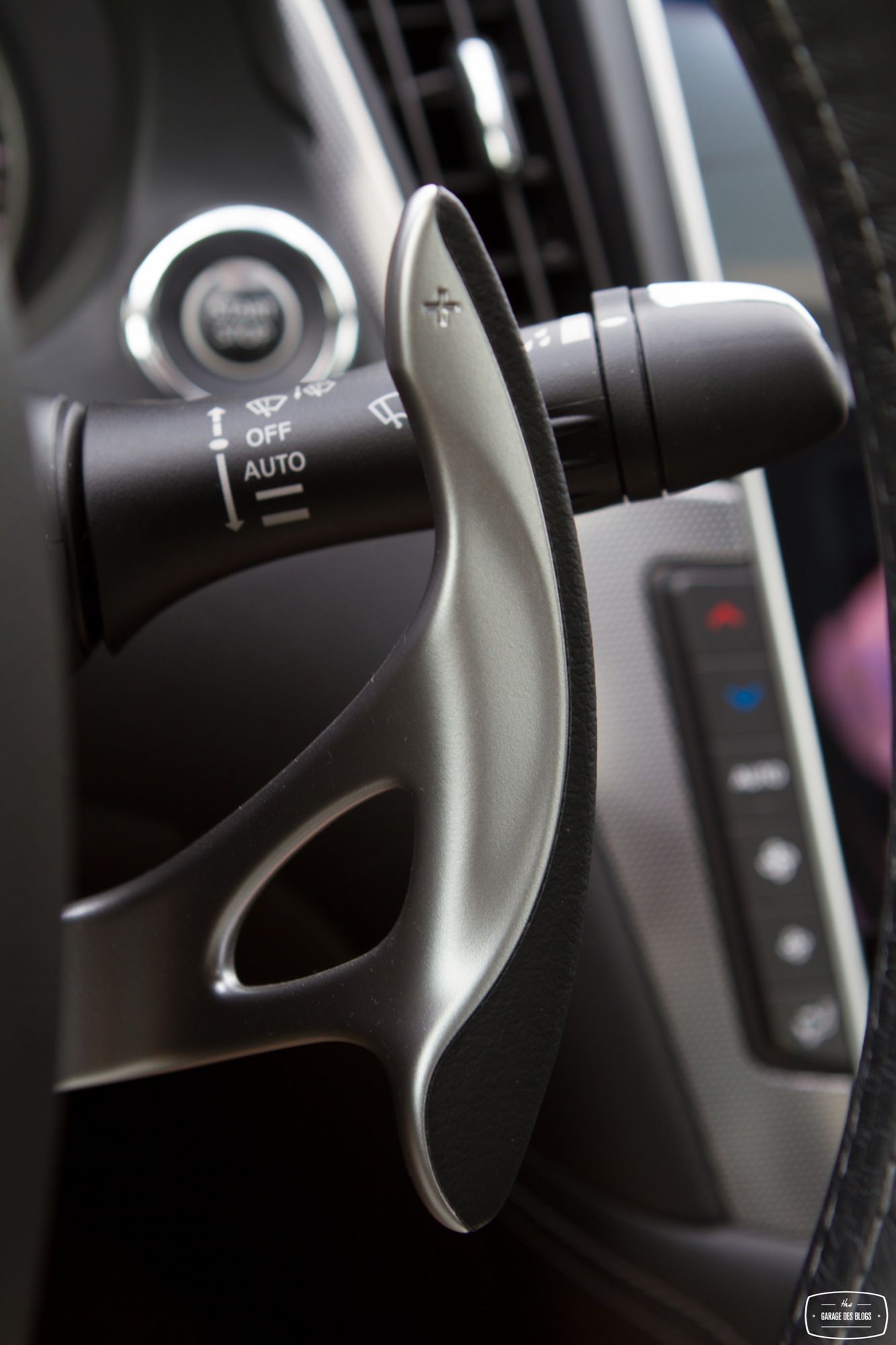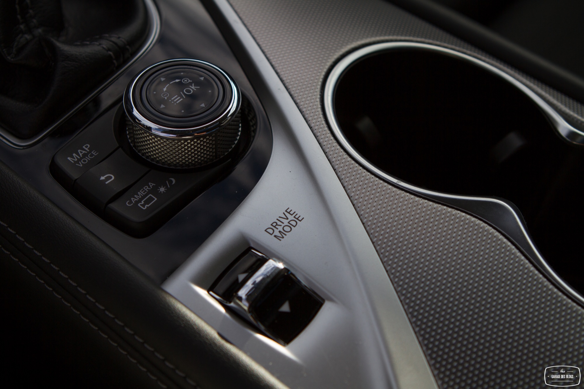 Continuons avec le volant et la console centrale, également remarquables. Le premier s’avère assez classique et les boutons qui l’équipent sont certes complets mais auraient peut-être mérité un plastique d’encore meilleure facture. Rien à dire en revanche sur la jante, fine et tenant bien en main, même si un méplat aurait bienvenu. On note également les palettes de changement de rapports de boîte, reconnaissables car empruntées au GT-R. On a vu pire, comme banque d’organes ! Les comodos situés derrière le volant sont en revanche du genre moche mais sont bien rattrapés par le combiné de compteurs et informations, complet et agréable à l’œil.