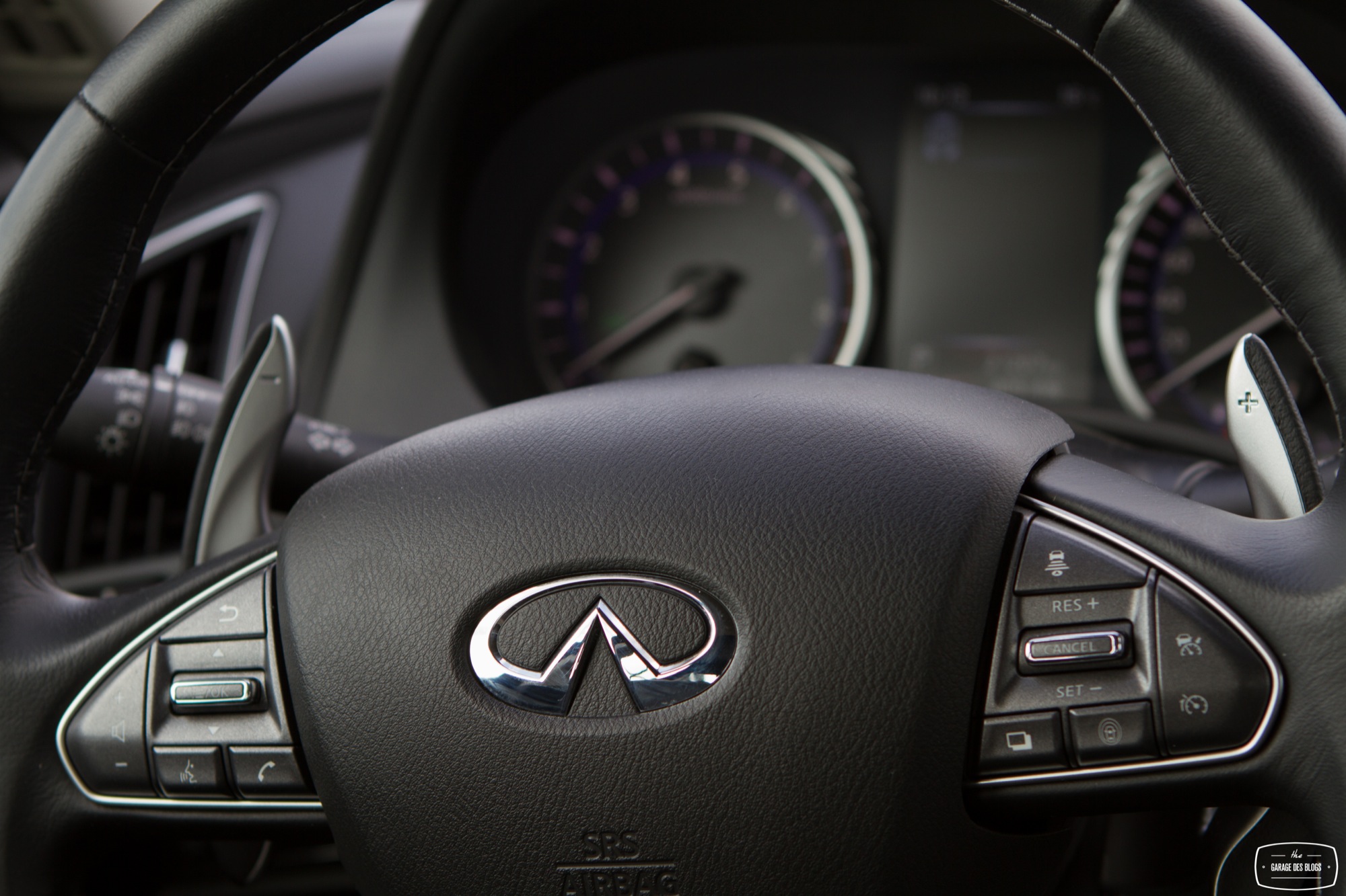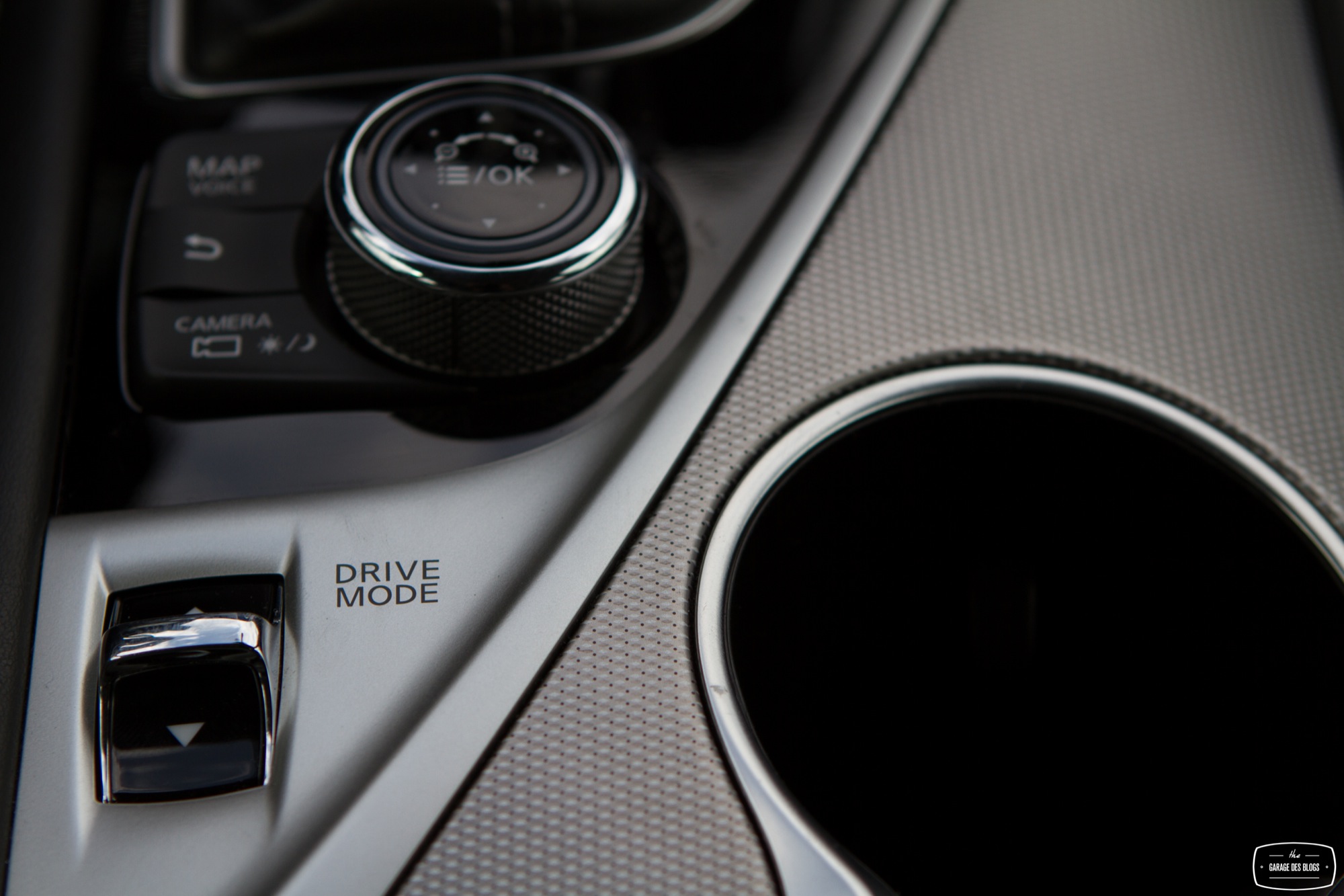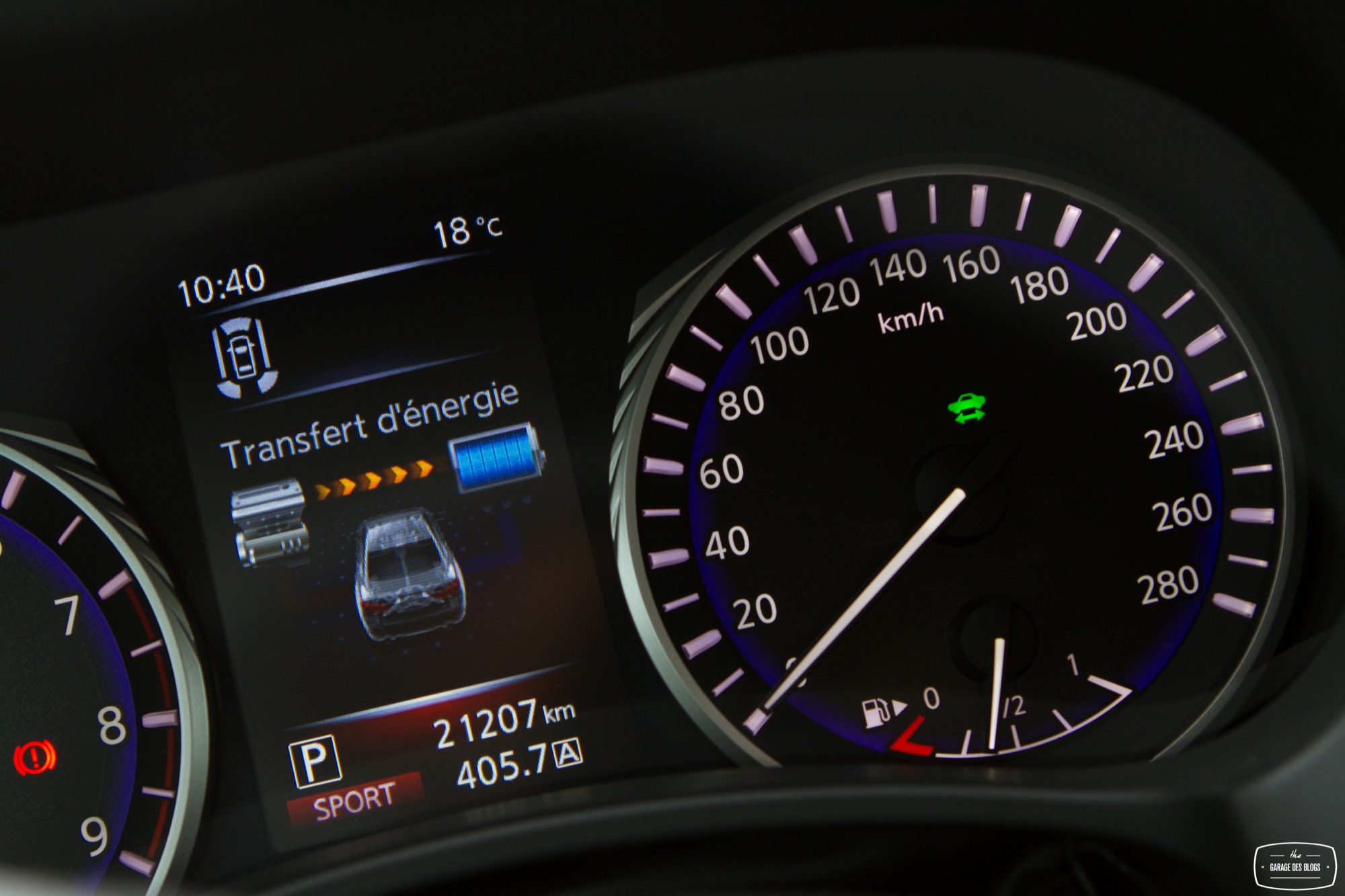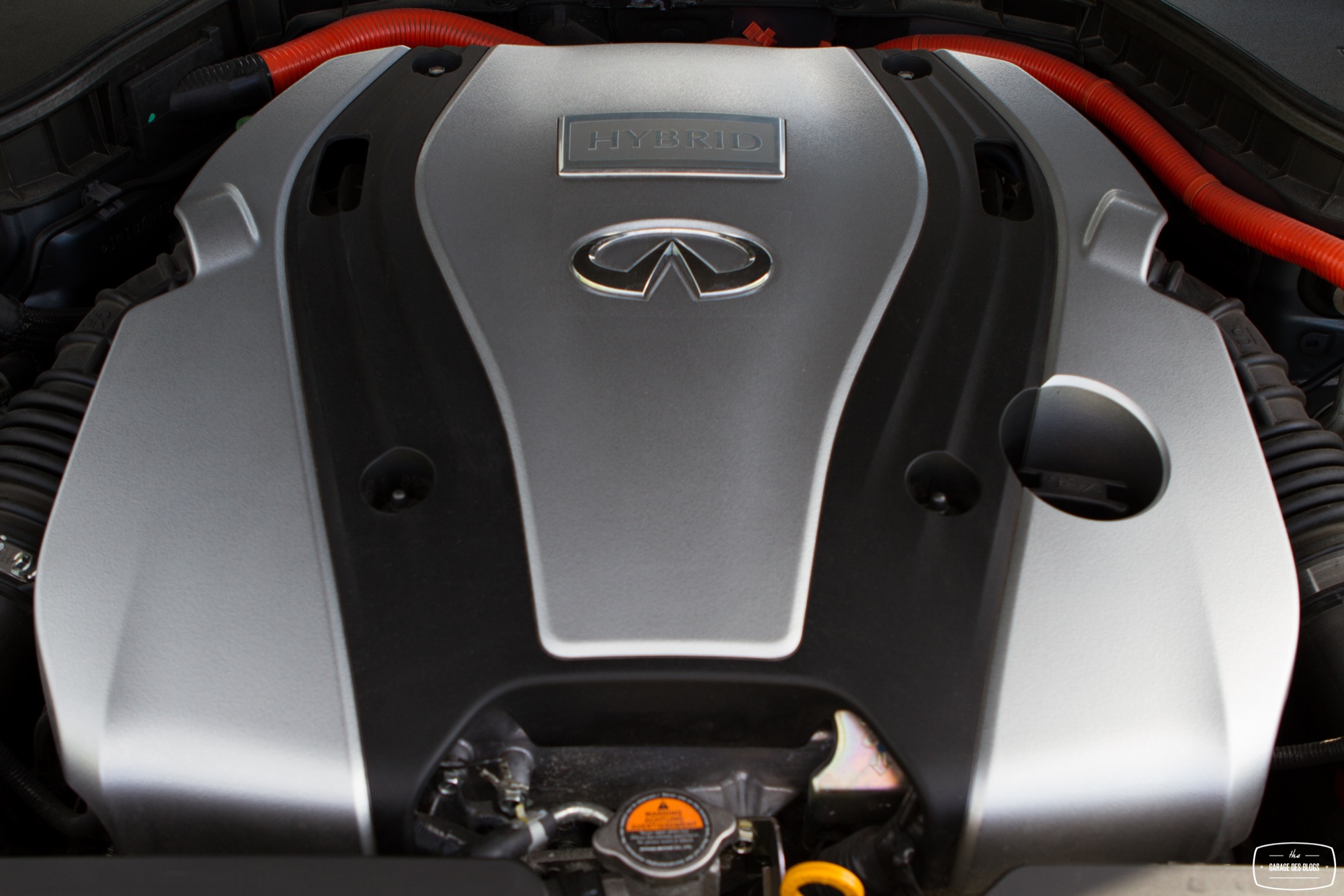 Passons à la conduite puisque la revue de détails extérieurs et intérieurs est terminée ! Il y a à la fois très peu et énormément à dire sur cette voiture. Ce n’est pas une surprise si je vous dis que la voiture se comporte bien, qu’elle est très saine et qu’elle s’avère être une très bonne synthèse dynamisme / confort. Je n’en attendais pas moins d’Infiniti et je n’ai pas été déçu. La suspension est remarquable en modes Confort, Standard et Sport, filtrant très bien les imperfections de la route malgré les grandes roues typée “sport”. Le train avant s’inscrit très bien en courbe malgré l’enclume à six cylindres installée au milieu du capot et le freinage est plus qu’au niveau des performances et vitesses atteintes grâce à la combinaison du V6 et du moteur électrique. Ce n’est bien évidemment pas une sportive mais c’est une voiture très dynamique en ligne droite comme en courbes.