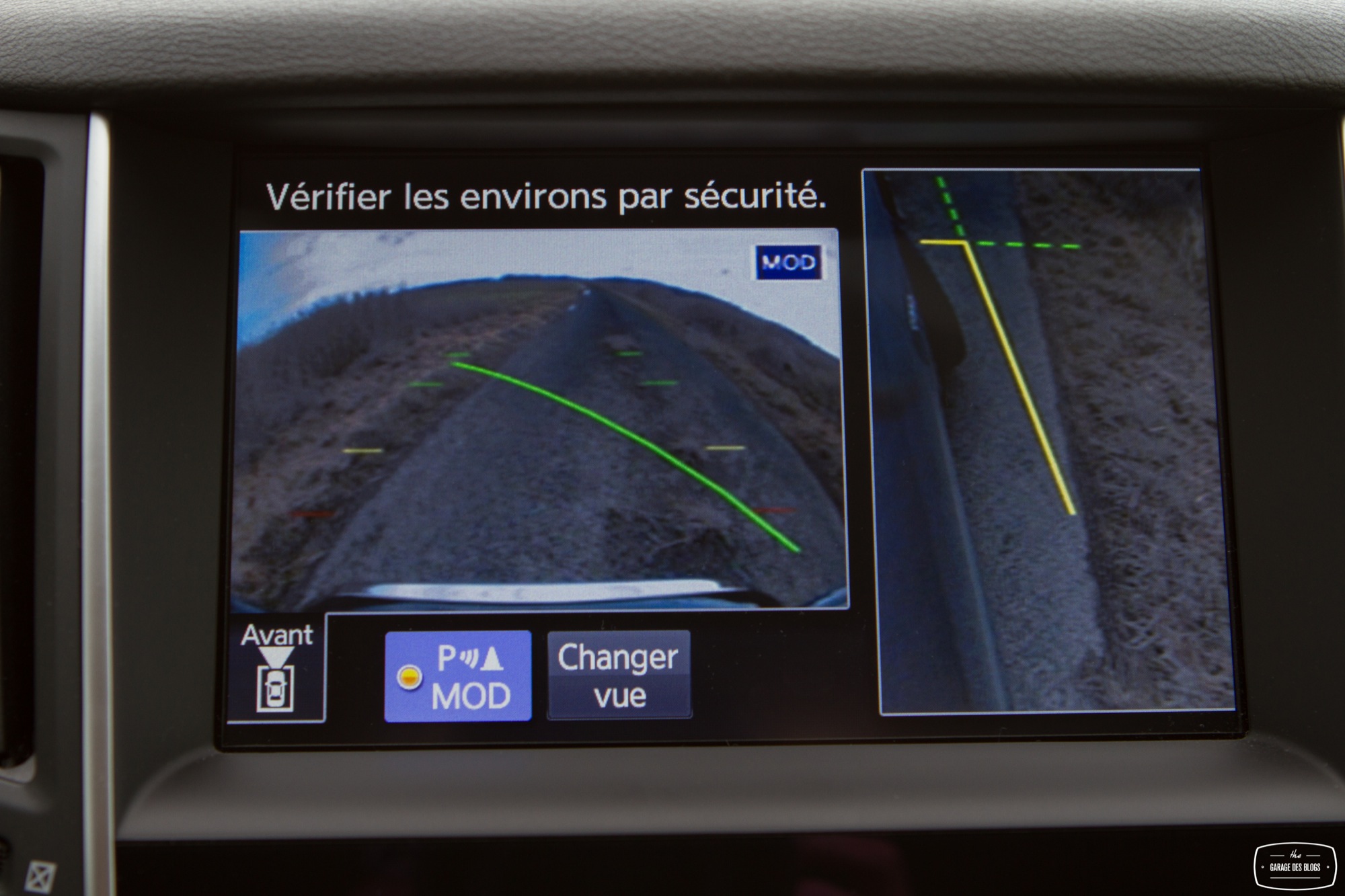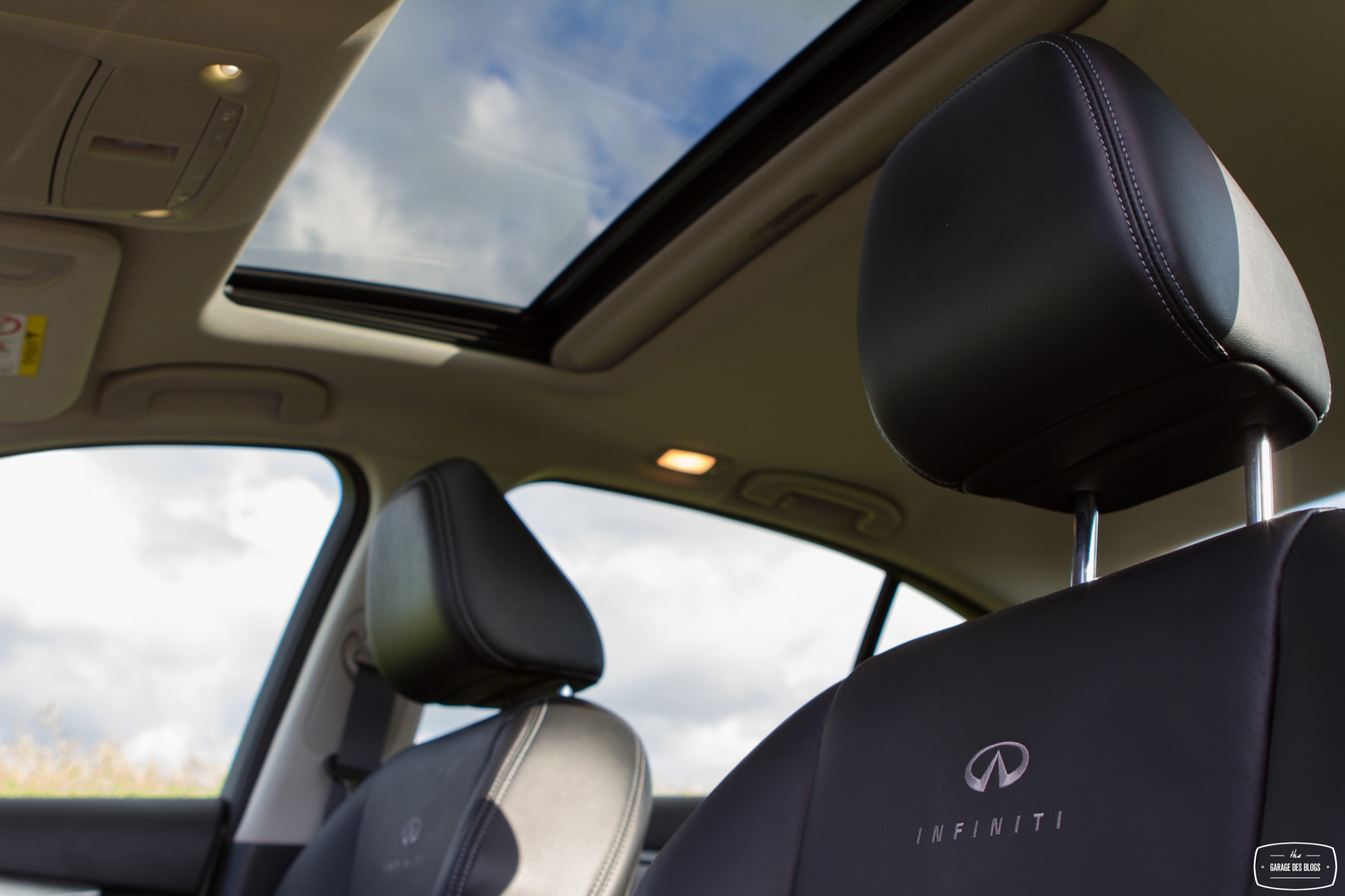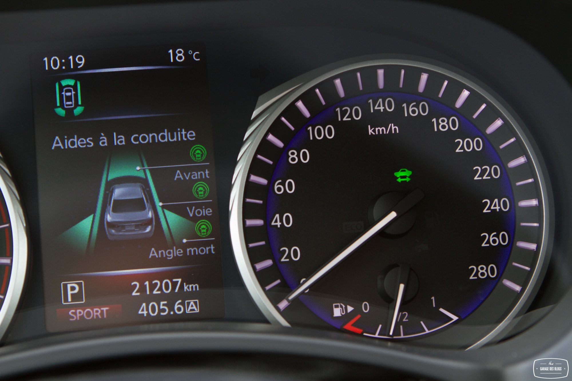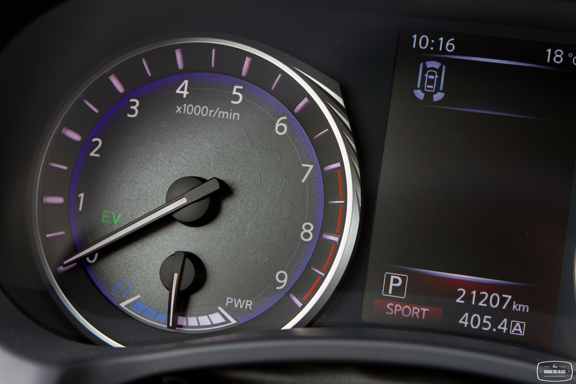 Passons à la conduite puisque la revue de détails extérieurs et intérieurs est terminée ! Il y a à la fois très peu et énormément à dire sur cette voiture. Ce n’est pas une surprise si je vous dis que la voiture se comporte bien, qu’elle est très saine et qu’elle s’avère être une très bonne synthèse dynamisme / confort. Je n’en attendais pas moins d’Infiniti et je n’ai pas été déçu. La suspension est remarquable en modes Confort, Standard et Sport, filtrant très bien les imperfections de la route malgré les grandes roues typée “sport”. Le train avant s’inscrit très bien en courbe malgré l’enclume à six cylindres installée au milieu du capot et le freinage est plus qu’au niveau des performances et vitesses atteintes grâce à la combinaison du V6 et du moteur électrique. Ce n’est bien évidemment pas une sportive mais c’est une voiture très dynamique en ligne droite comme en courbes.