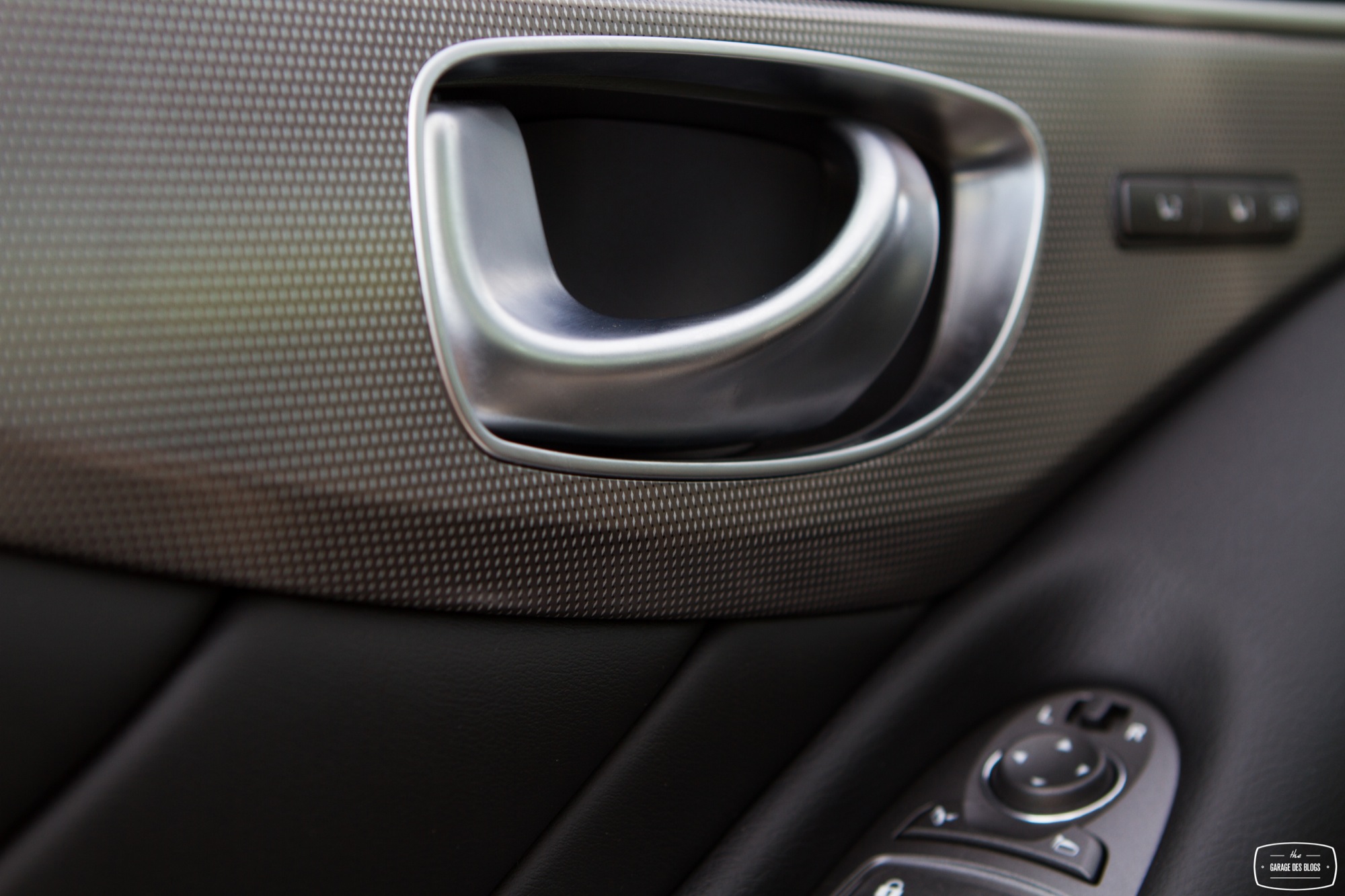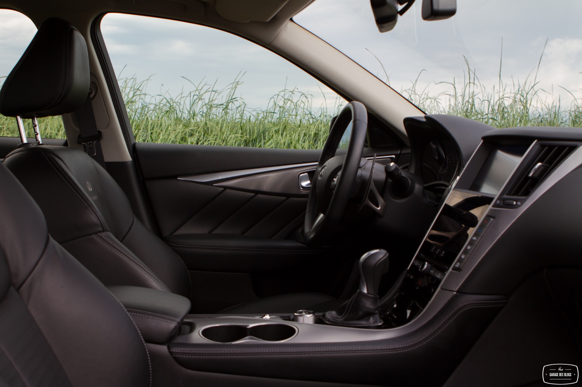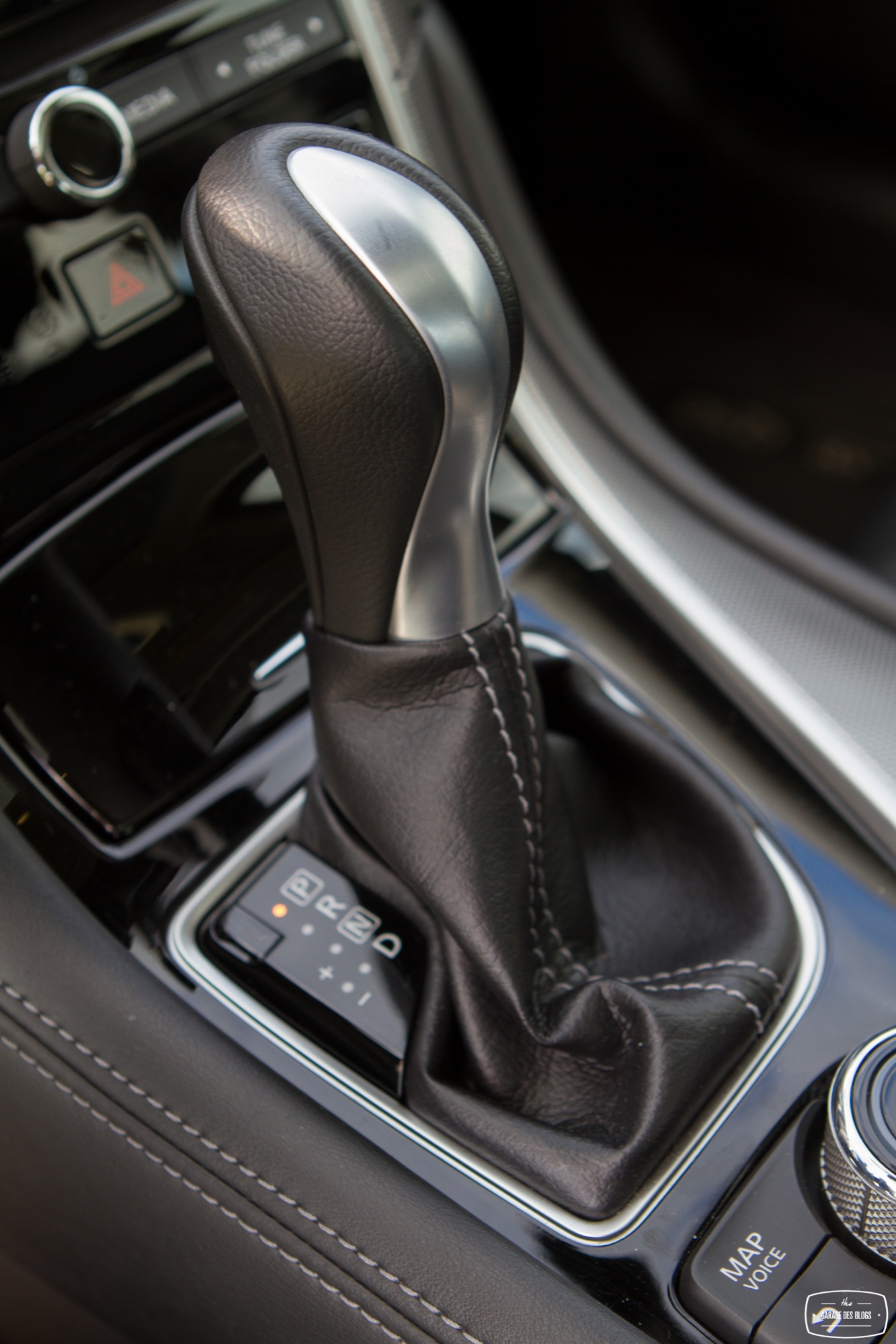 Passons maintenant à l’intérieur… J’avais gardé un mauvais souvenir du FX50S essayé en tournage Garage des Blogs et j’attendais par conséquent beaucoup de ce modèle, vraiment dessiné, conçu et fini par la marque. On quitte donc en belle partie l’univers et les finitions Nissan pour véritablement entrer dans le domaine luxueux d’Infiniti. En finition Sport ici, l’habitacle gagne en qualité perçue, en qualité de matériaux utilisés et en qualité d’assemblages. C’est tout bonnement mieux partout et cette voiture marque donc l’entrée d’Infiniti dans une nouvelle phase de son développement et de sa véritable montée en gamme.