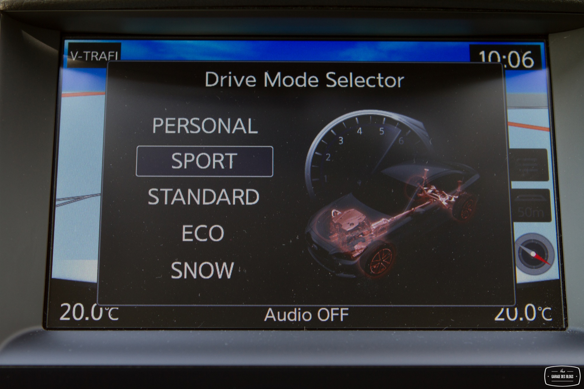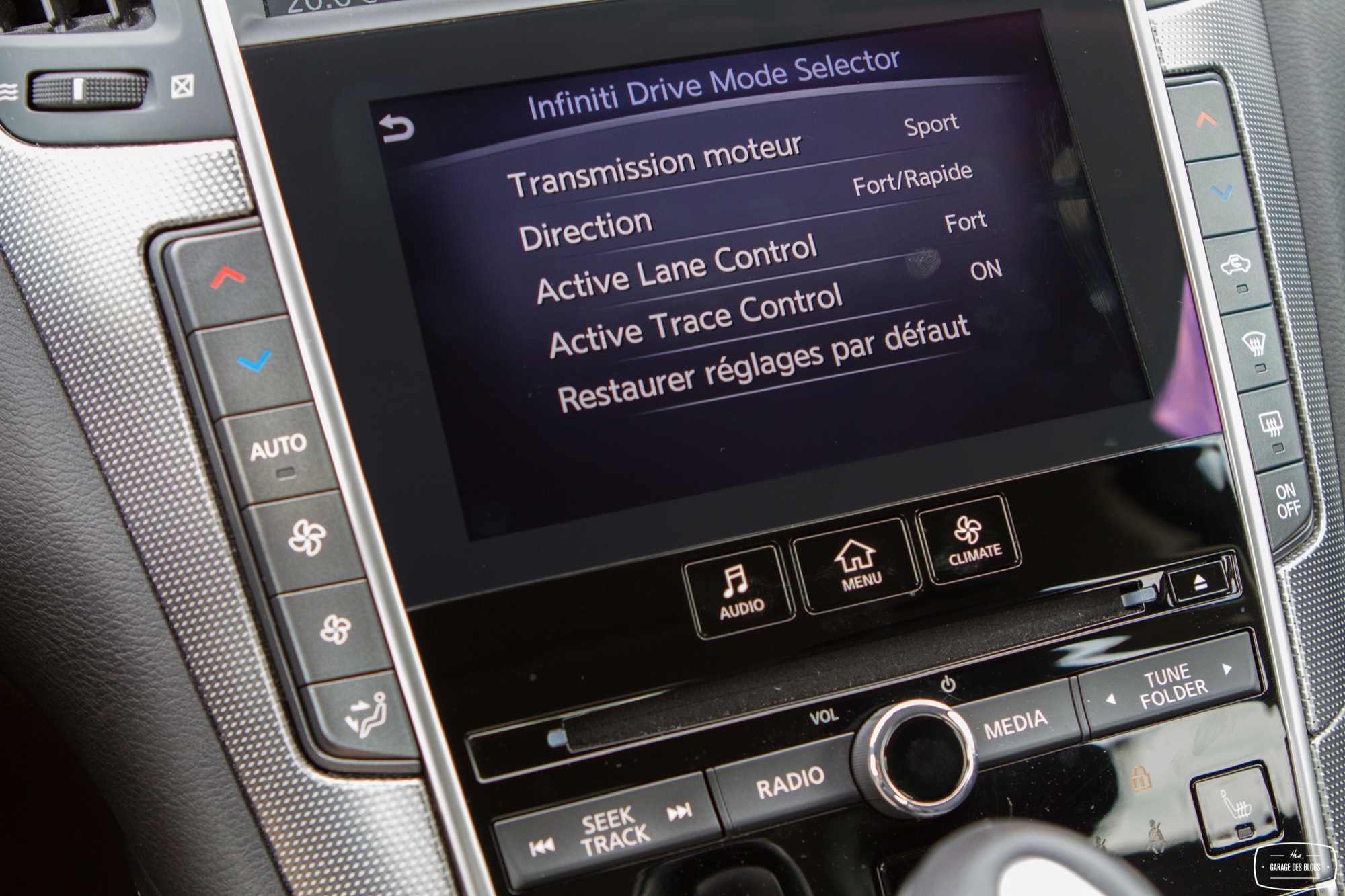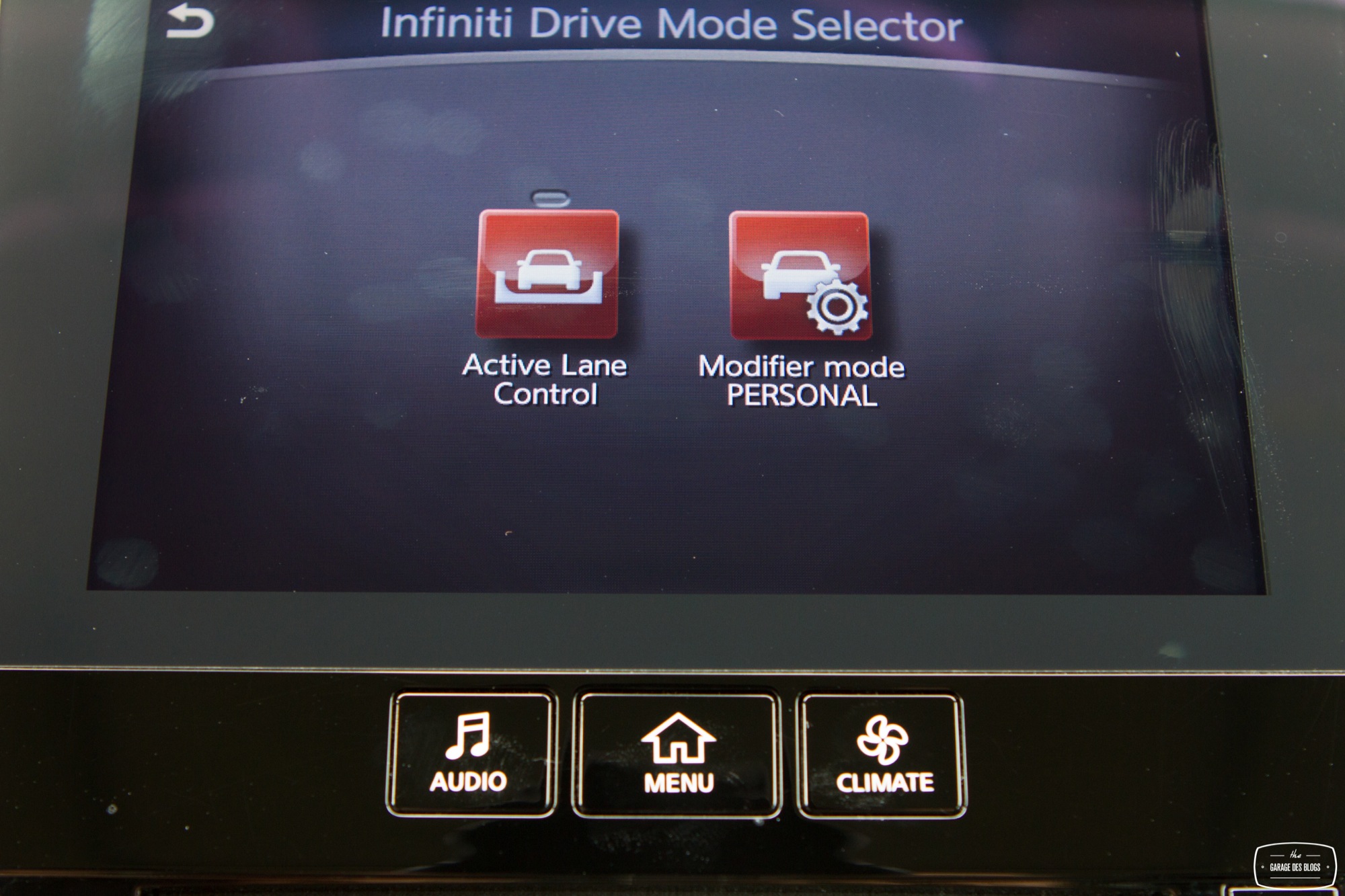 Même combat pour ce qui est de la personnalisation de l’écran puisqu’il est possible de configurer différentes apparences et agencements des applications de l’Infiniti Q50S. Trois boutons sont situés en dessous de l’écran, permettant d’accéder aux fonctions principales de la voiture : climatisation, audio et menu principal qui intègre notamment la partie navigation en base supérieure. On peut ensuite naviguer dans les différents paramétrages et également accéder aux fonctions actives d’aide à la conduire comme l’Active Lane Control ou le paramétrage du mode “Personal”. C’est en réalité le cinquième choix après les modes Sport, Standard, Eco et Snow qui permet de paramétrer la voiture selon sa préférence entre les modes de conduite mais j’aurai l’occasion de rentrer dans le détail plus bas.