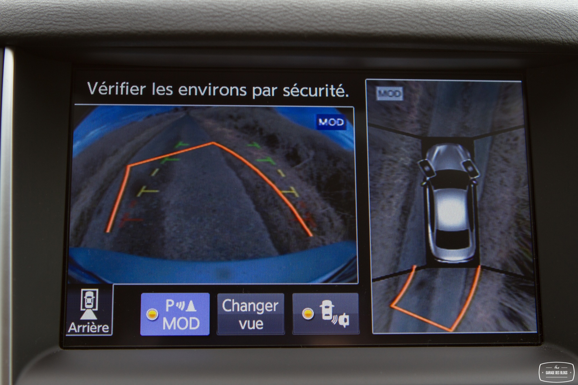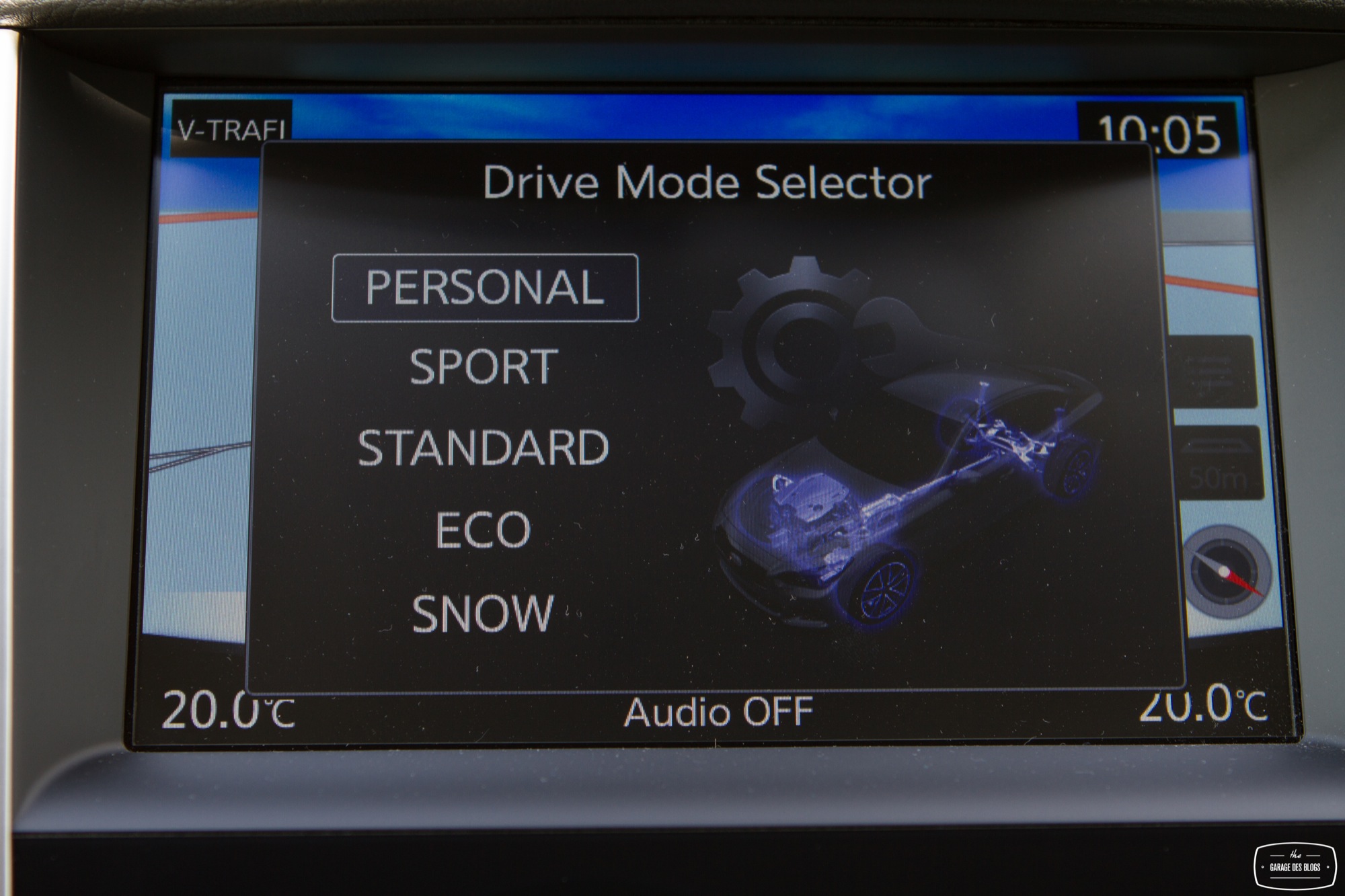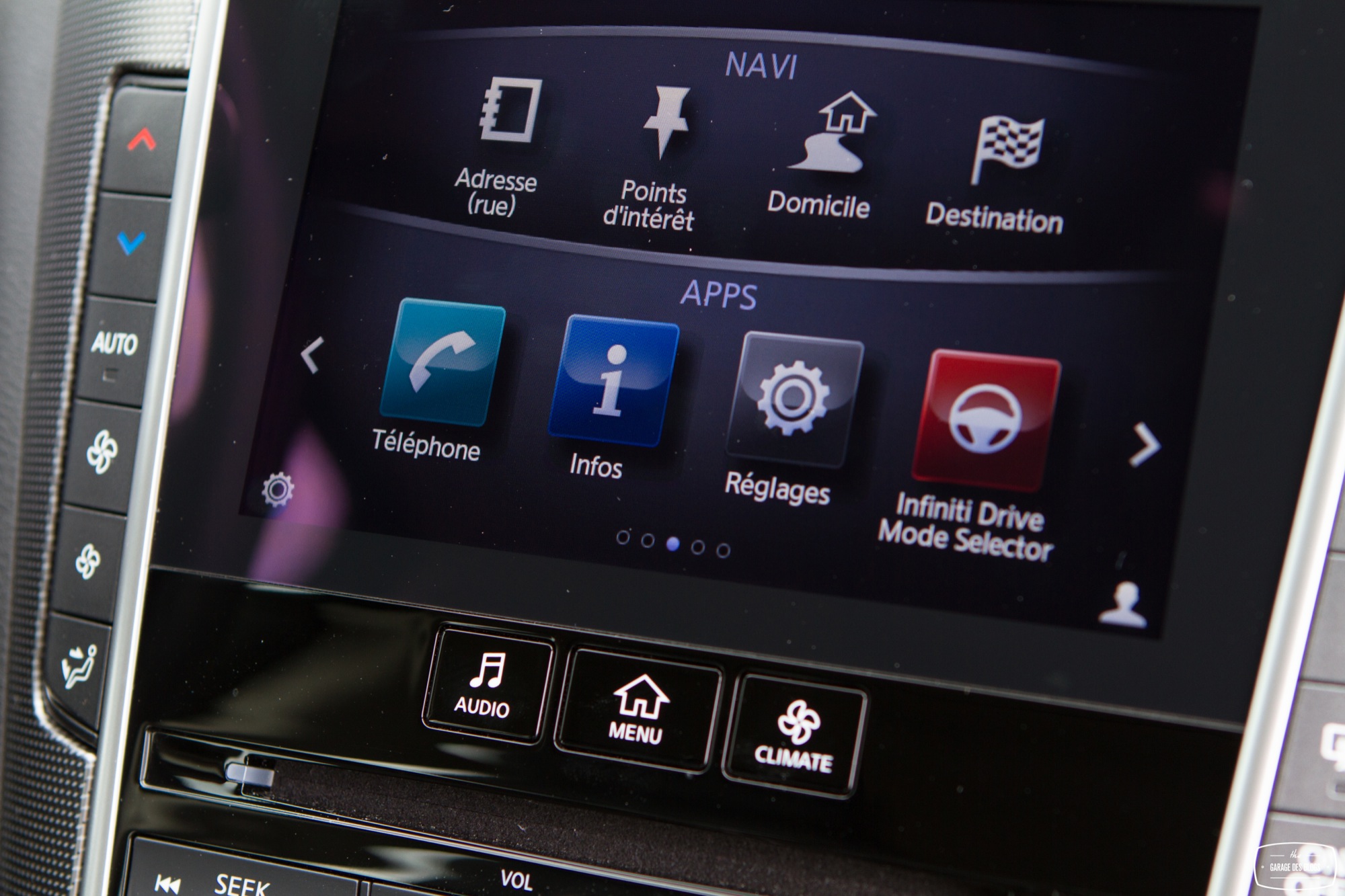 Même combat pour ce qui est de la personnalisation de l’écran puisqu’il est possible de configurer différentes apparences et agencements des applications de l’Infiniti Q50S. Trois boutons sont situés en dessous de l’écran, permettant d’accéder aux fonctions principales de la voiture : climatisation, audio et menu principal qui intègre notamment la partie navigation en base supérieure. On peut ensuite naviguer dans les différents paramétrages et également accéder aux fonctions actives d’aide à la conduire comme l’Active Lane Control ou le paramétrage du mode “Personal”. C’est en réalité le cinquième choix après les modes Sport, Standard, Eco et Snow qui permet de paramétrer la voiture selon sa préférence entre les modes de conduite mais j’aurai l’occasion de rentrer dans le détail plus bas.