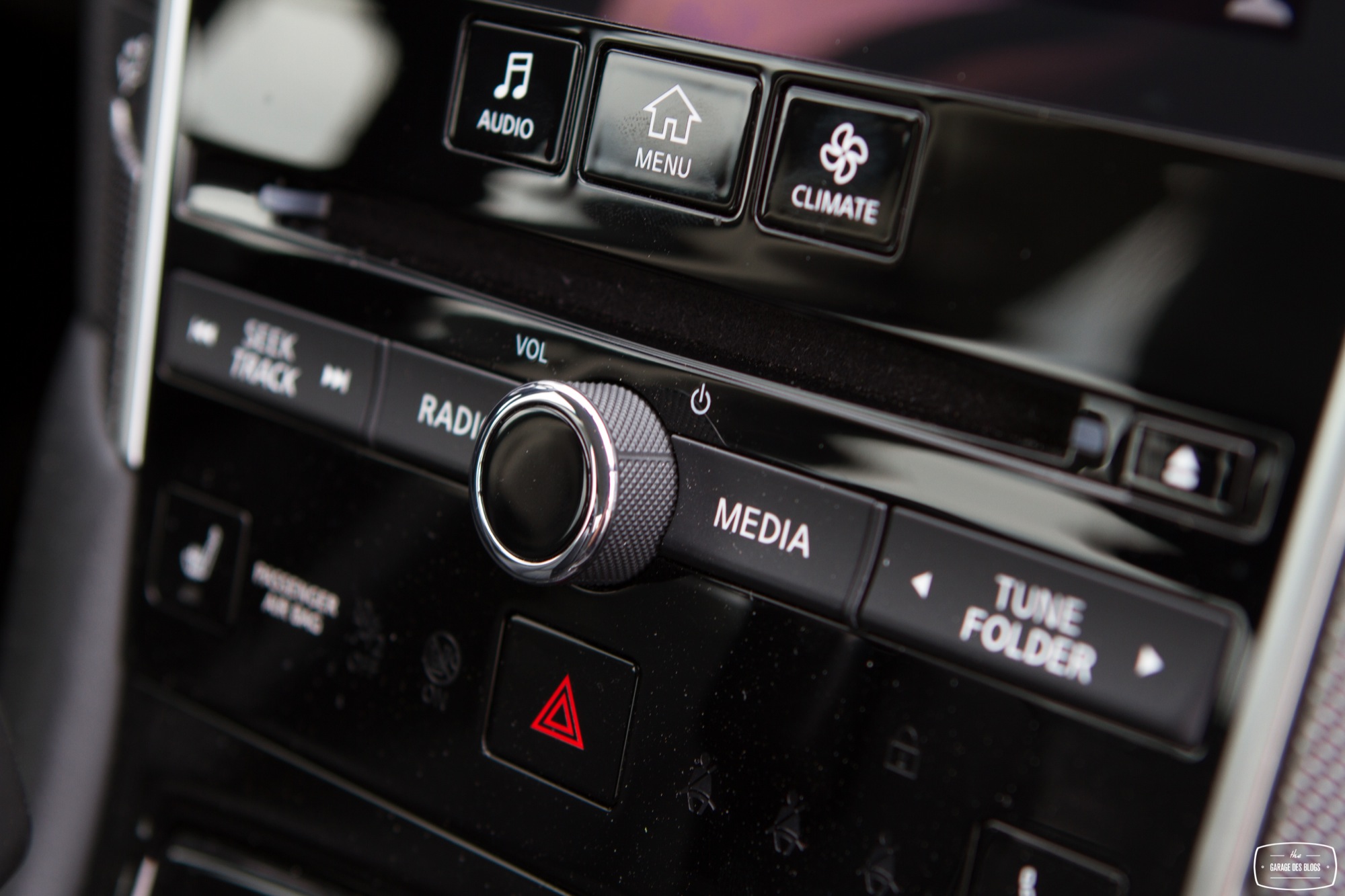 Pour ce qui est de la console centrale, je suis tombé sous le charme du double écran tactile, l’écran principal étant même une petite merveille de réactivité et de praticité ! Les boutons qui le bordent sont une évidence, bien fichus et bien finis. Par ailleurs, l’écran est pilotable au travers de l’ensemble de boutons / molette situé au niveau du tunnel central. Je m’attarde rapidement sur les fonctionnalités du coin avec tout d’abord le bouton de sélection de mode de conduite, retranscrit à l’écran. Cela continue ensuite avec les multiples caméras qui équipent la voiture, à l’avant, à l’arrière et sur les côtés. On a ainsi, disponibles à l’écran, une multitude de vues de la voiture, y compris aérienne, permettant de bien gérer sa manipulation dans des zones étroites. Le switch d’une caméra à l’autre est aisé et permet d’utiliser de manière pratique cette fonctionnalité.