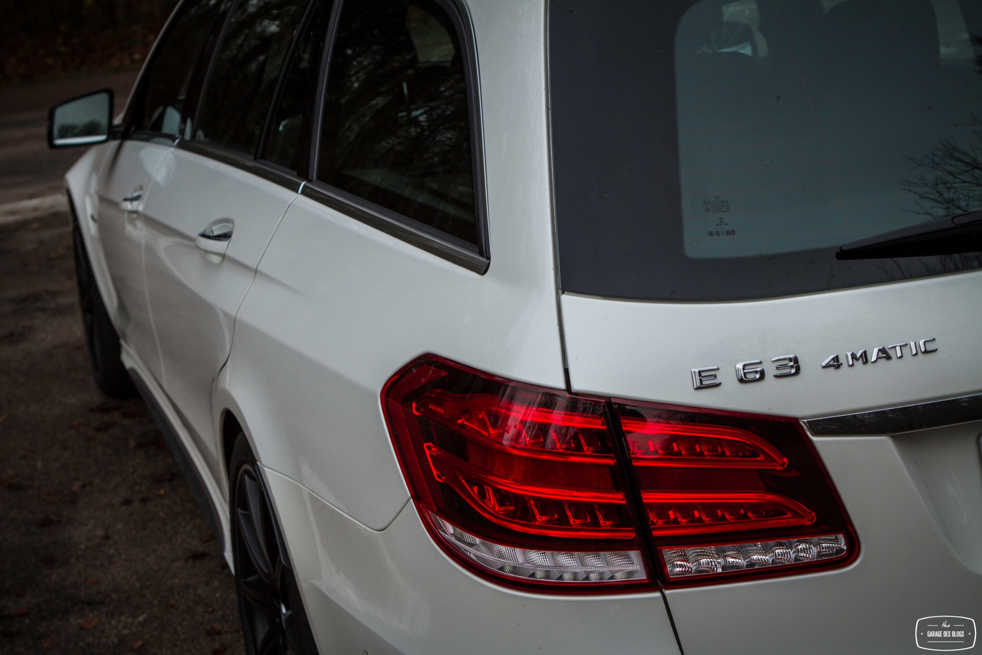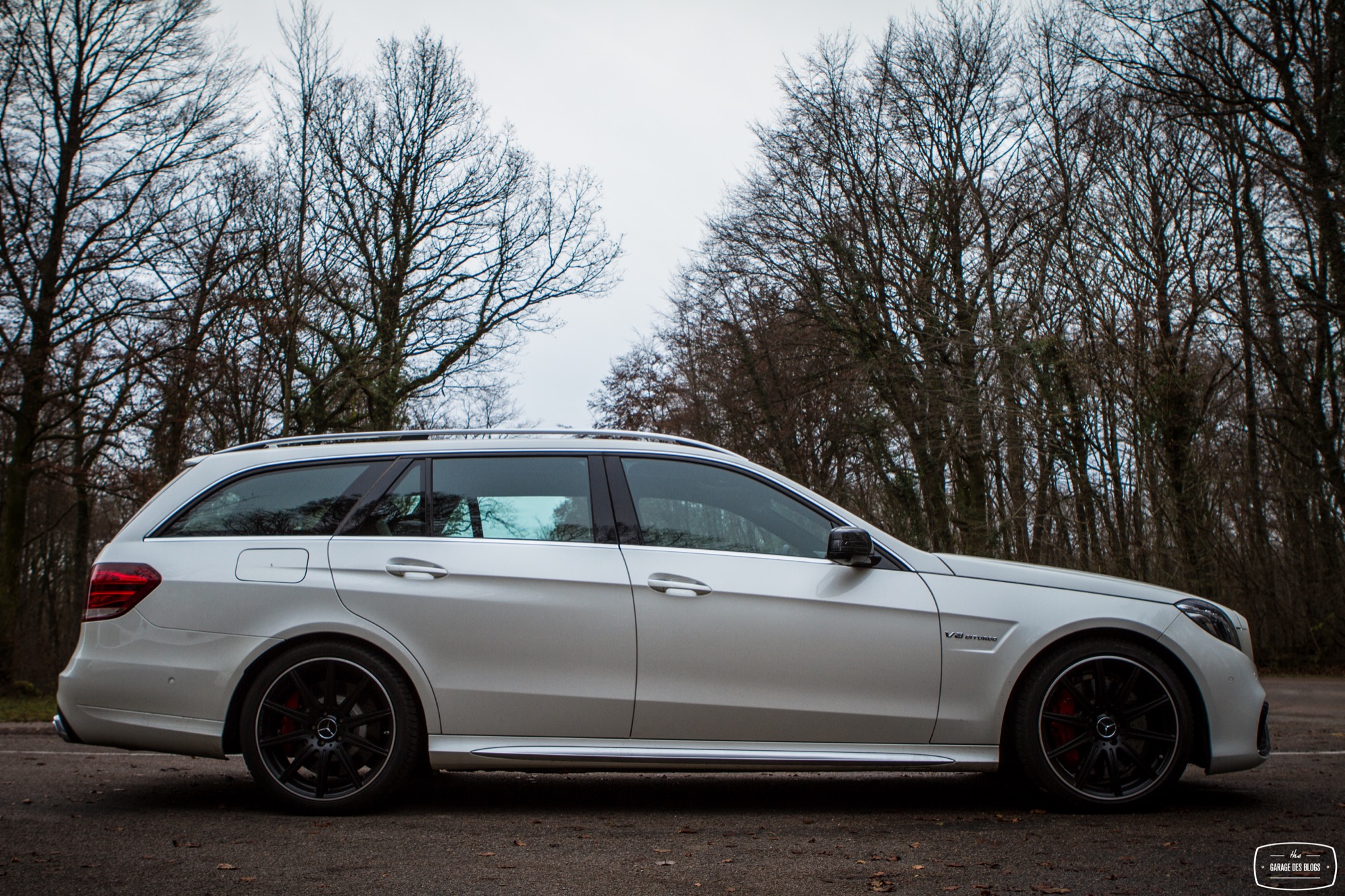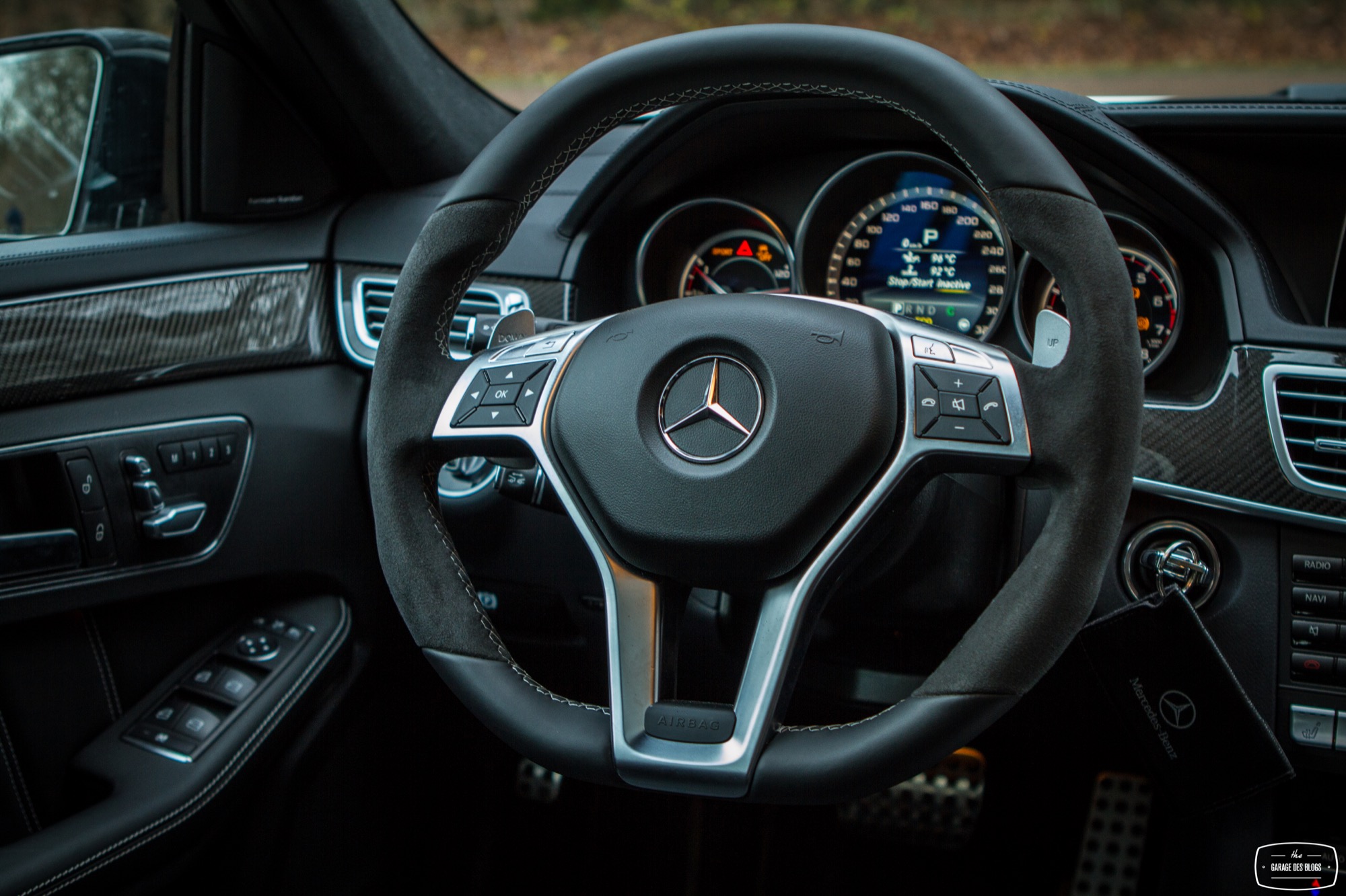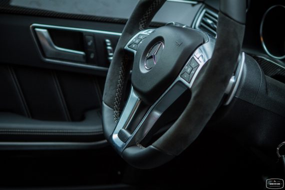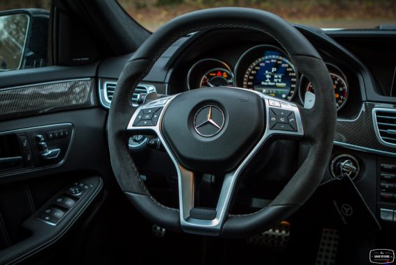 Le dehors est pourtant sobre, du moins en a-t-il l’air de loin, de profil et avant de découvrir les naseaux grand ouverts de la face avant. Un petit AMG brille à côté de l’étoile au centre de la calandre. Le facelift de 2013 a fait beaucoup de bien à la Classe E et ce constat fait à l’époque est toujours valable plus d’un an après. Classe E y gagne en dynamisme et en expression, ce qui est aussi valable avec la version AMG, encore plus agressive dans le regard. Au delà de cette face lippue et fort expressive, on remarque rapidement les grandes roues noires à bâtons et les ailes élargies qui les surplombent. Un marquage V8 BITURBO vient confirmer la couleur : nous faisons bien face à l’un des breaks les plus puissants au monde. La ligne se poursuit ainsi jusqu’à l’arrière, massif et élargi lui aussi, agrémenté d’un échappement signé AMG, surmonté des E63 4MATIC et S AMG. L’ensemble mêle donc classicisme des lignes d’un grand break de ce segment supérieur et augmentations nécessaires des voies, des prises d’air et autres organes visant à contenir un moteur que l’on devine coquin. A noter également : le pack carbone avec les rétroviseurs, fort jolis. Ah, autre détail un peu… amusant : les barres de toit ! Oui, on peut mettre une galerie sur ce lance-pierres ! Stupide, vous dis-je ! (imaginez moi avec des yeux en forme de cœur)