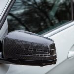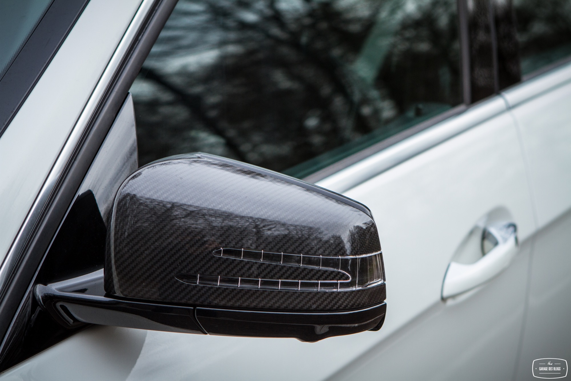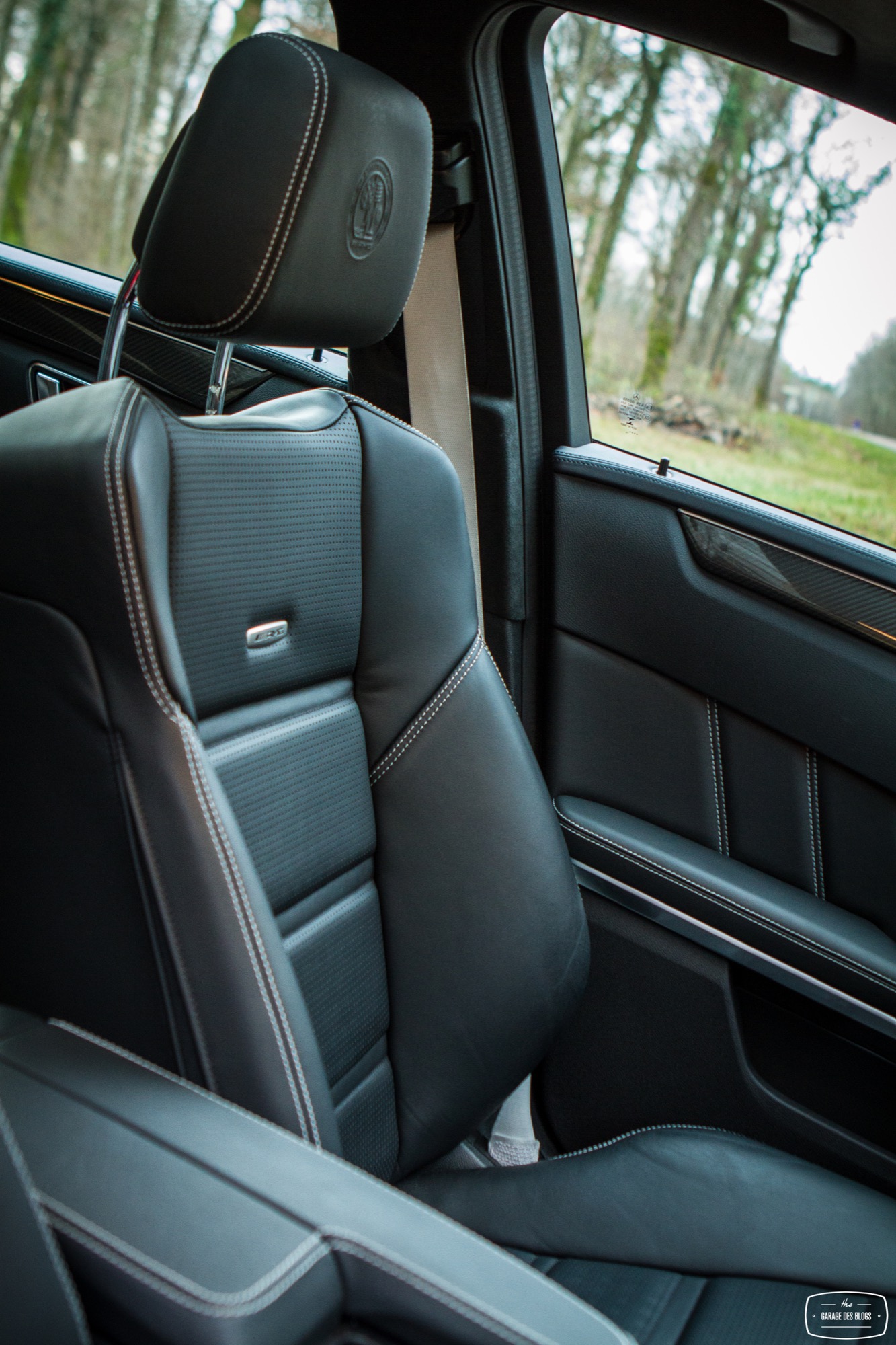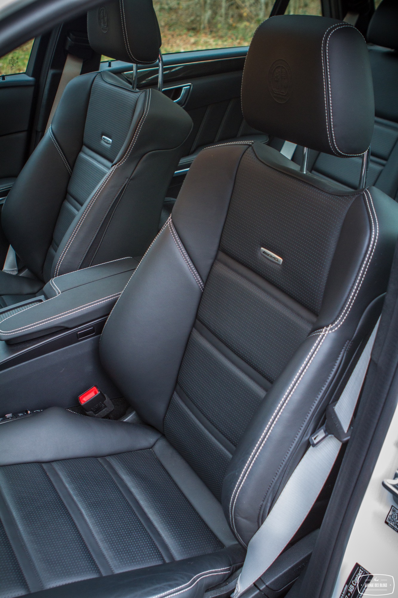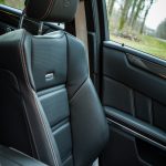 Le dehors est pourtant sobre, du moins en a-t-il l’air de loin, de profil et avant de découvrir les naseaux grand ouverts de la face avant. Un petit AMG brille à côté de l’étoile au centre de la calandre. Le facelift de 2013 a fait beaucoup de bien à la Classe E et ce constat fait à l’époque est toujours valable plus d’un an après. Classe E y gagne en dynamisme et en expression, ce qui est aussi valable avec la version AMG, encore plus agressive dans le regard. Au delà de cette face lippue et fort expressive, on remarque rapidement les grandes roues noires à bâtons et les ailes élargies qui les surplombent. Un marquage V8 BITURBO vient confirmer la couleur : nous faisons bien face à l’un des breaks les plus puissants au monde. La ligne se poursuit ainsi jusqu’à l’arrière, massif et élargi lui aussi, agrémenté d’un échappement signé AMG, surmonté des E63 4MATIC et S AMG. L’ensemble mêle donc classicisme des lignes d’un grand break de ce segment supérieur et augmentations nécessaires des voies, des prises d’air et autres organes visant à contenir un moteur que l’on devine coquin. A noter également : le pack carbone avec les rétroviseurs, fort jolis. Ah, autre détail un peu… amusant : les barres de toit ! Oui, on peut mettre une galerie sur ce lance-pierres ! Stupide, vous dis-je ! (imaginez moi avec des yeux en forme de cœur)