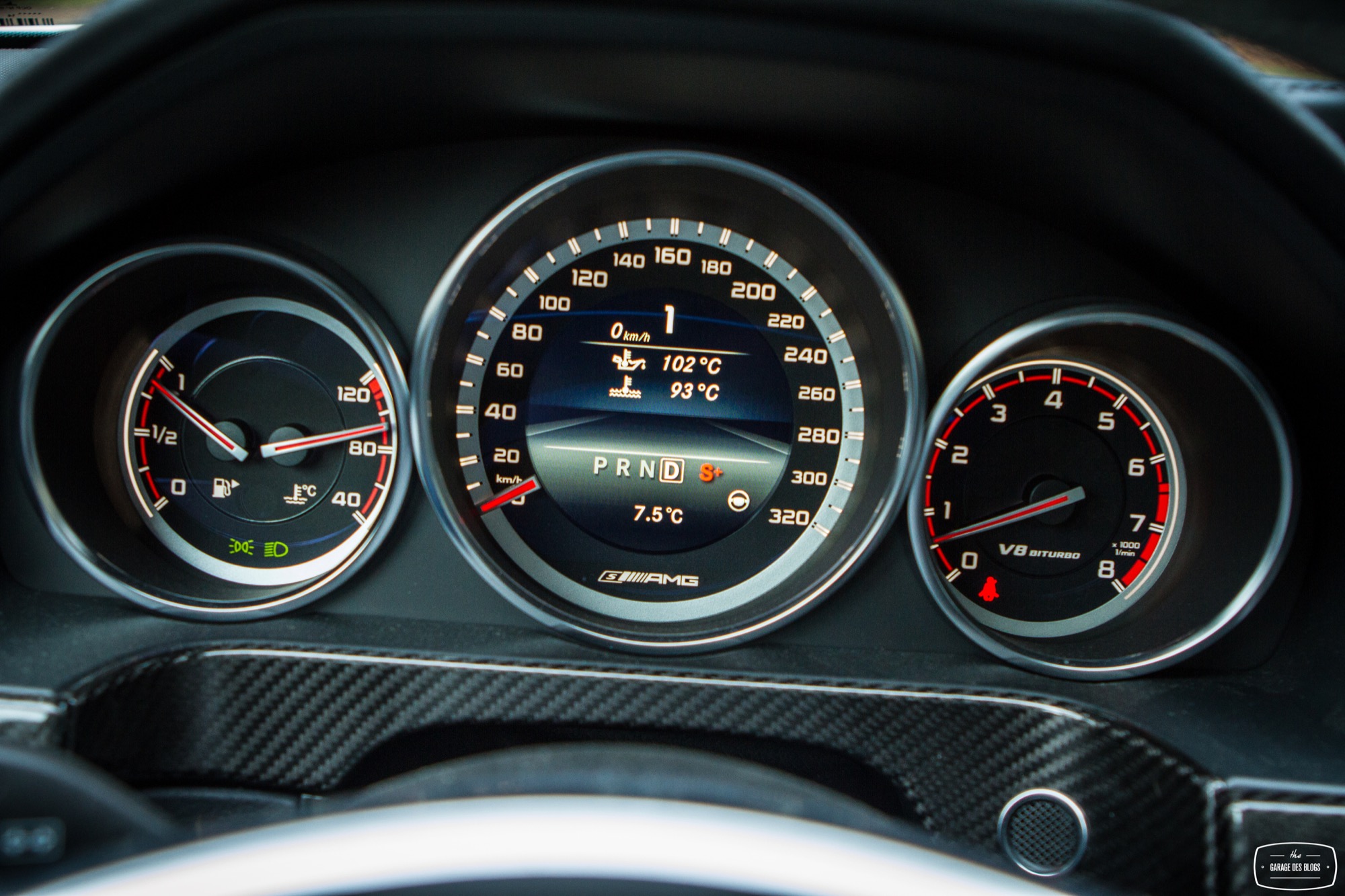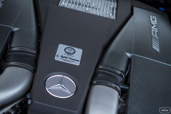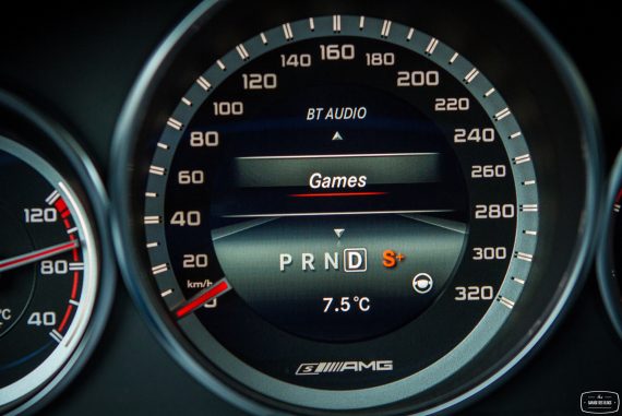 Un clic sur le bouton AMG et le monde bascule. Je remets la boîte en mode S+, trouvant le mode manuel un brin lent et la gestion automatisée mieux fichue car compensant justement la relative lenteur de cette boîte, pas toute jeune et devant composer avec un couple dantesque. Vivement la prochaine génération. Bref : la suspension se durcit mais n’en devient pas pour autant inconfortable. Si la détente devient plus limitée, l’amortissement reste réel sur les surfaces dégradées. La direction devient également plus directe, plus plaisante au final et le train avant se place avec diligence. Quant aux freins, ils composent avec les 2 tonnes du lance-pierres avec pas mal de mordant et d’endurance, ne donnant pas trop de signes de fatigue grâce à une taille bien dimensionnée à l’avant et sûrement à un matériau de friction bien résistant ! Il faut au moins cela car du côté du capot avant, ça souffle !