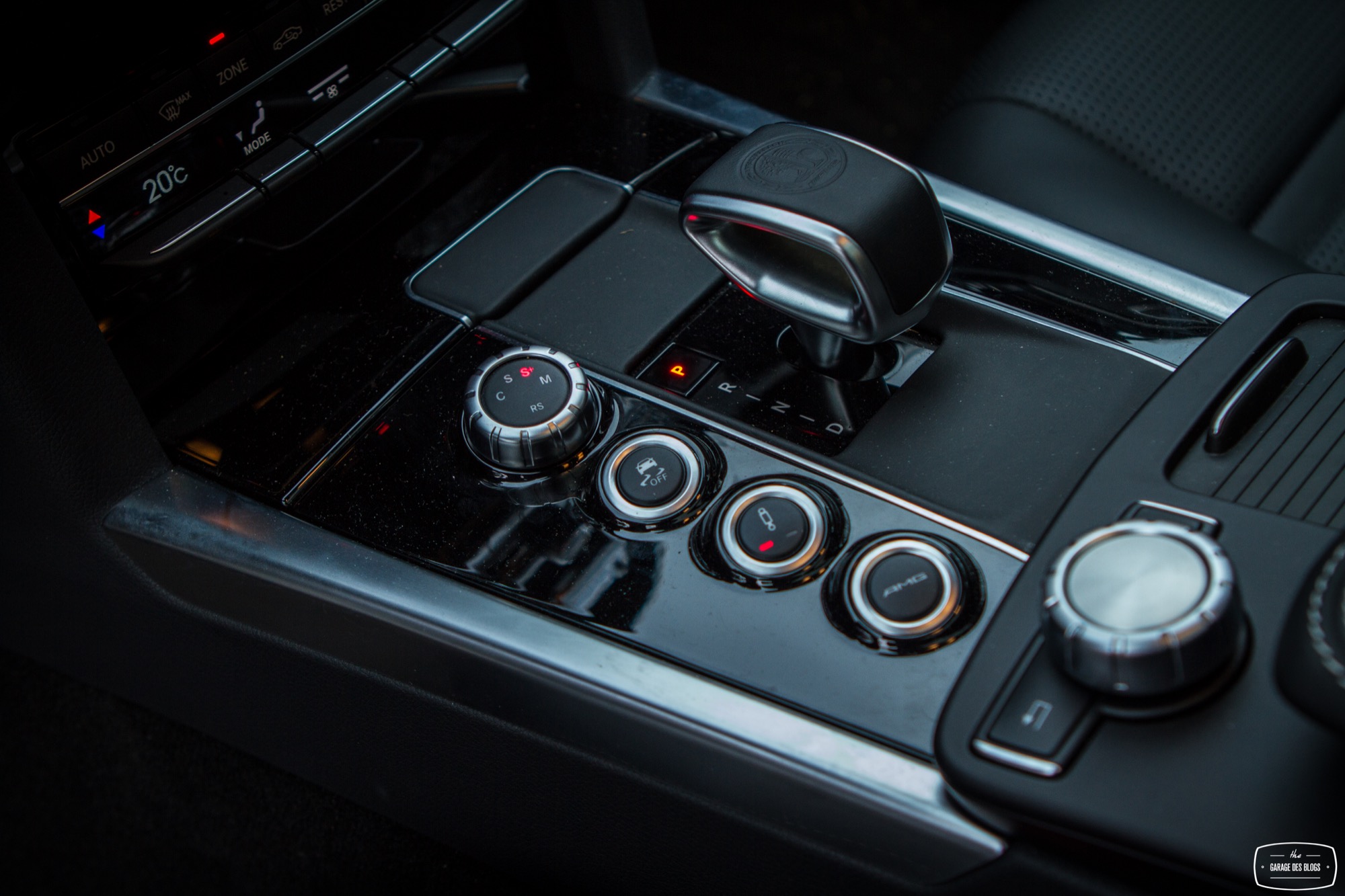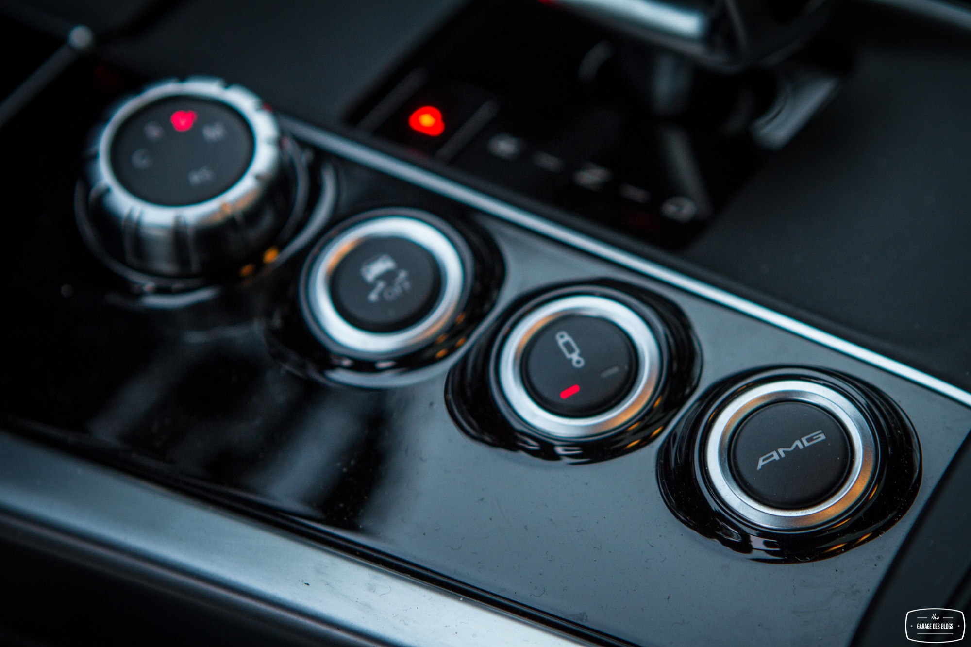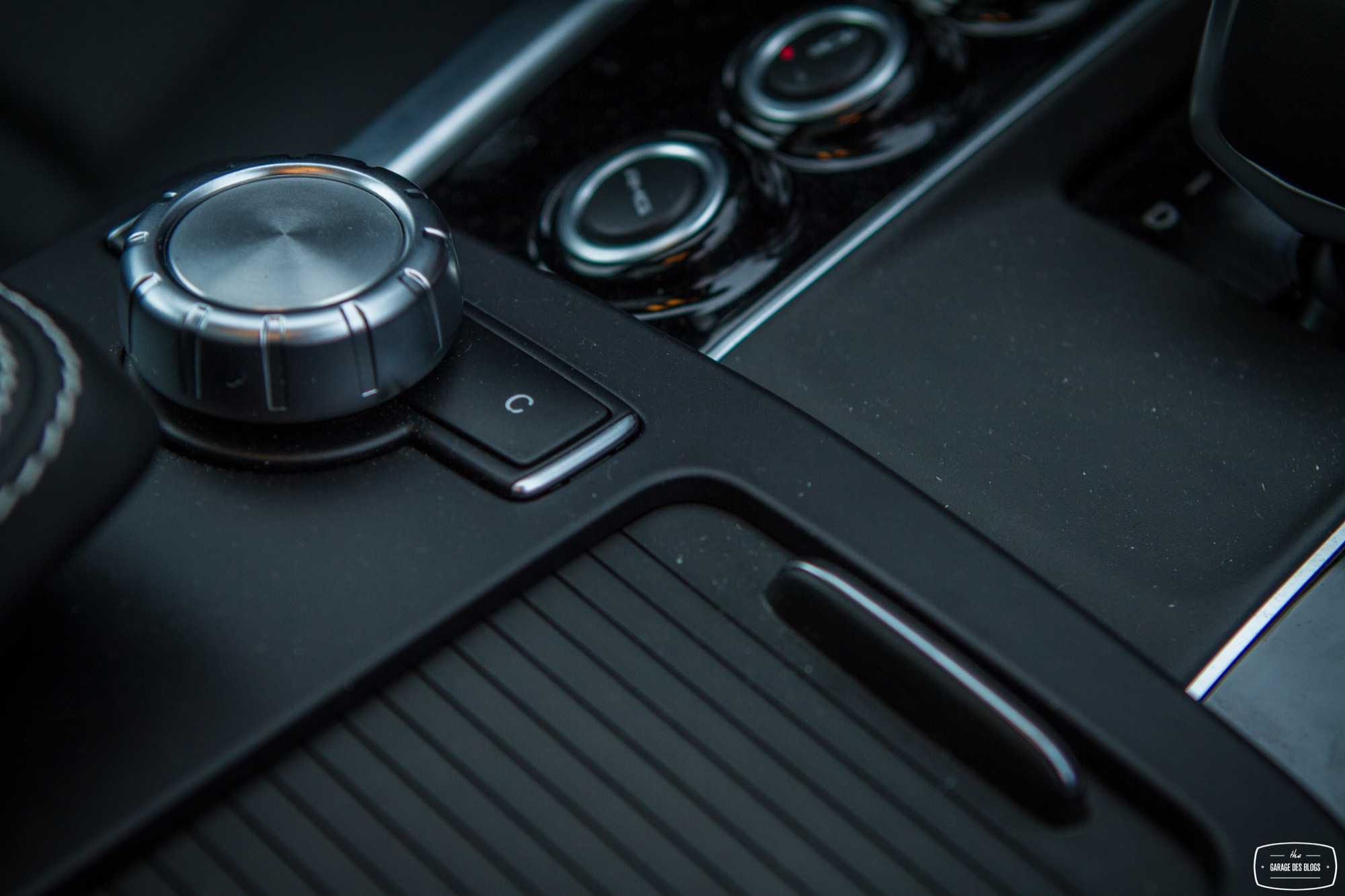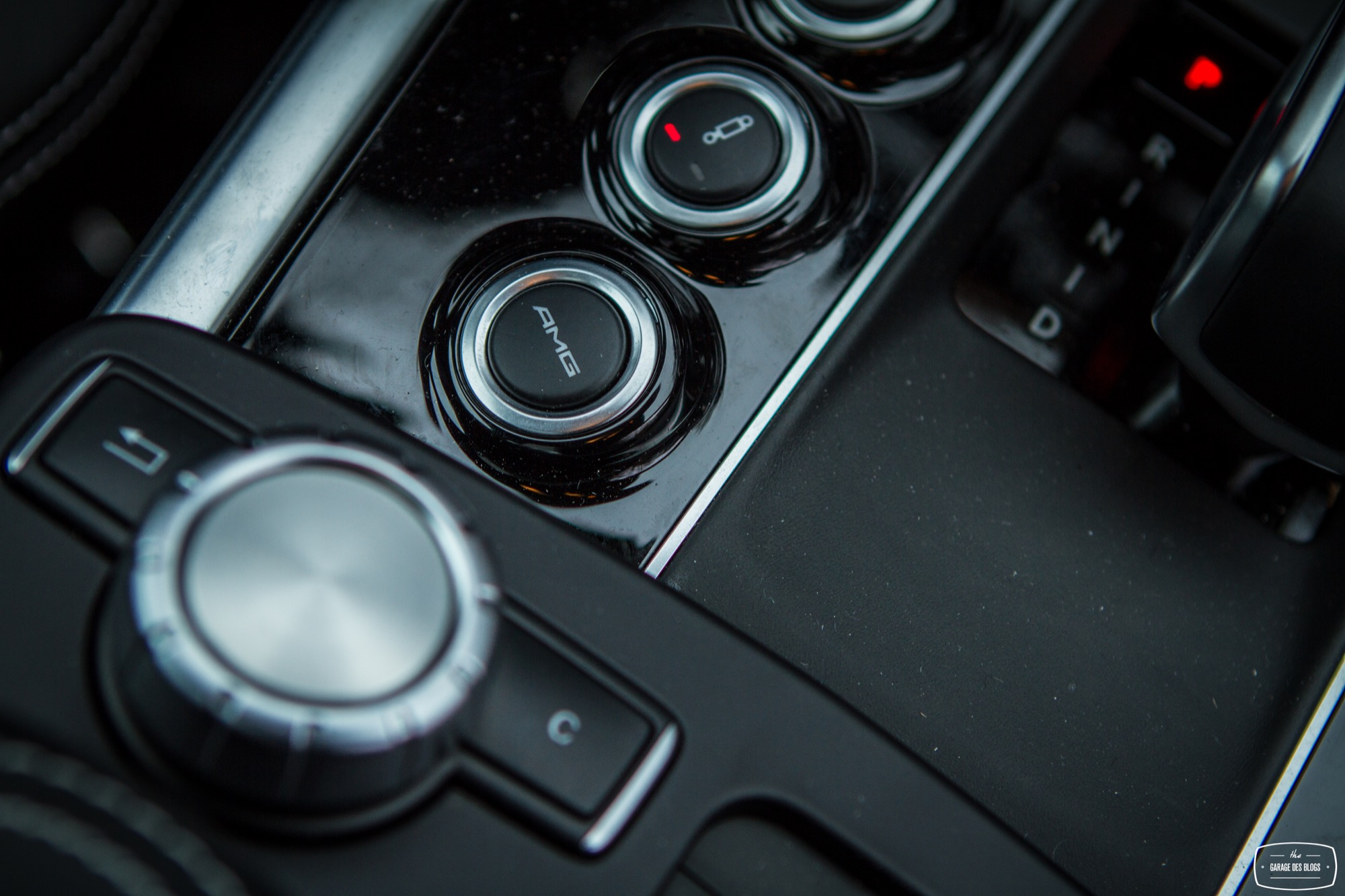 Pour ne rien gâcher, on découvre sur la console centrale quelques éléments familiers et d’autres moins. Le levier de vitesse avec le blason AMG d’une part mais surtout un ensemble de boutons fort sympathiques venant configurer la réponse de la voiture : sélection du mode de passage de la boîte de vitesse à 7 rapports, sélection du mode sport ou off pour l’ESC, sélection du tarage de la suspension pilotée et enfin la touche magique : le bouton AMG ! En appuyant sur ce petit bouton, on sélectionne le mode de suspension le plus ferme, la boîte passe en manuel et la carto moteur / boîte / pédales se met en mode énervé. Bouton magique vous dis-je qui transfigure le comportement de l’auto.
