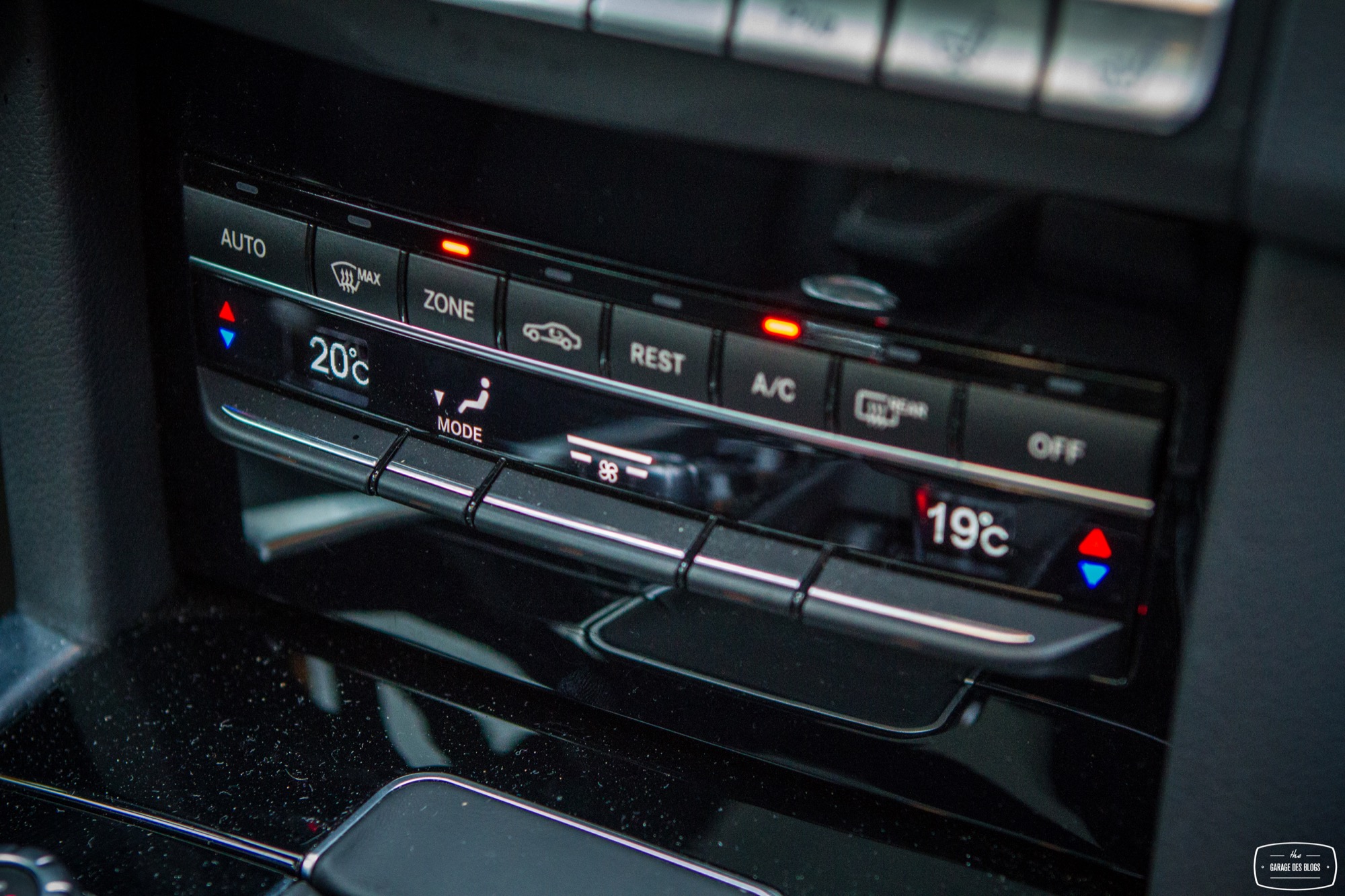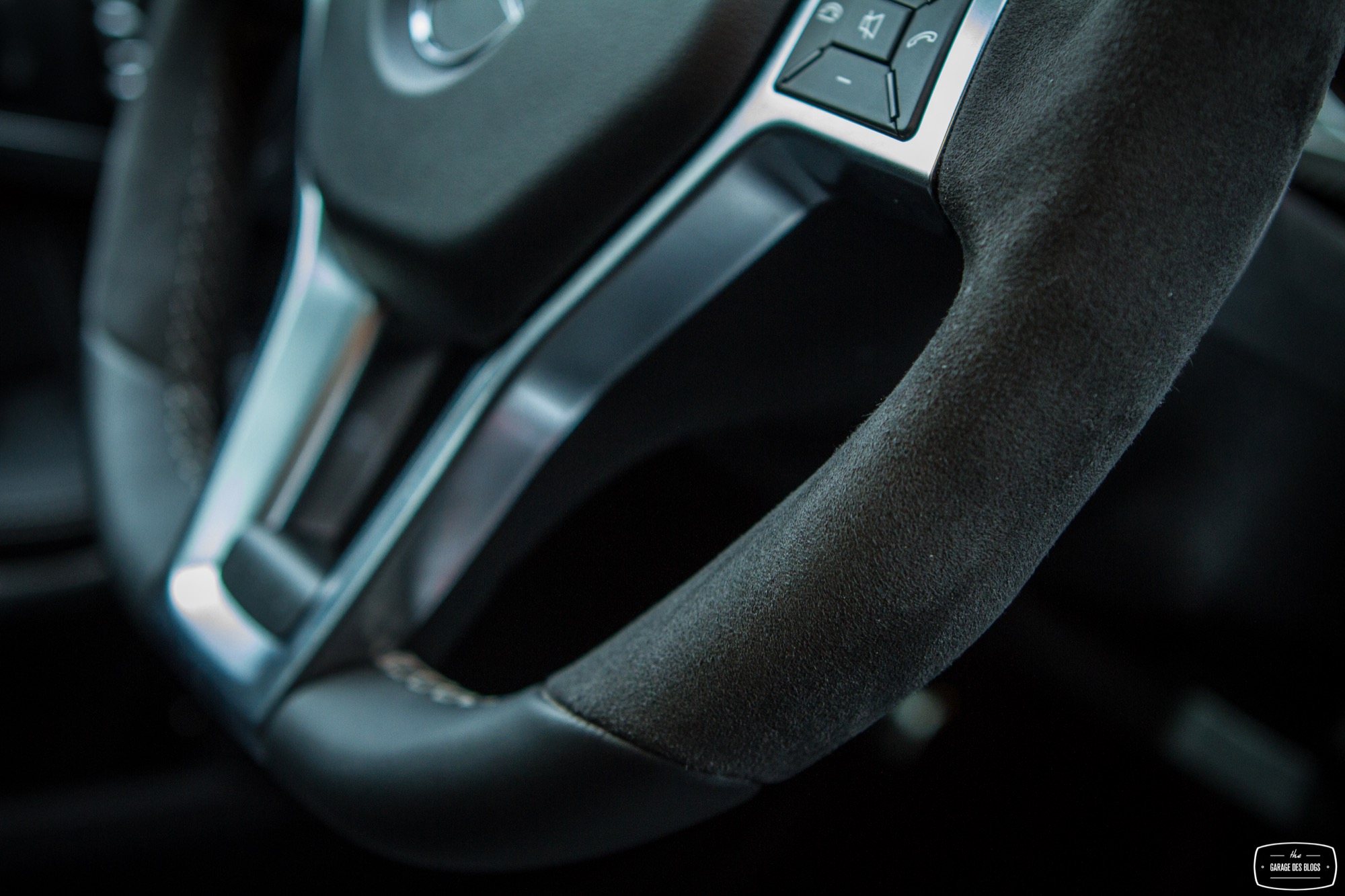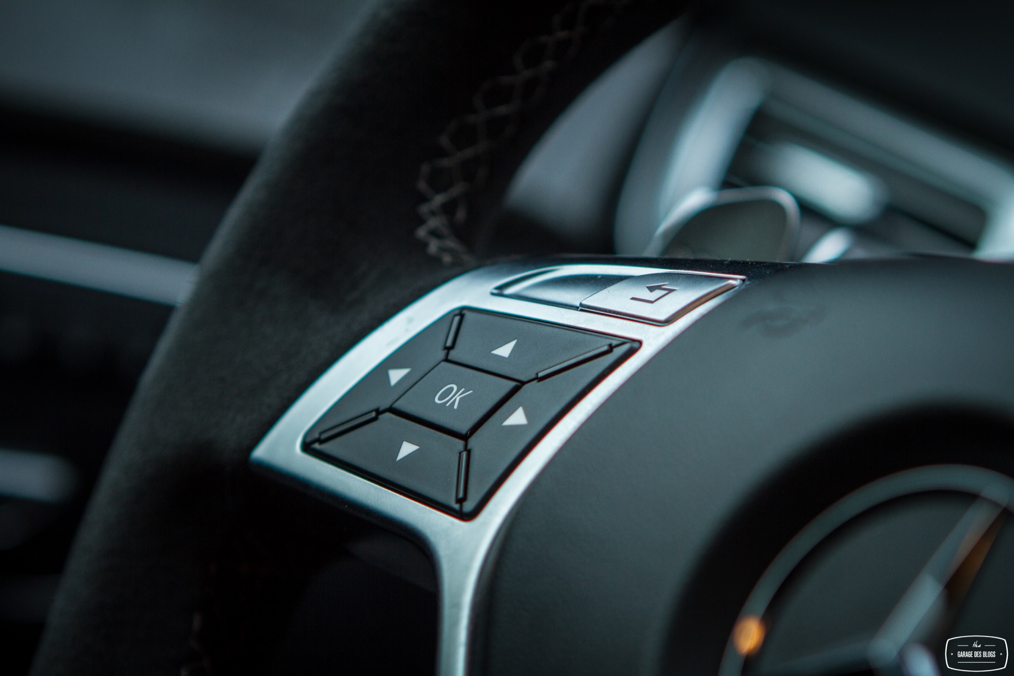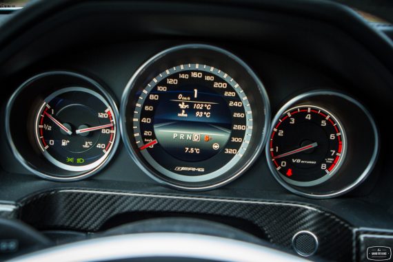 Pour ne rien gâcher, on découvre sur la console centrale quelques éléments familiers et d’autres moins. Le levier de vitesse avec le blason AMG d’une part mais surtout un ensemble de boutons fort sympathiques venant configurer la réponse de la voiture : sélection du mode de passage de la boîte de vitesse à 7 rapports, sélection du mode sport ou off pour l’ESC, sélection du tarage de la suspension pilotée et enfin la touche magique : le bouton AMG ! En appuyant sur ce petit bouton, on sélectionne le mode de suspension le plus ferme, la boîte passe en manuel et la carto moteur / boîte / pédales se met en mode énervé. Bouton magique vous dis-je qui transfigure le comportement de l’auto.