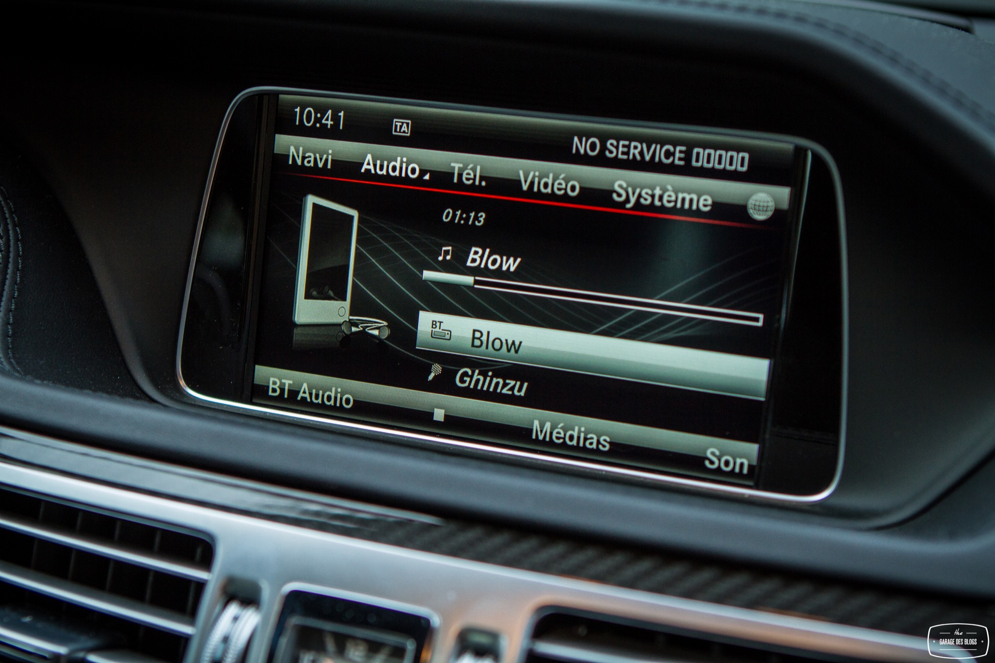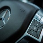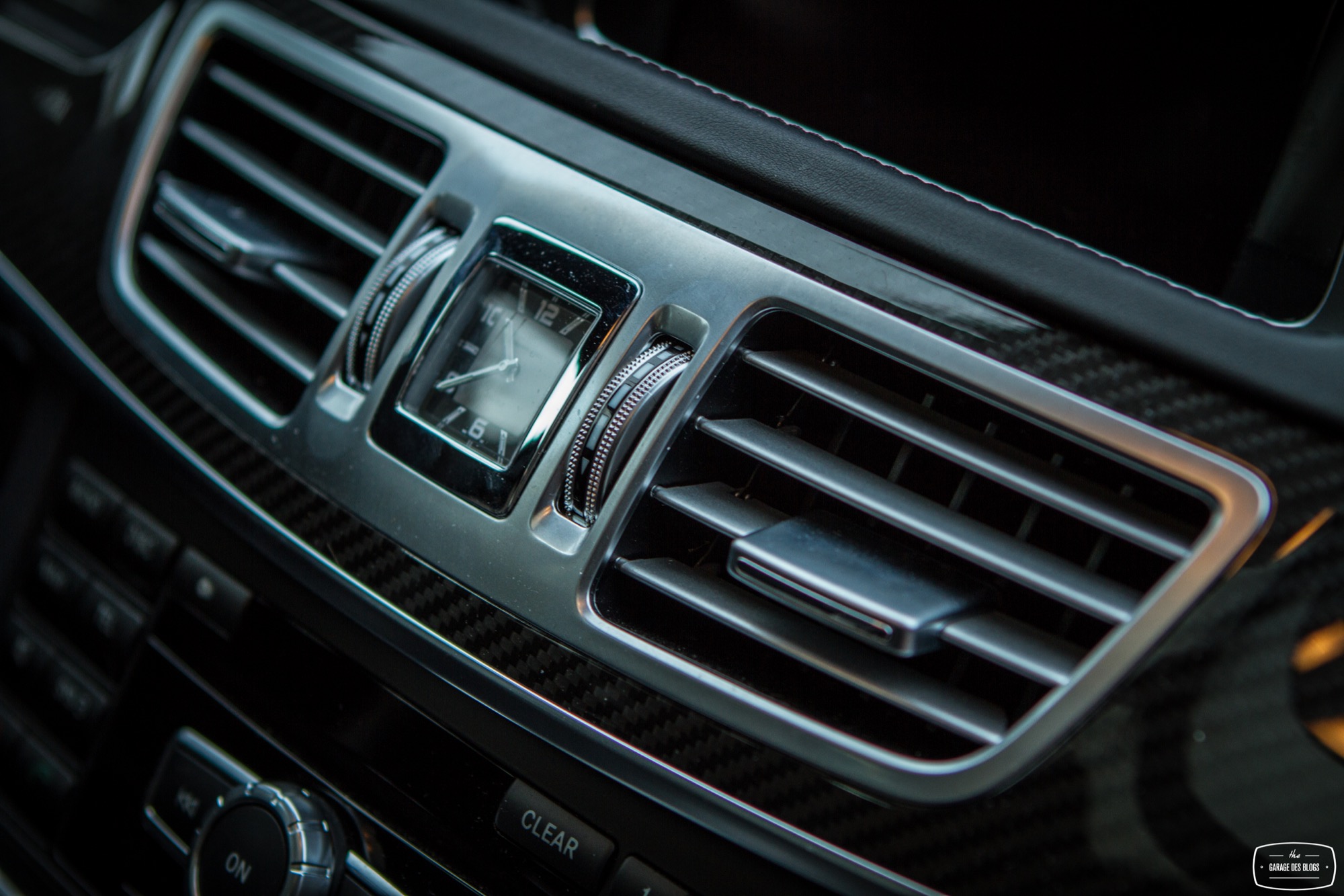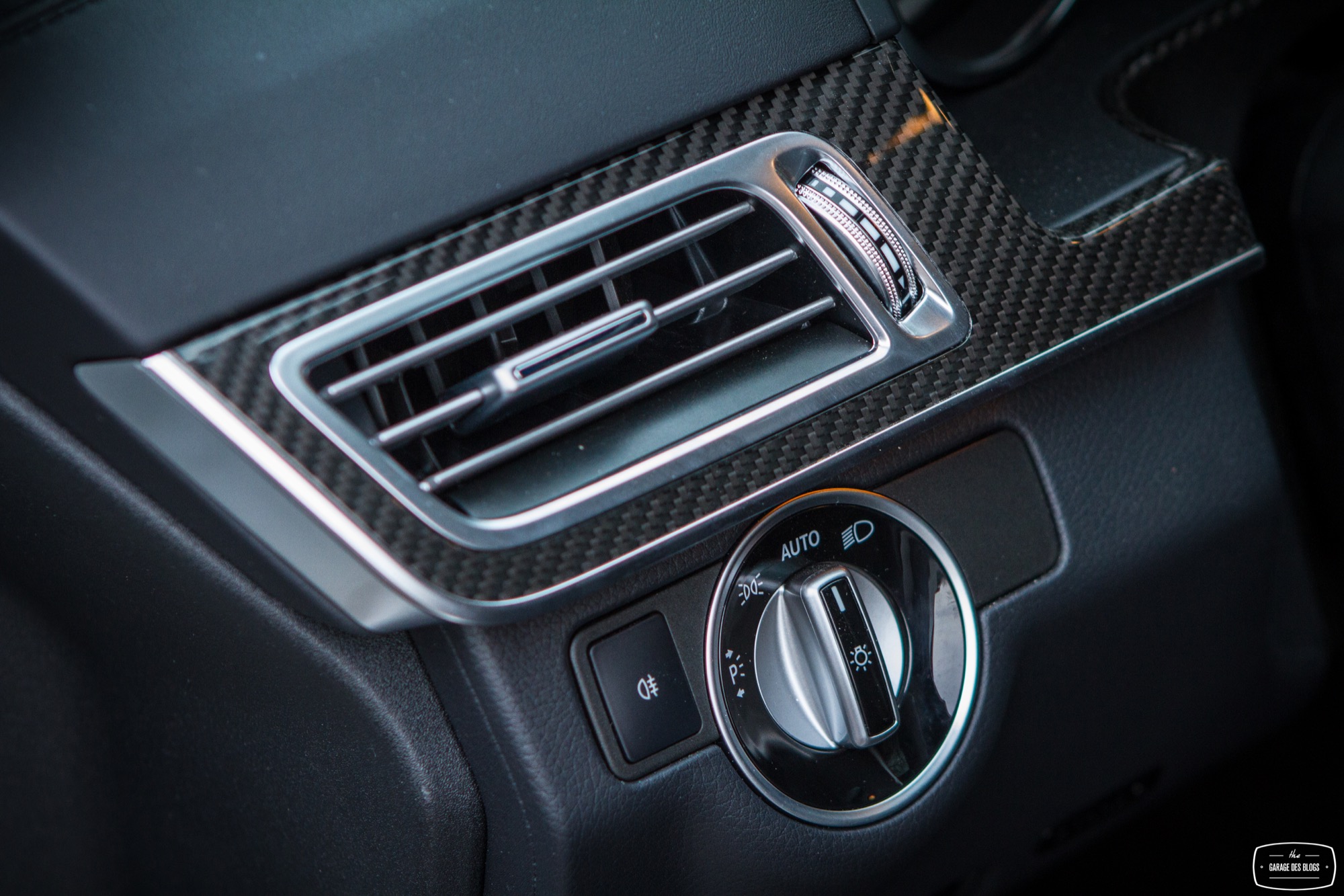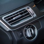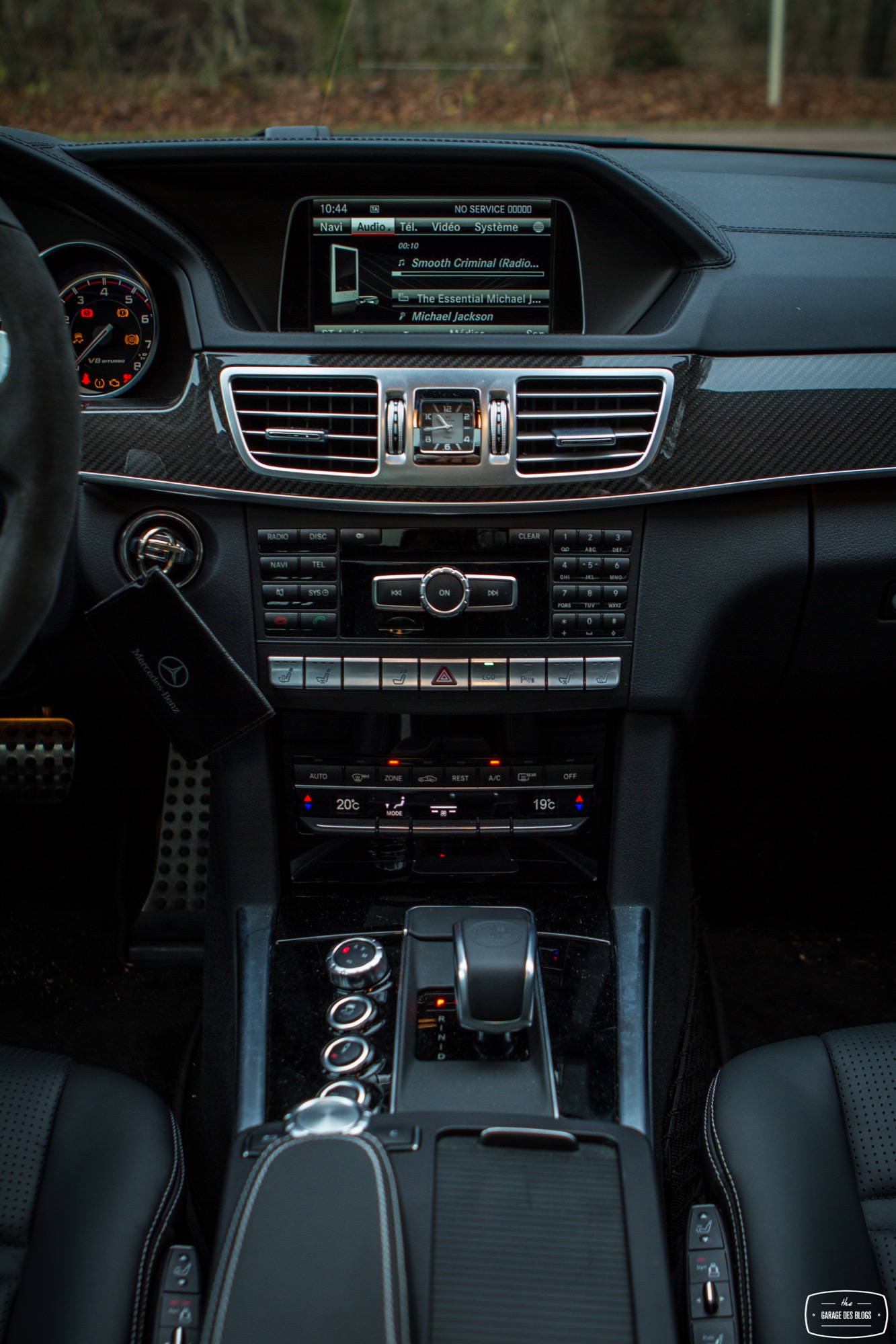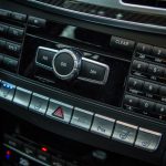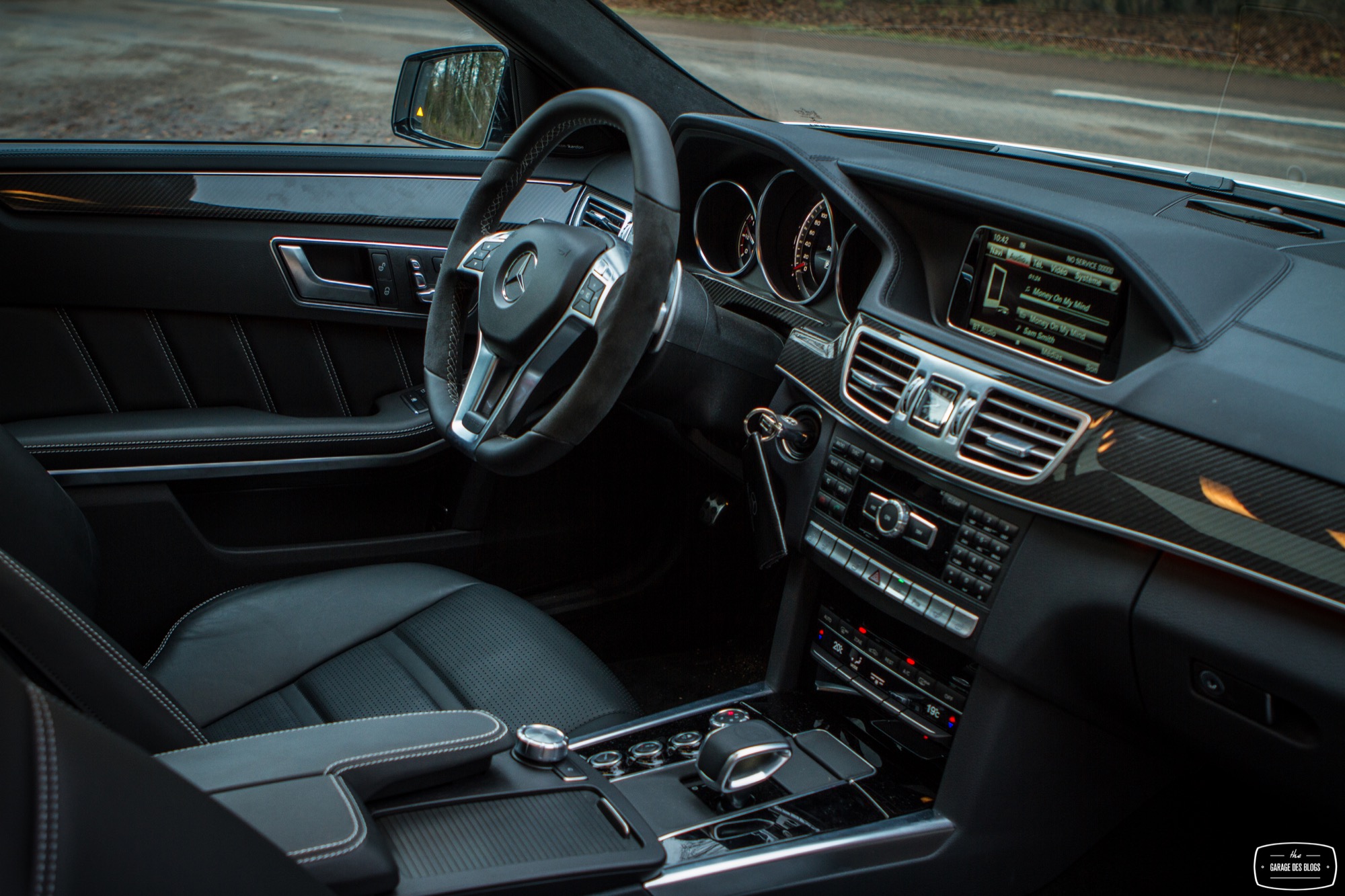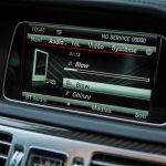 Passons désormais à l’intérieur où le véhicule, déjà richement doté, bénéficie de quelques options complémentaires type caméra 360, pack assistance conduite Plus ou encore des inserts décoratifs en carbone. C’est tout, car pour le reste, la Classe E reste un véhicule richement doté et à l’intérieur de qualité. Pour 150k€ facturés, on n’en attend évidemment pas moins. Il faut néanmoins garder à l’esprit que ce véhicule, bien que restylé en 2013 comme je le disais, est déjà assez ancien. On ne retrouve ainsi pas les nouveautés des dernières Classe C ou Mercedes-AMG GT. Il faudra pour récupérer affichage tête haute, pavé tactile et système infotainment mis à jour attendre 2016 et l’arrivée de la nouvelle version. En attendant, on perçoit certains anciens réflexes et fonctions : molette seulement cliquable et pas très bien placée, grand clavier au centre de la console centrale, écran à la définition assez basse ou encore gros frein de parking qu’on active au pied et qu’on relâche avec une poignée. Ce constat d’ancien un peu remis au goût du jour pousse plutôt à utiliser le petit écran au centre des compteurs, plus ergonomique et pratique à mon goût même si ici aussi sa définition a pris un coup de vieux. Bon, malgré ce constat en demi-teinte pour ce qui est des équipements, les finitions sont de très bon niveau et les matériaux comme souvent chez Mercedes excellents.