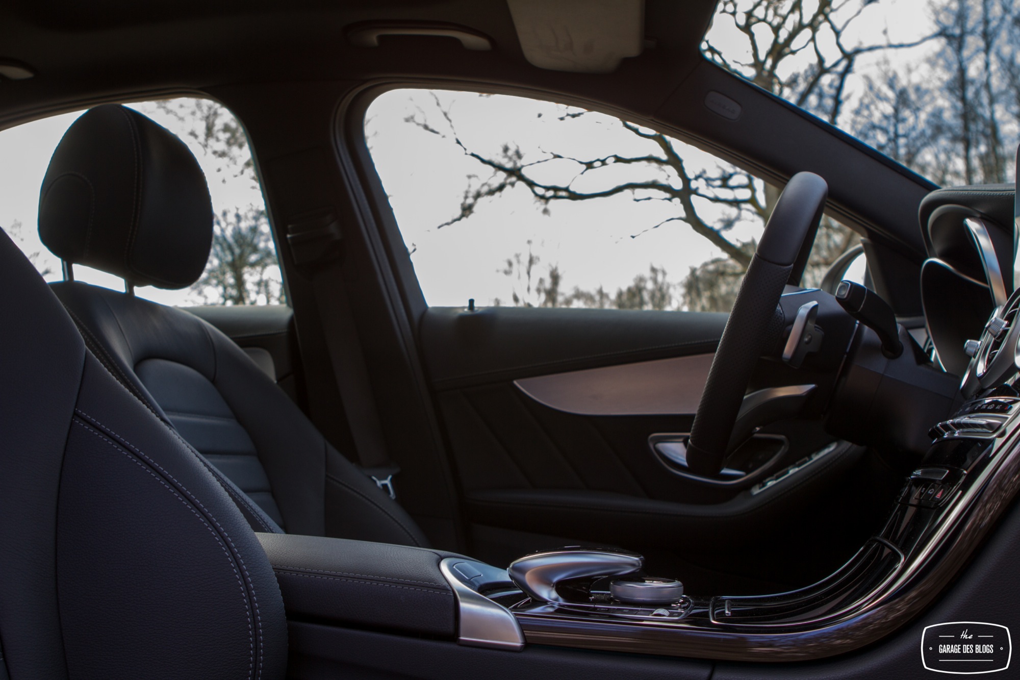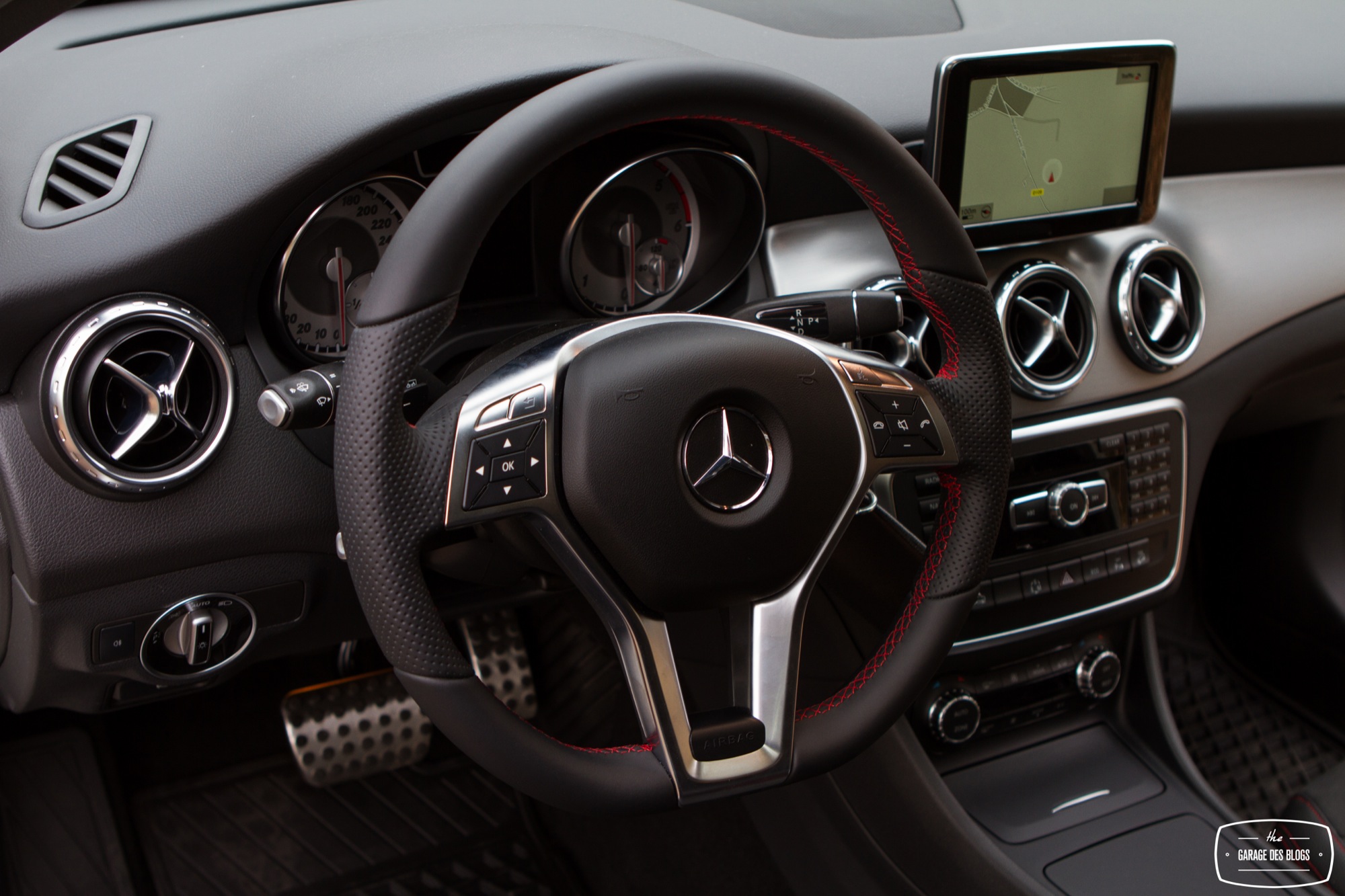 L’intérieur du GLA est fortement ressemblant à celui de la Classe A, aussi ne m’éterniserai-je pas dessus. L’ensemble reste très bien fini, bien pensé et assemblé. J’ai néanmoins retrouvé les mêmes points durs qui m’avaient déplu dans la A, à savoir le tunnel central fait d’un très vilain plastique et le système d’infotainment qui me perturbe toujours un peu. L’écran est déporté et non pas intégré à la planche de bord. L’effet tablette fait qu’on a envie de jouer avec l’écran tactile qui ne l’est en fait pas. Le système de pilotage par la molette reste globalement instinctif mais il manque une once d’ergonomie pour qu’il soit parfait. Pour le reste ? C’est une Mercedes et je ne pense ne pas avoir grand chose à rajouter ! Bien installé, bon maintien dans les sièges, un joli volant (auquel il manque un méplat, tout de même), des commandes plutôt instinctives et un bon équilibre entre niveau de finition premium et nécessaire rationalisation des coûts même si pour 55k€ je m’attendais à mieux sur certains points.