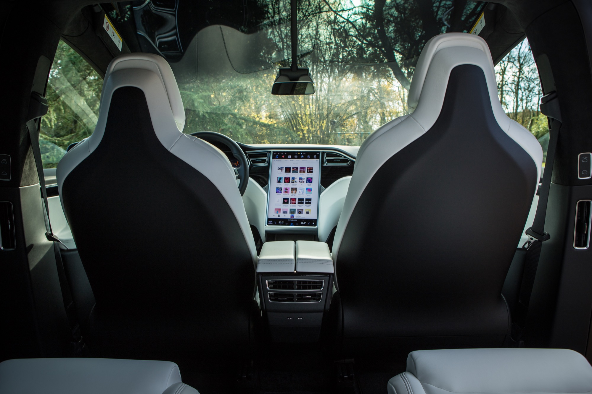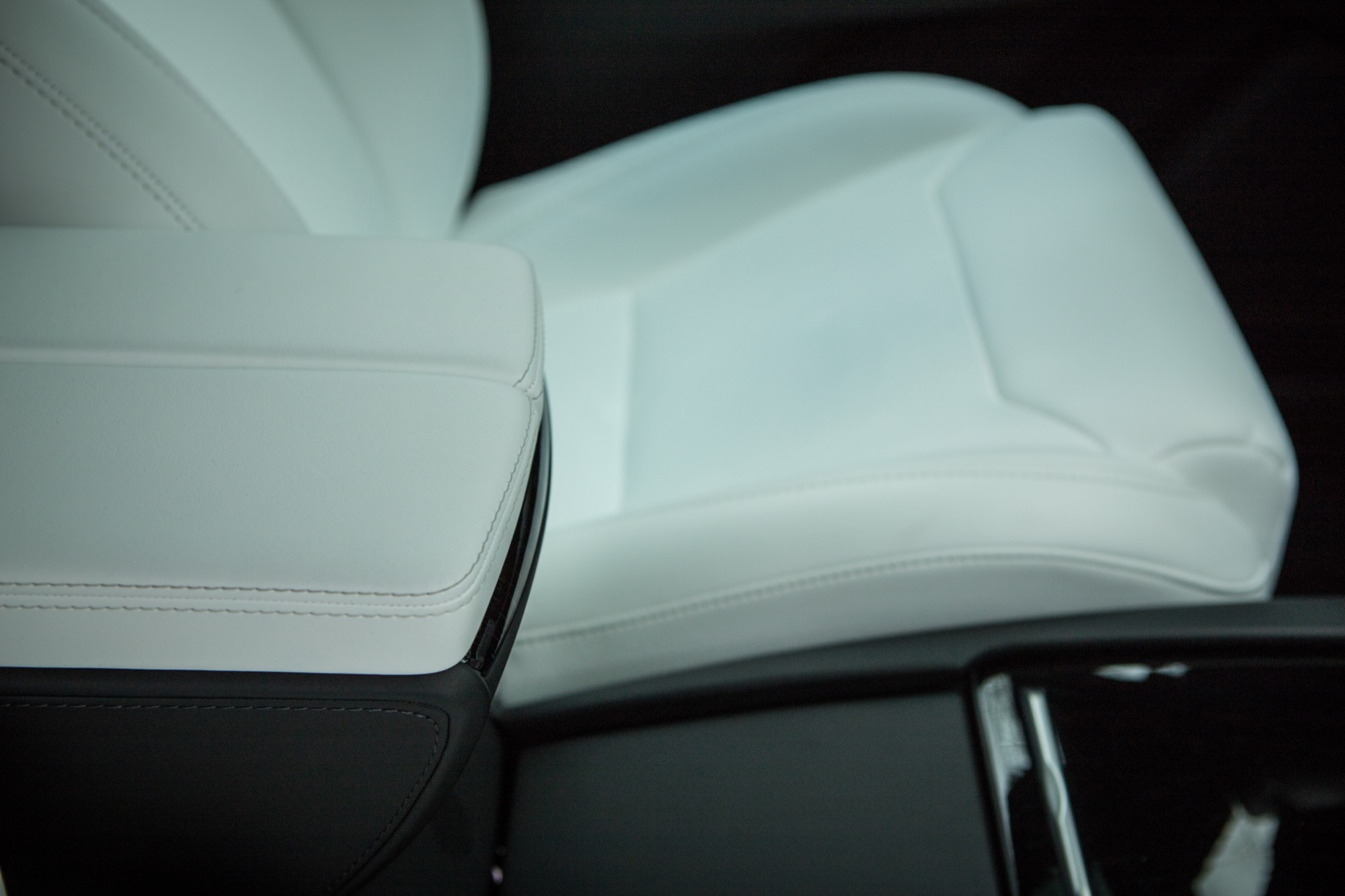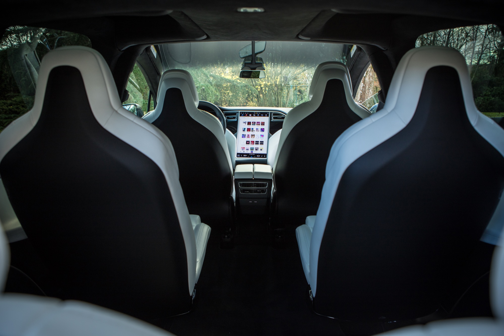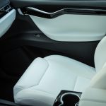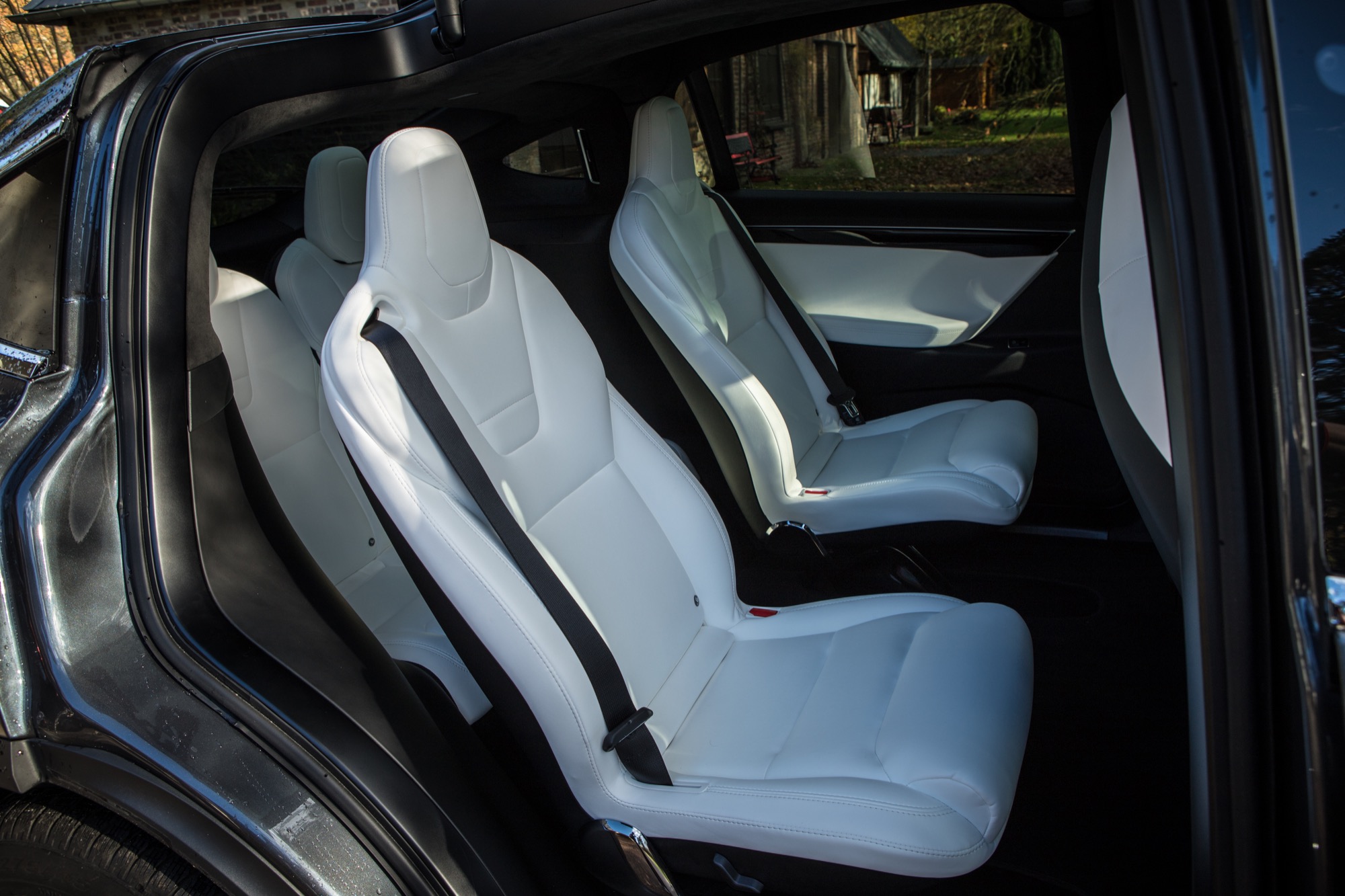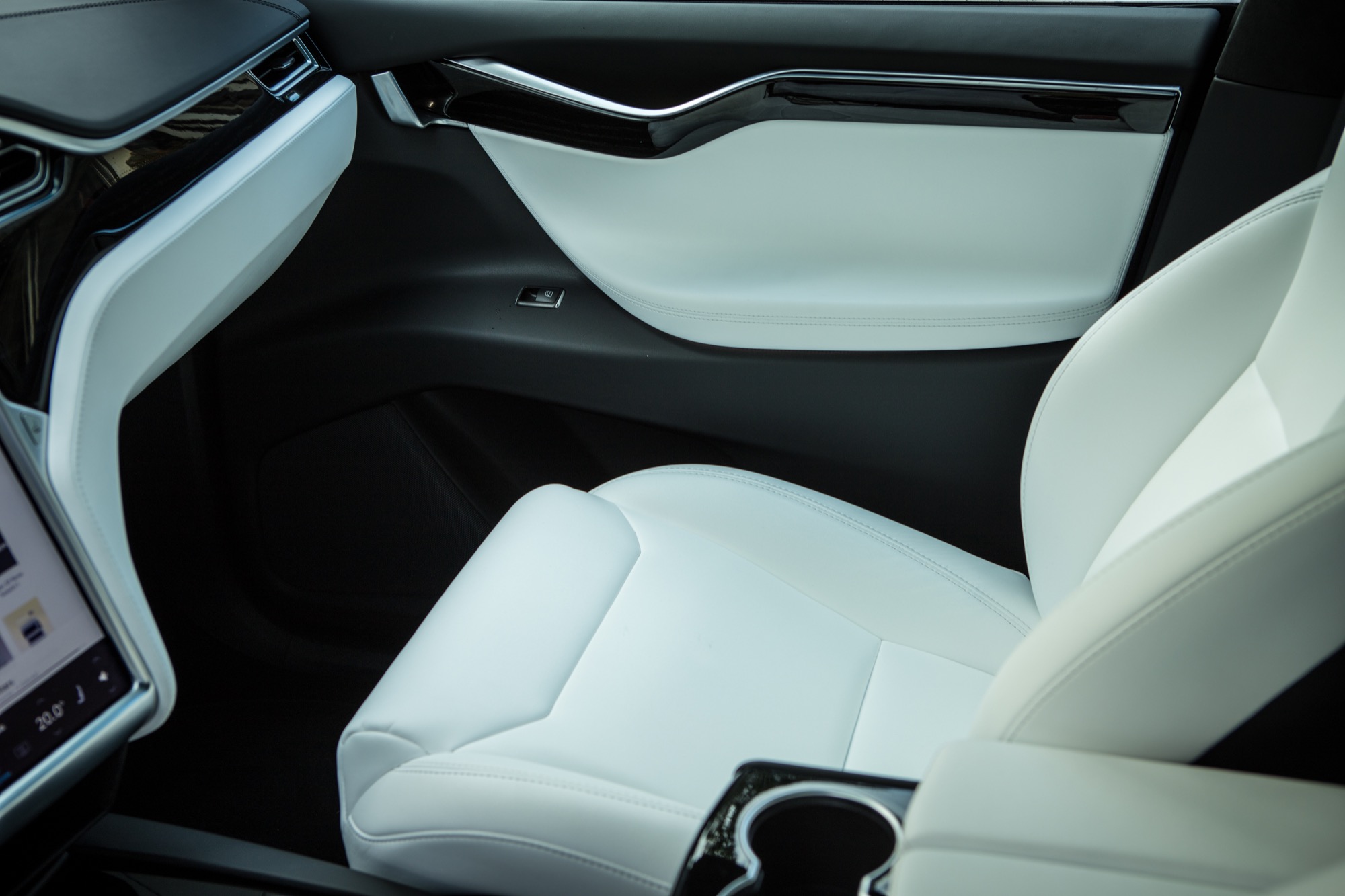 L’intérieur n’est en revanche toujours pas concerné par cette relative discrétion. Appuyer sur le bouton d’ouverture de la portière conducteur, laisser le petit moteur électrique vous assister à 95% dans l’ouverture, écarquiller les yeux. L’habitacle du Model X est bluffant et a fait s’ouvrir en grand quelques bouches pendant mon essai. Le cuir synthétique blanc (approche vegan de la marque, soit) est superbe, immaculé et à priori facilement lavable et détachable.