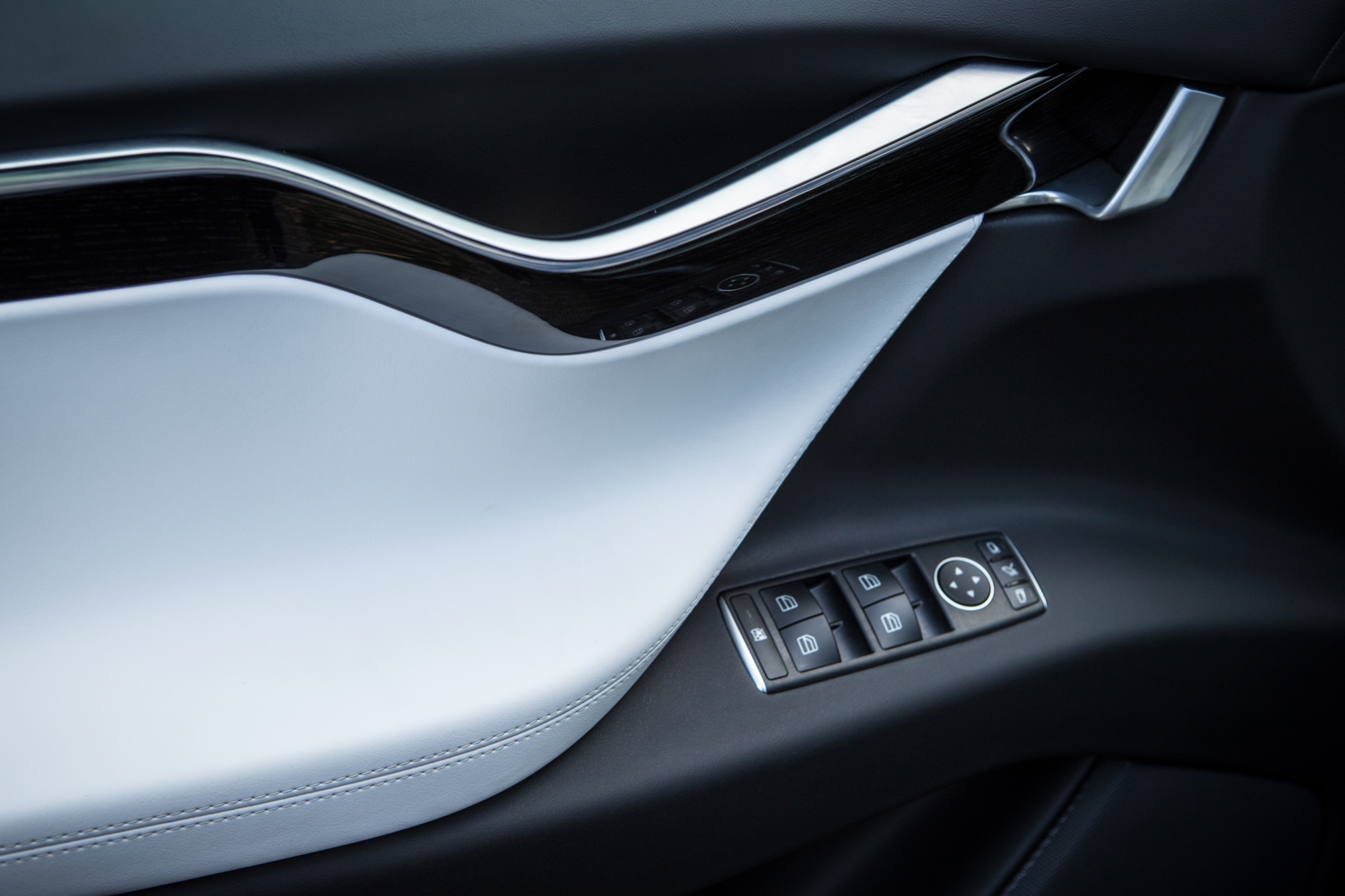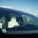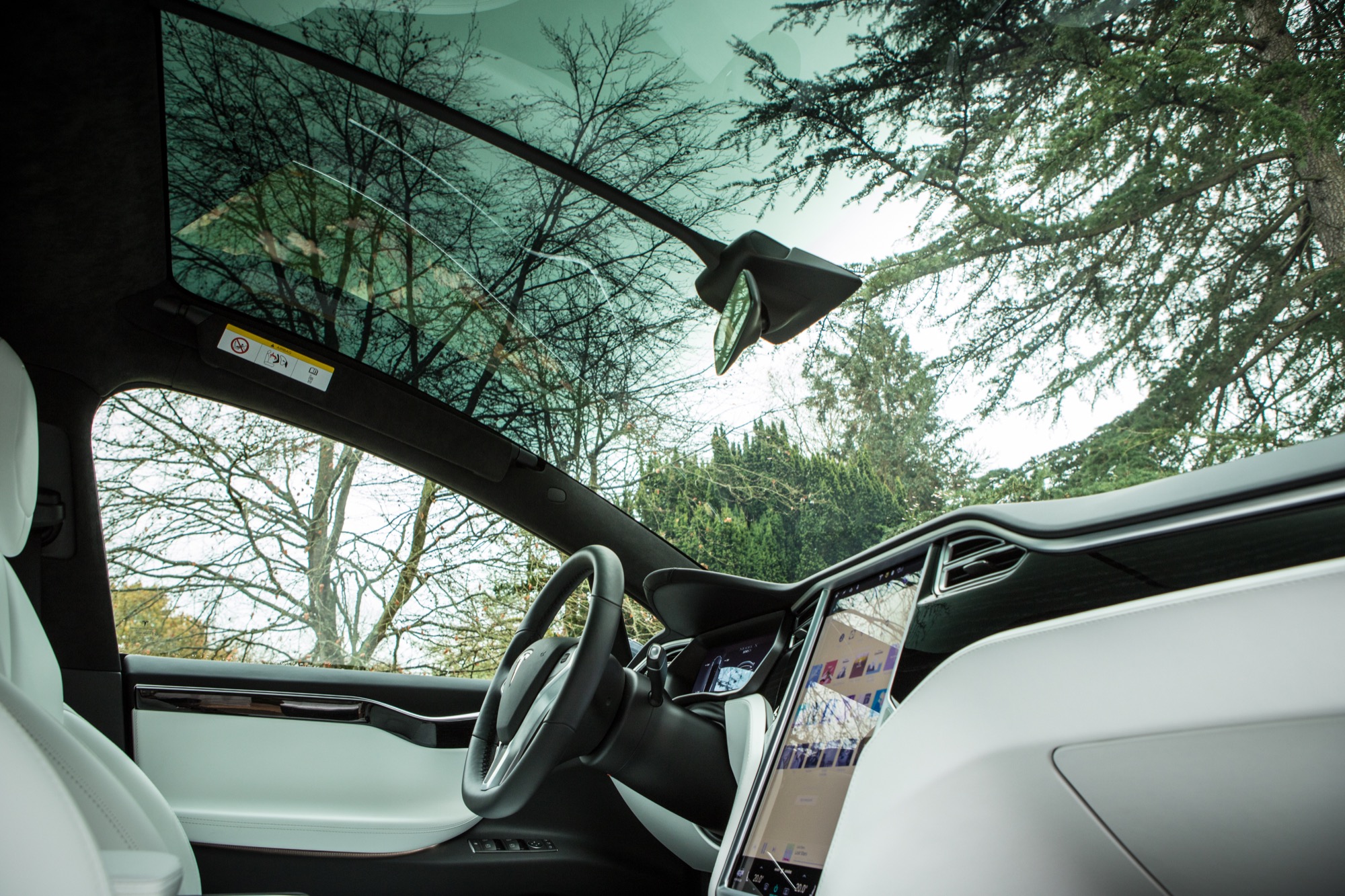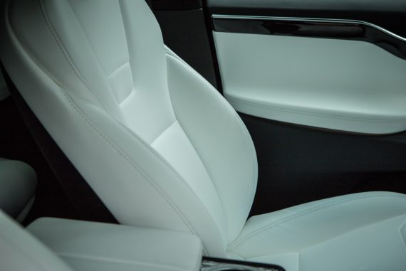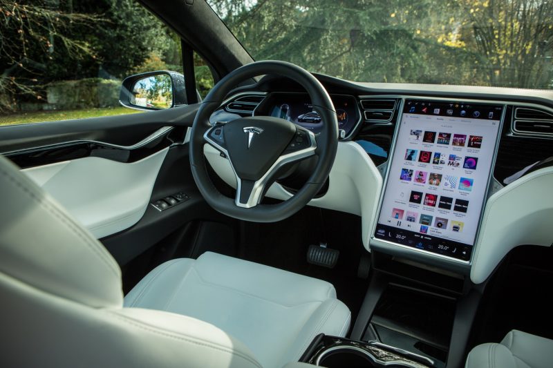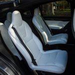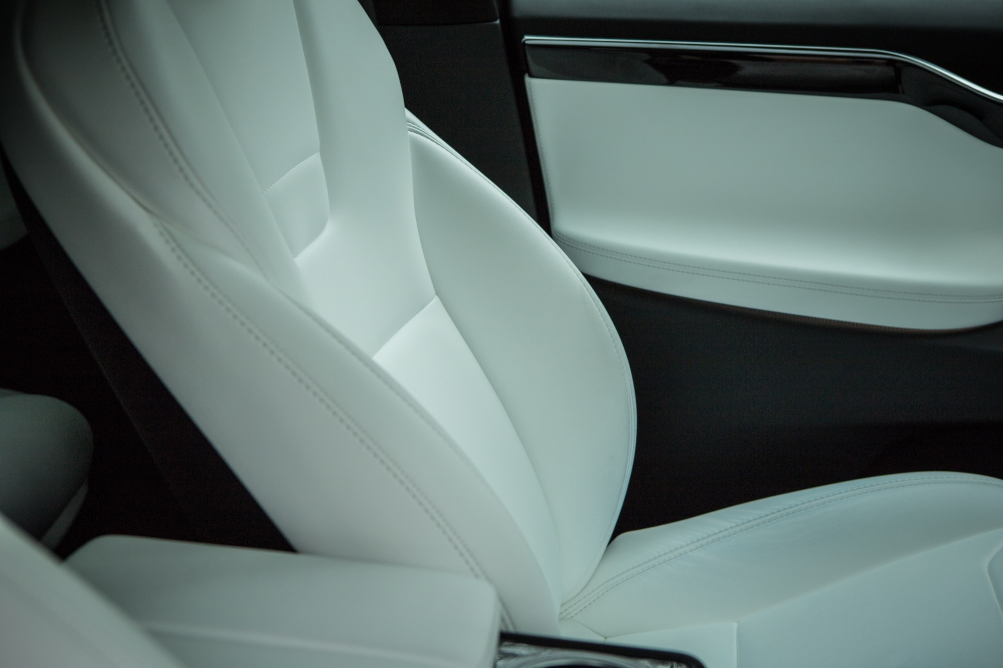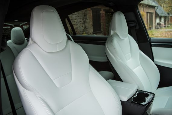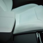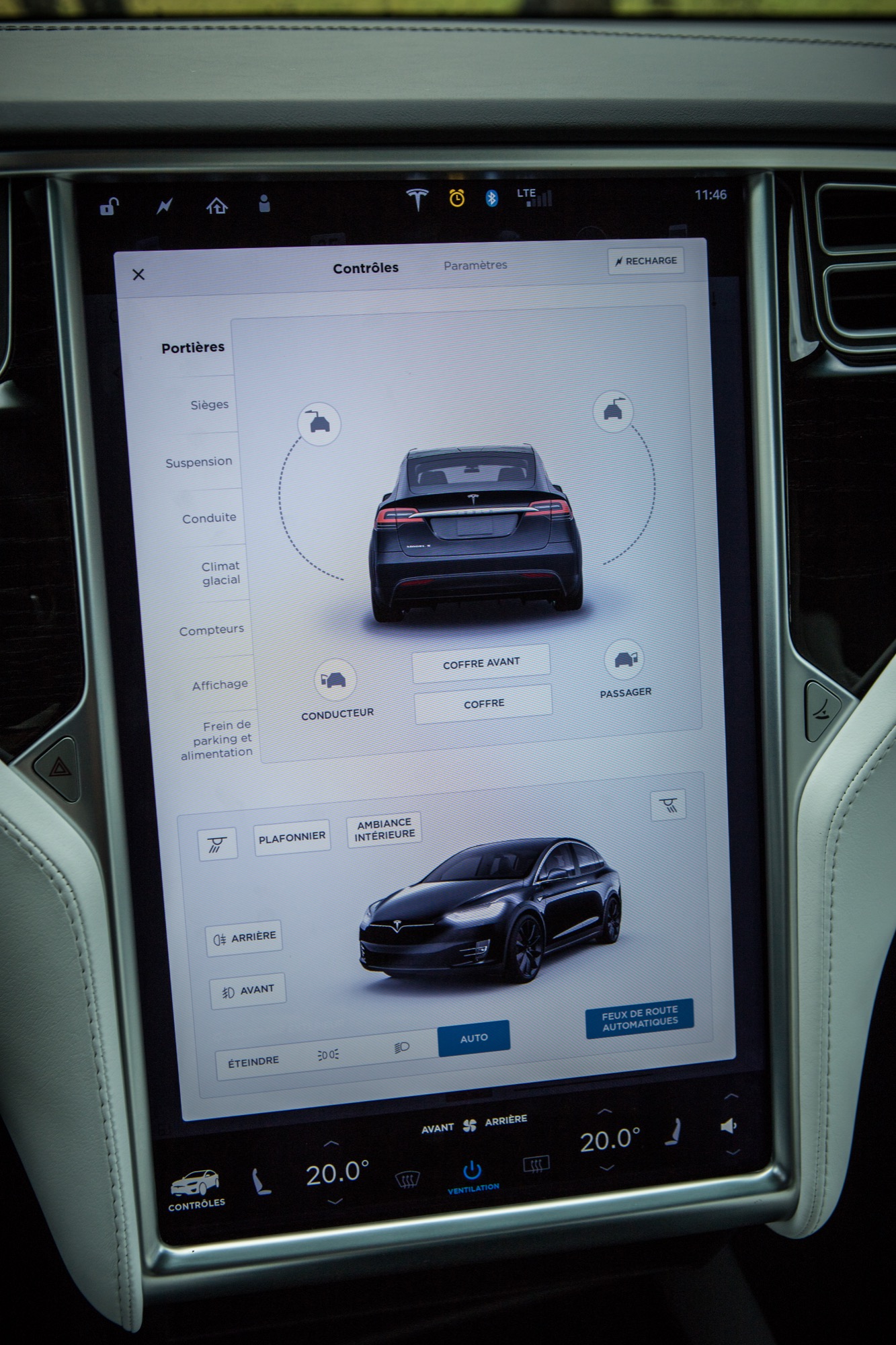 L’intérieur n’est en revanche toujours pas concerné par cette relative discrétion. Appuyer sur le bouton d’ouverture de la portière conducteur, laisser le petit moteur électrique vous assister à 95% dans l’ouverture, écarquiller les yeux. L’habitacle du Model X est bluffant et a fait s’ouvrir en grand quelques bouches pendant mon essai. Le cuir synthétique blanc (approche vegan de la marque, soit) est superbe, immaculé et à priori facilement lavable et détachable.