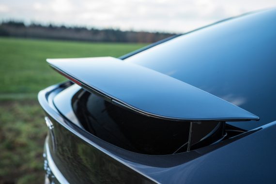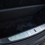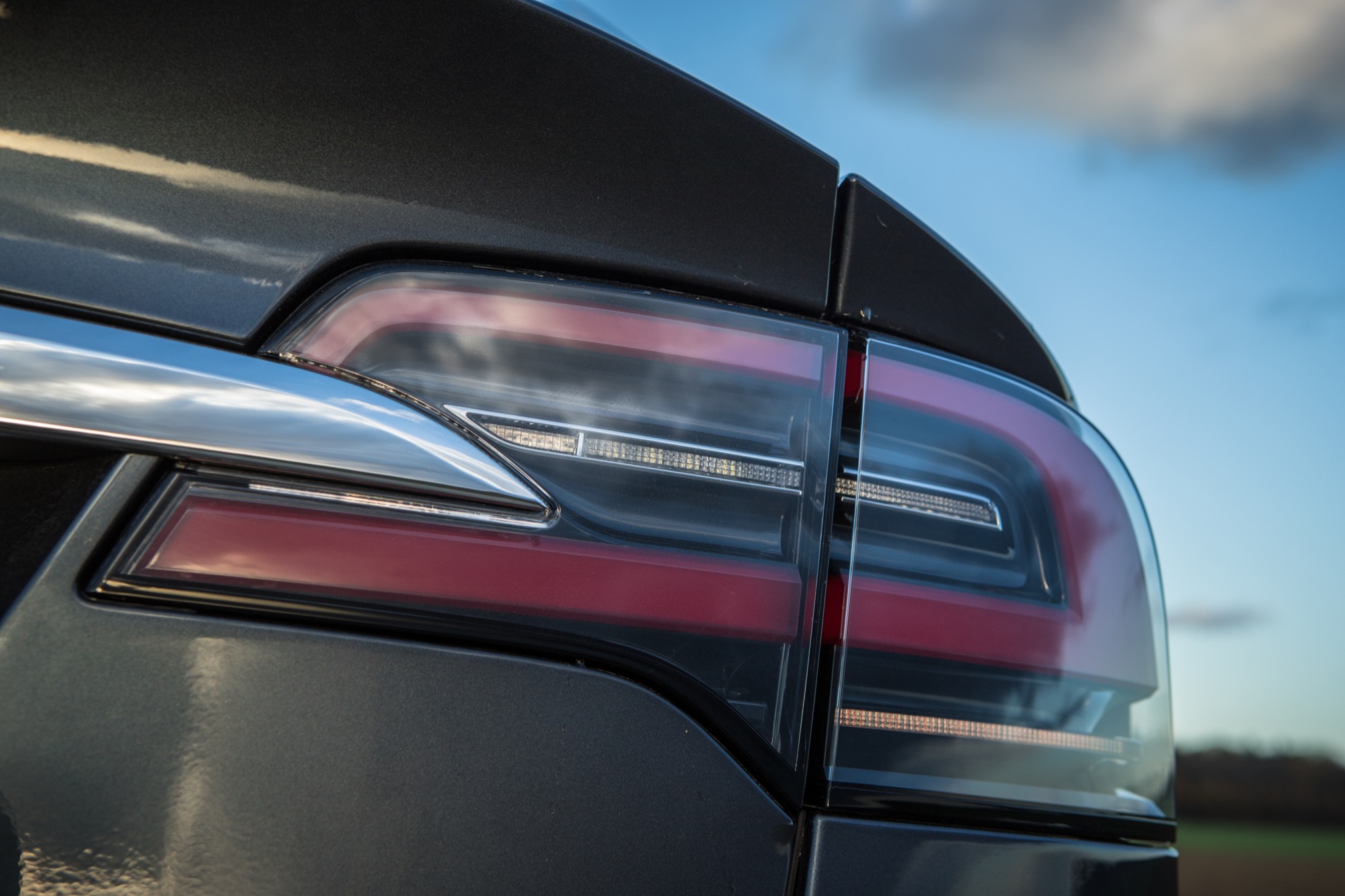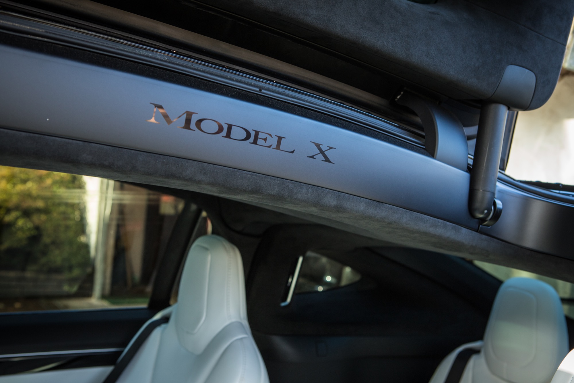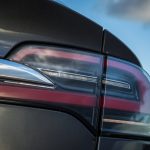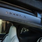 La partie arrière du Model X 100D est massive, très haute, comme le laissait supposer son profil, avec un drôle de petit aileron que l’on pense mobile. La marque a fait le choix de développer une “vraie” 6 ou 7 places et cela implique de conserver une garde au toit suffisante pour la dernière rangée de fauteuils. Bref, c’est fonctionnel et le design des feux et du bandeau chromé ne m’excitent pas outre mesure. J’apprécie en revanche le TESLA bien détaillé sur le jonc chromé et les petits détails de style et de texture/structure des feux. On notera enfin le diffuseur assez discret mais qui participe avec le fond plat à la bonne performance aéro de l’auto.