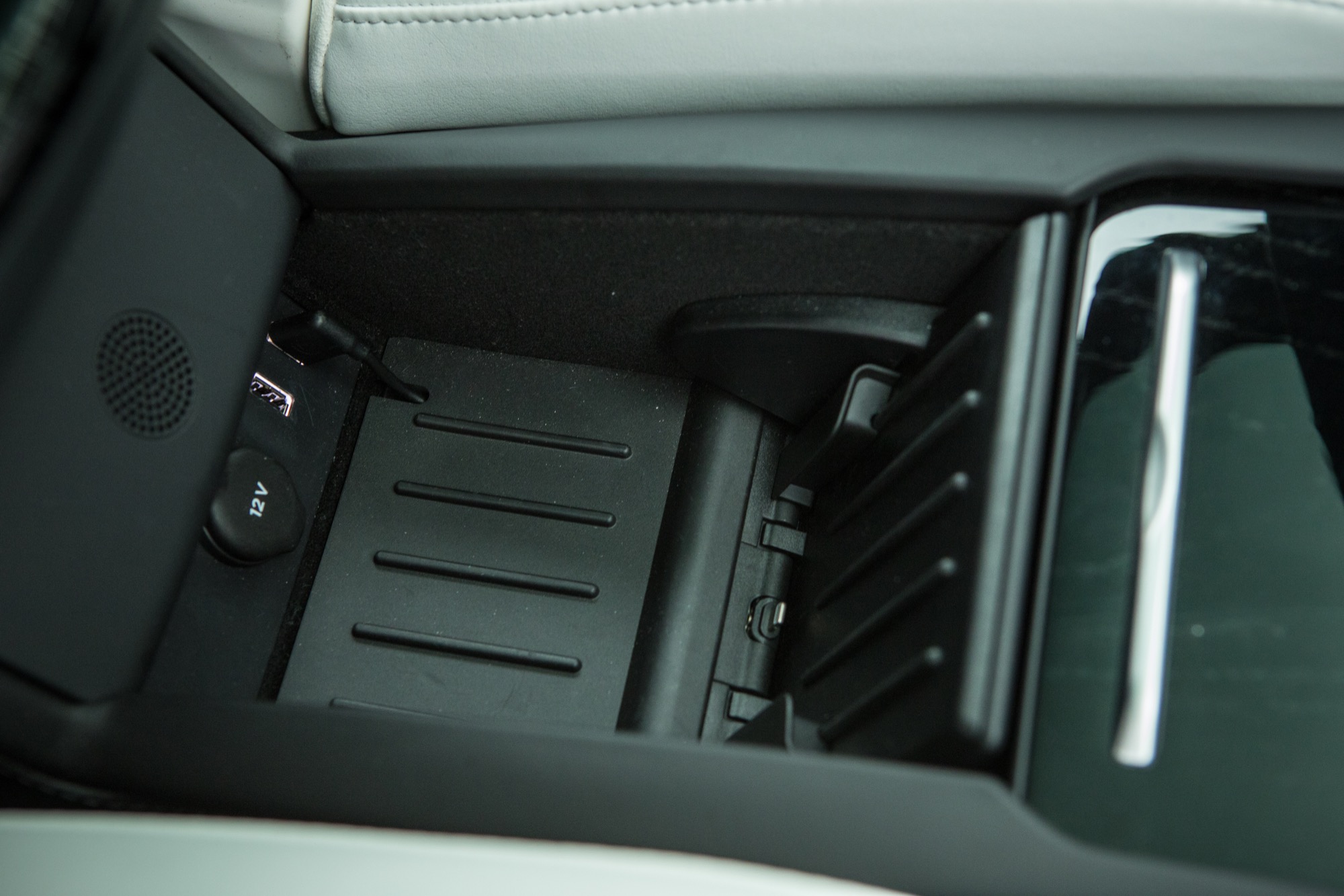 Au delà du double porte gobelet fourre-tout que l’on peut masquer, l’espace central est désormais occupé par une trappe pivotante sur laquelle on peut brancher son téléphone (prise configurable j’imagine). Devant, un grand fourre-tout avec des petits arceaux pour bien tenir les objets. C’était bien l’espace vide, c’est mieux un espace bien pensé dans lequel se vider les poches intelligemment.