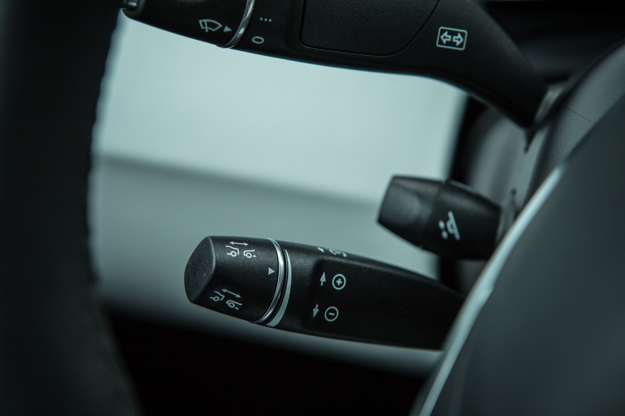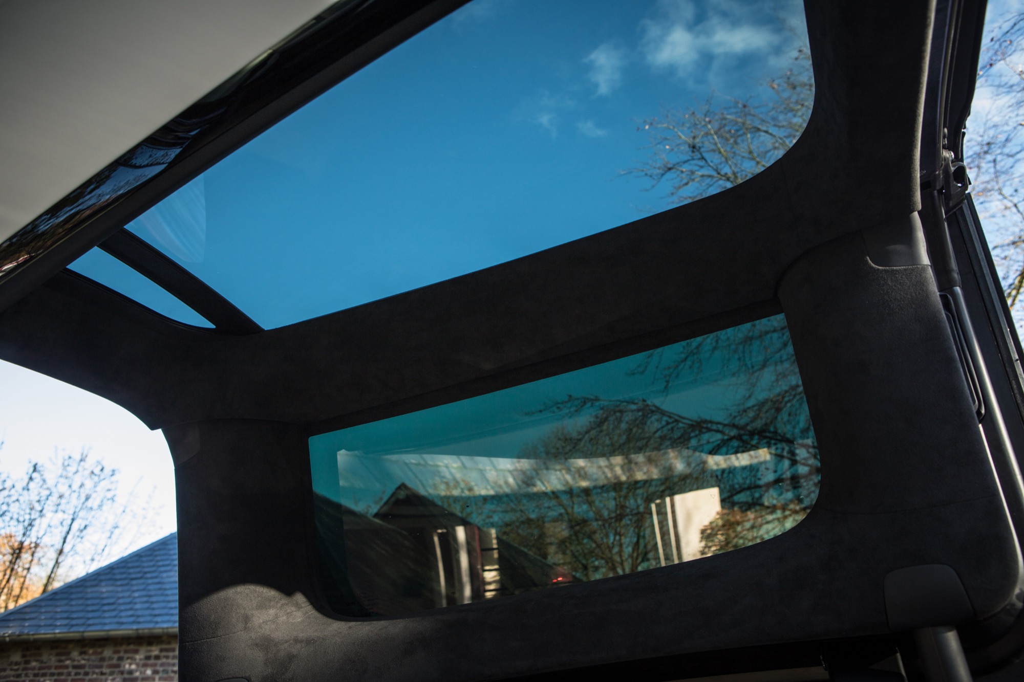 On s’assoit, on observe. Les portières sont toujours joliment dessinées avec leur double poignée singulière, l’une servant à ouvrir, l’autre à tirer doucement la portière pour qu’elle se ferme toute seule. J’aime le contraste entre le blanc du cuir et les noirs laqués ou mat des autres composants. Les commandes viennent de chez Mercedes, que ce soit pour les commandes des vitres ou pour les comodos, c’est tout sauf une critique, surtout qu’elles sont bien intégrées.