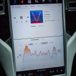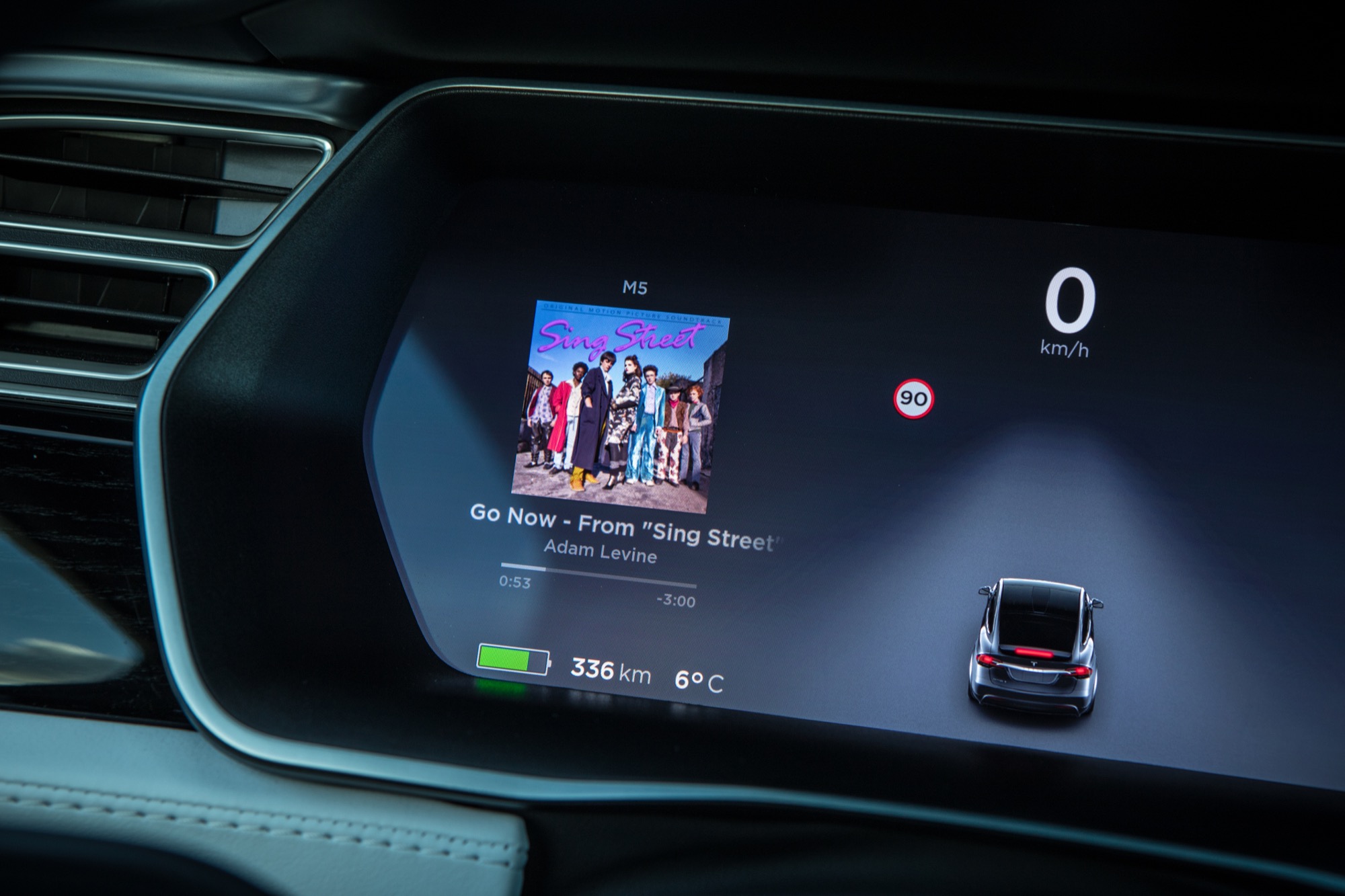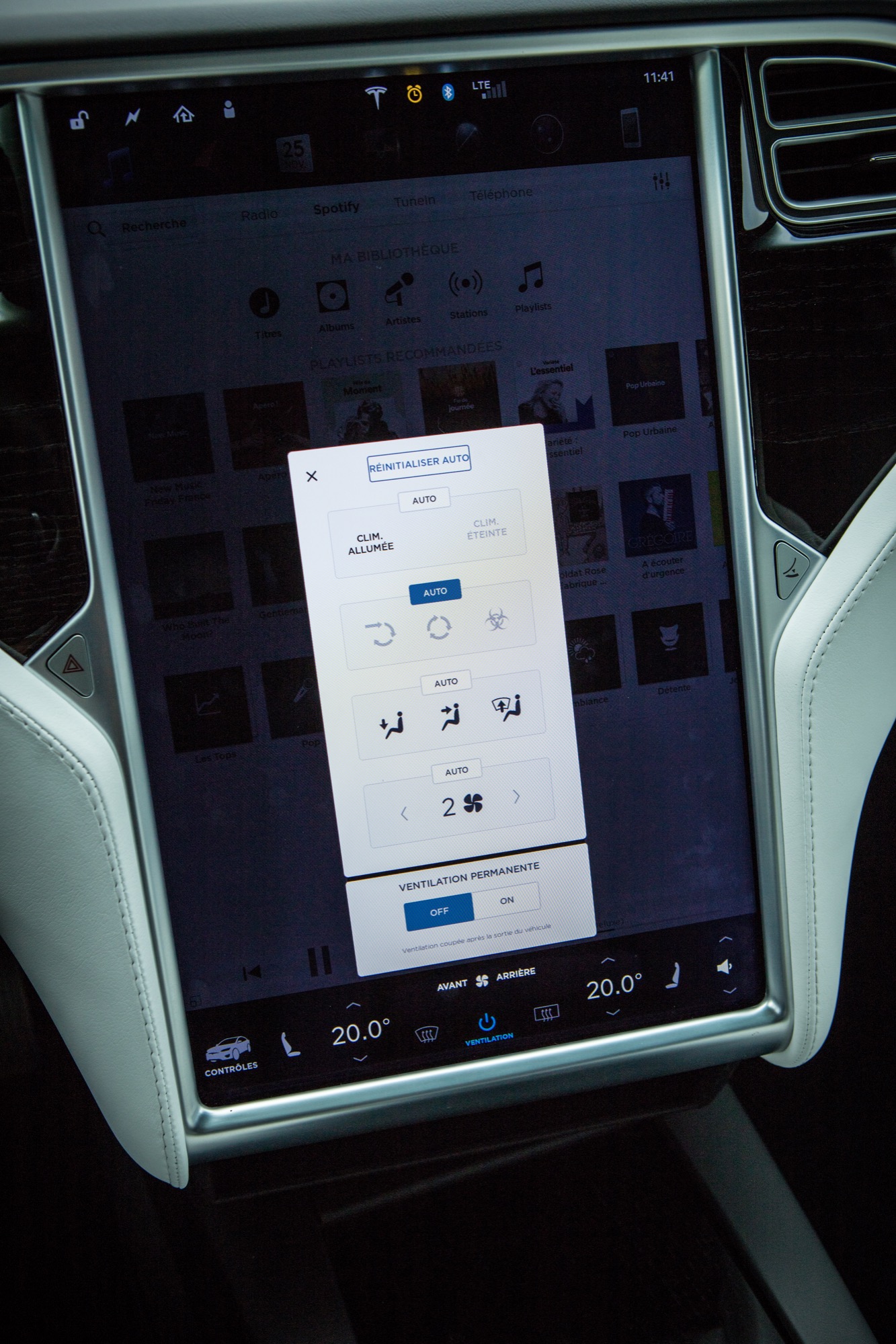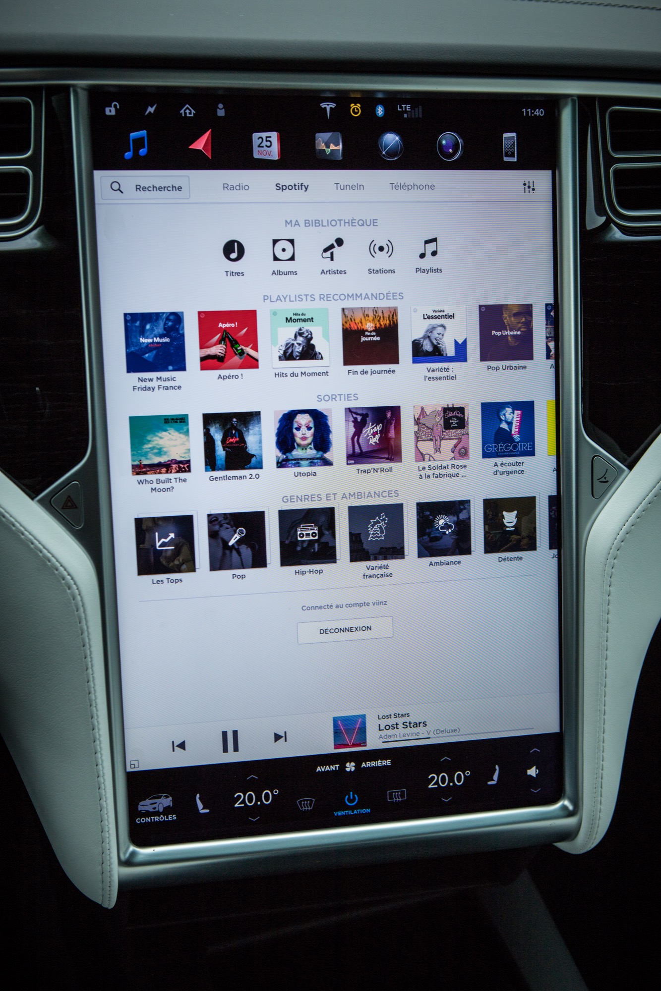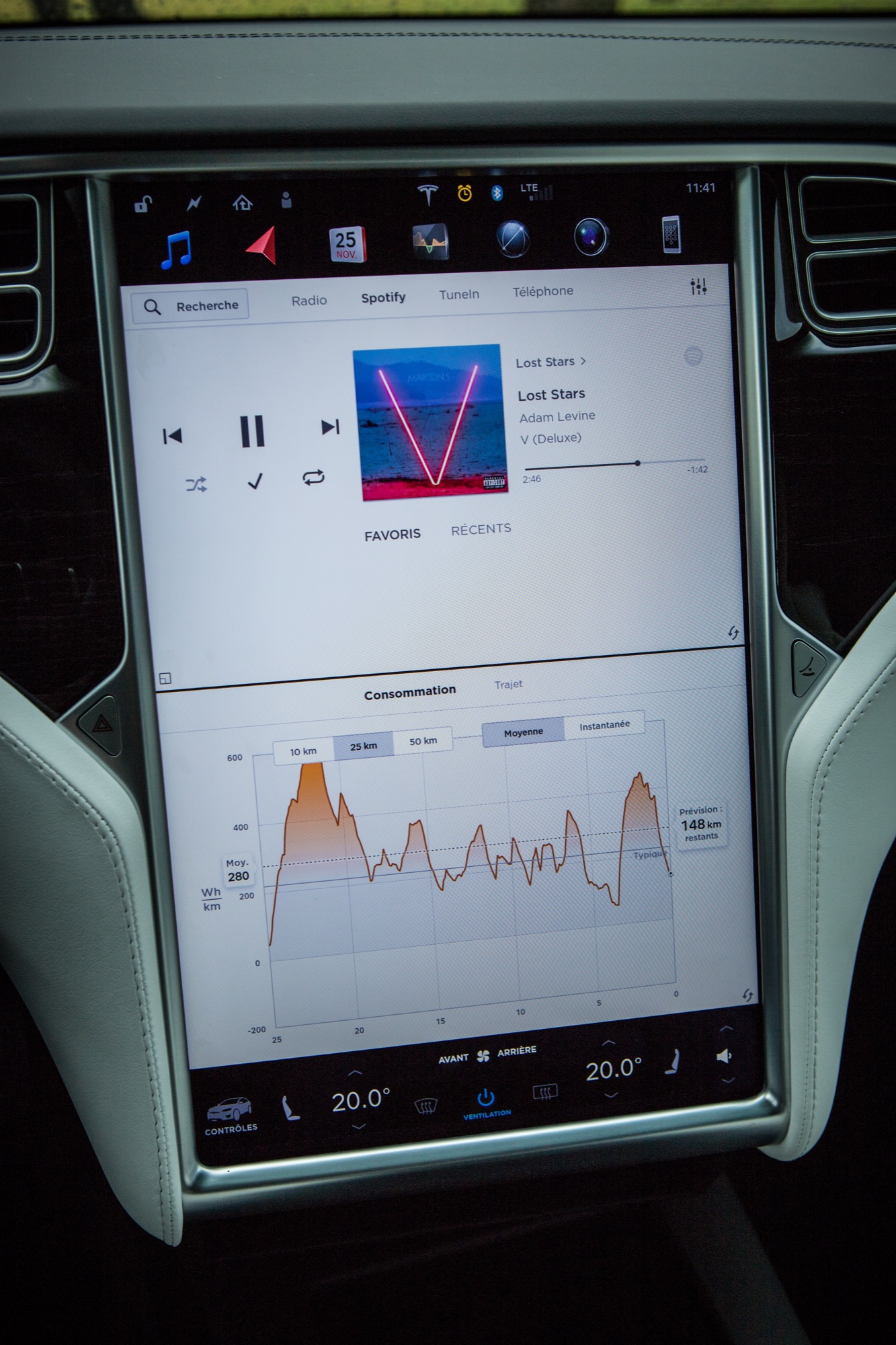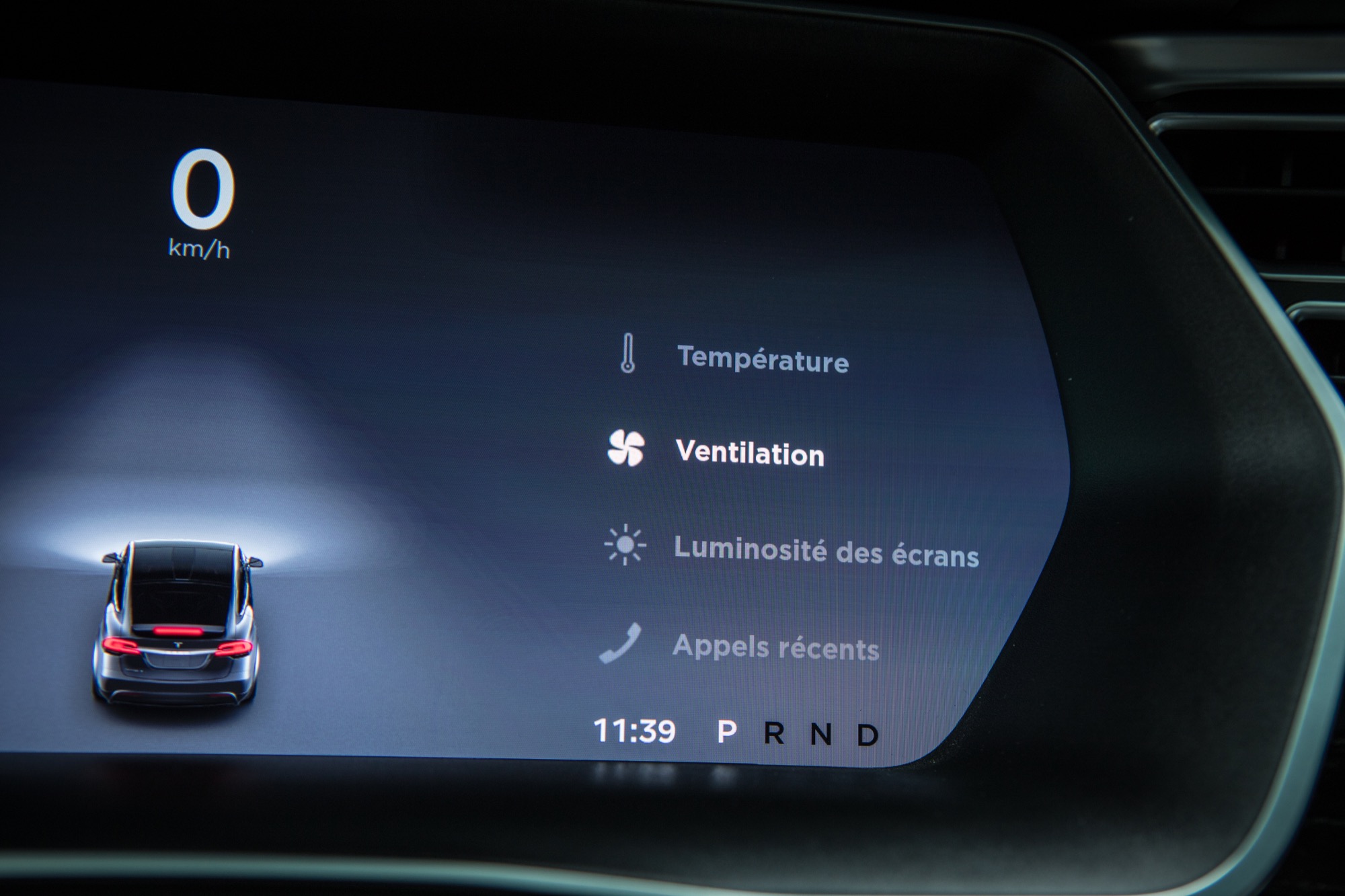 Ce qui saute ensuite aux yeux, c’est la luminosité. Au delà de l’habitacle contrasté en blanc et noir, le pare-brise gigantesque illumine totalement les deux places avant. La planche de bord épurée et l’écran central n’en ressortent que plus. Cet écran reste la pièce maîtresse de Tesla, l’élément qui vous fait penser que vous êtes dans une voiture de la prochaine génération, directement venue du turfu.
