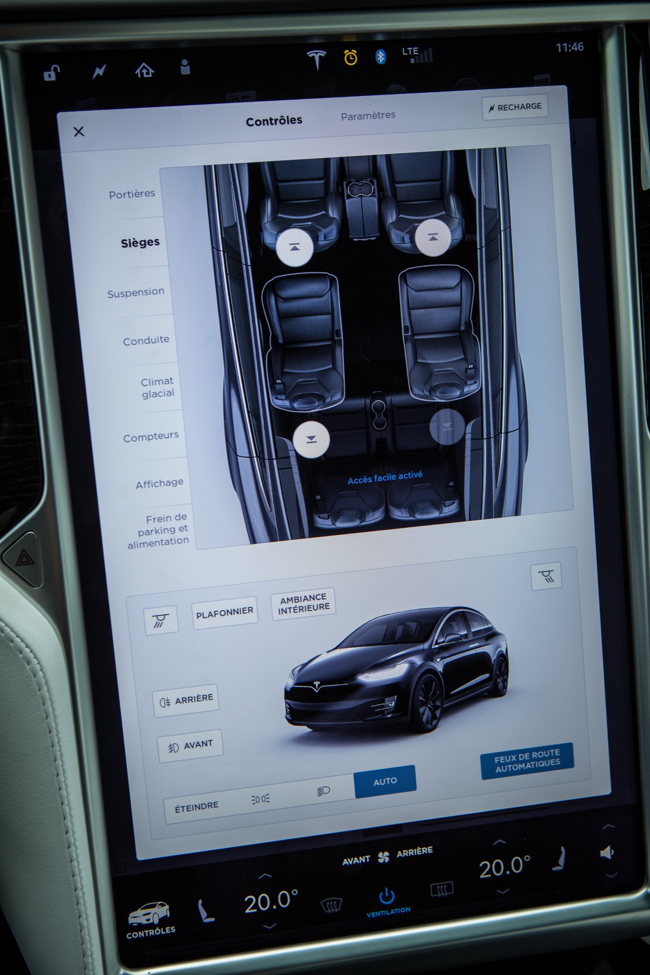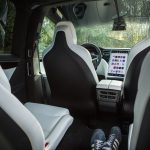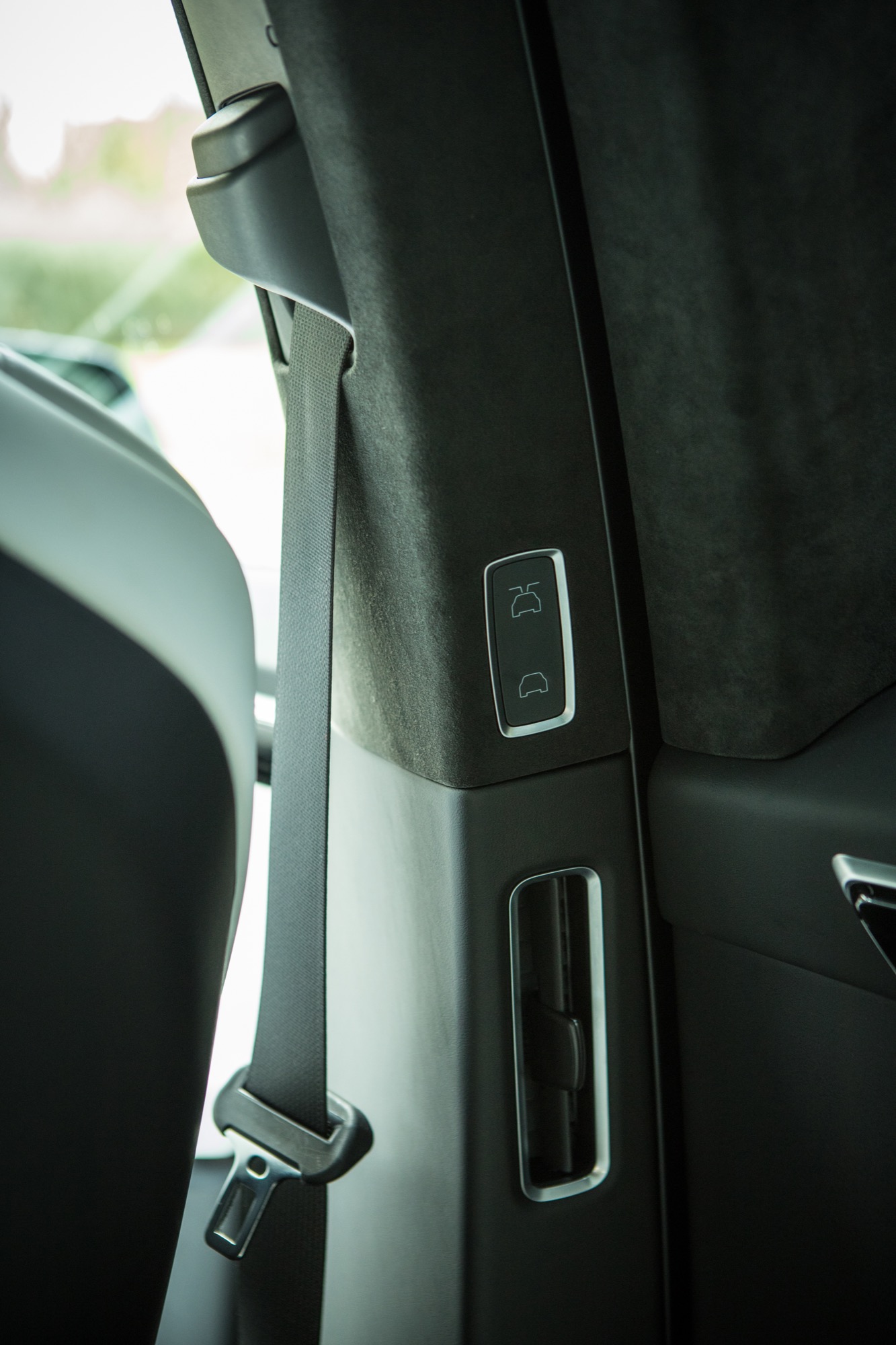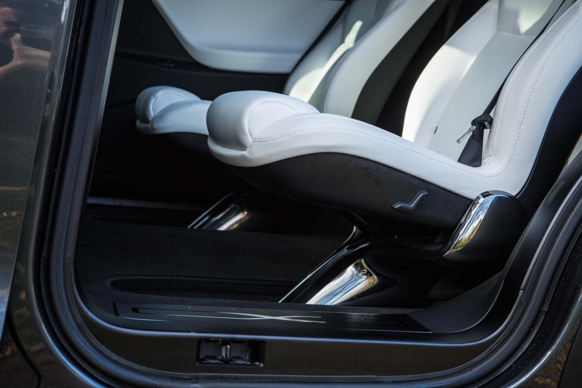 On pourrait en douter mais il suffit de regarder quelques vidéos et photos sur les internets pour se rendre compte que s’il y avait bien quelques difficultés au début, les différentes mises à jour sorties depuis rendent la chose vraiment efficace. L’accès aux places arrières se fait en repoussant électriquement les sièges de la rangée 2. On peut alors monter sans se baisser (oui, oui, tout droit) et s’asseoir tranquillement à l’arrière. L’espace entre les sièges devant permet de déployer ses jambes sans souci et deux adultes de bonne taille peuvent s’installer très confortablement. Une vraie six places, avec un peu de lumière tombant via les fenêtres intégrées dans le panneau sommital des portes Falcon.