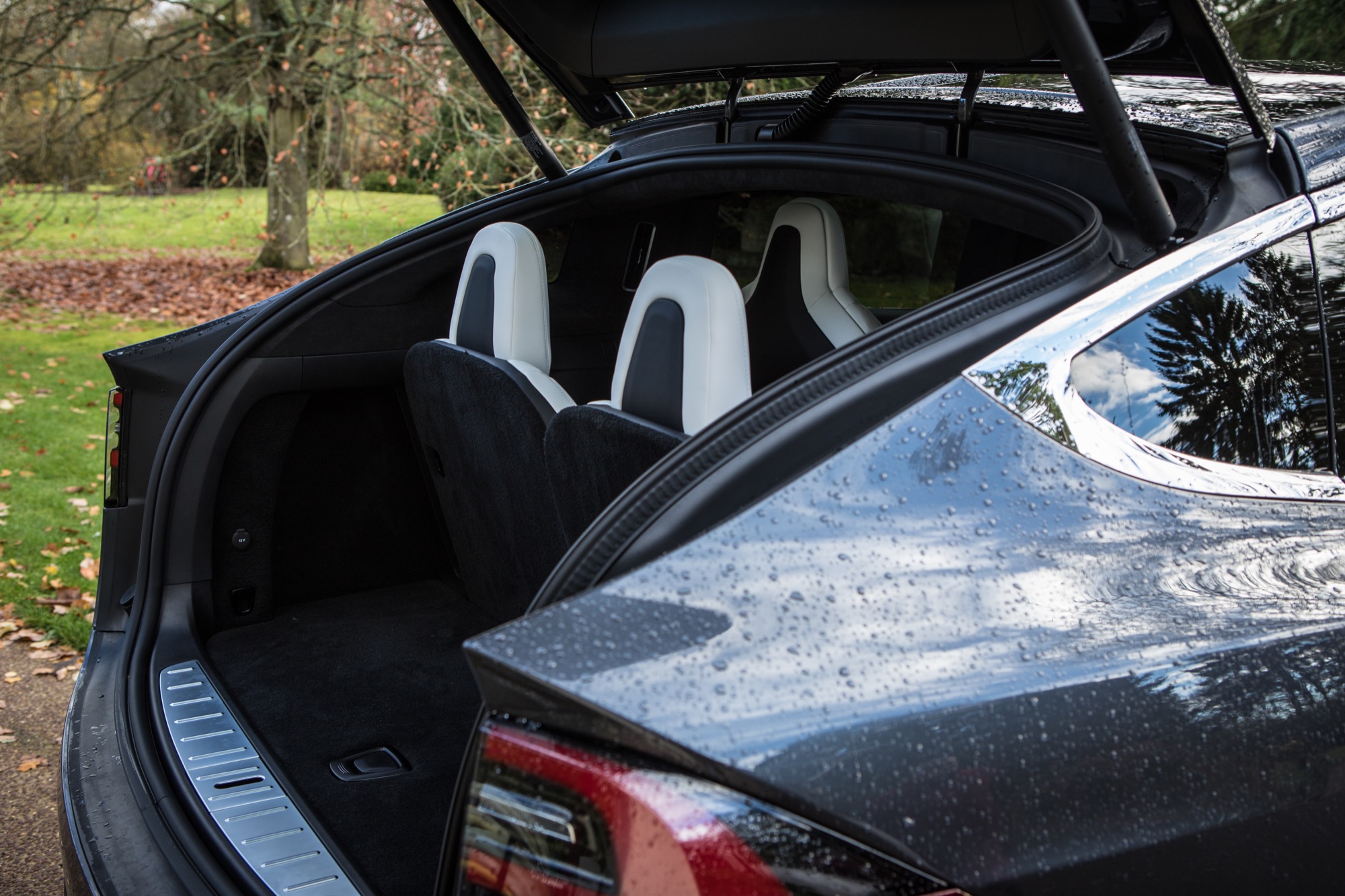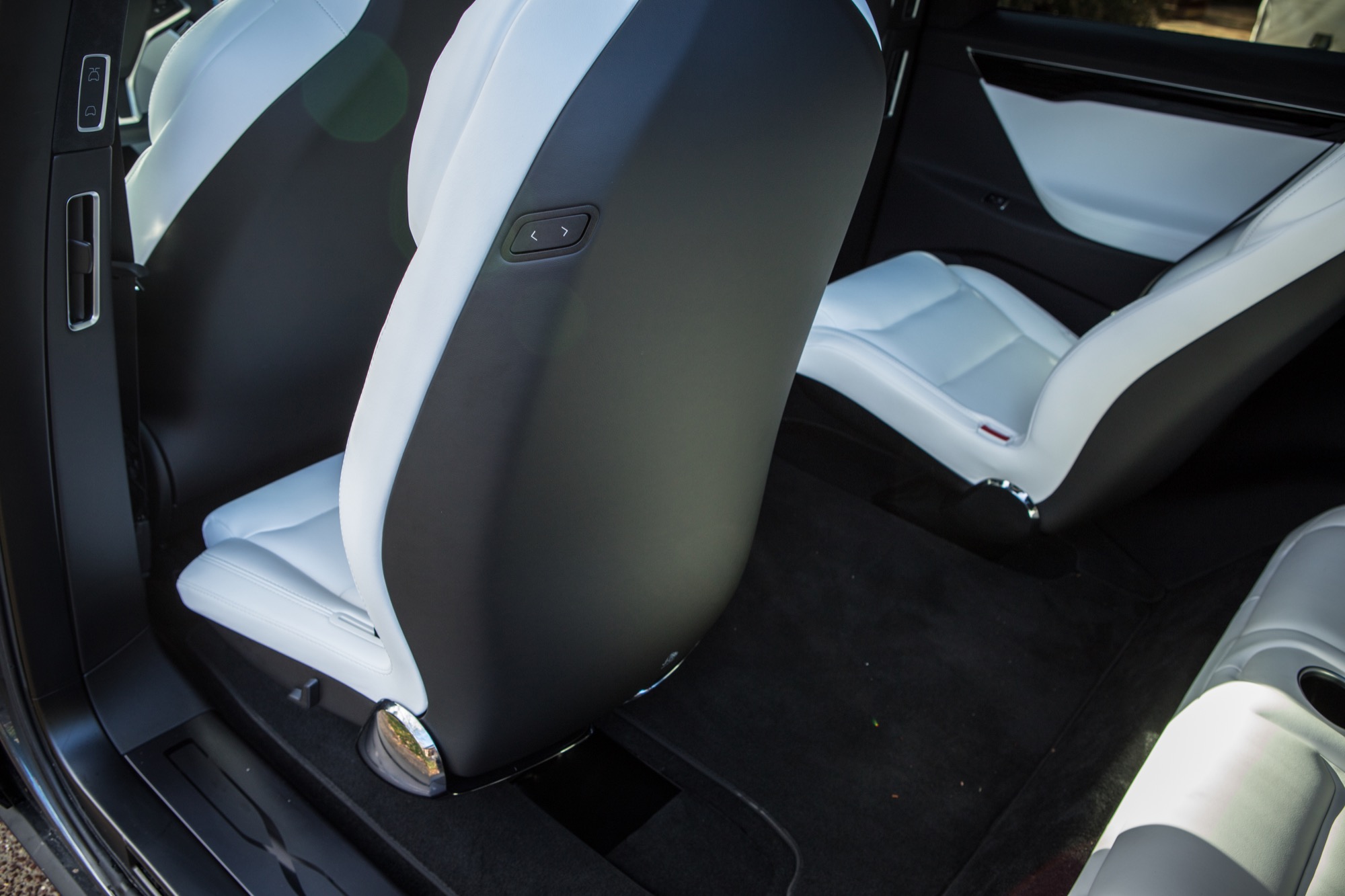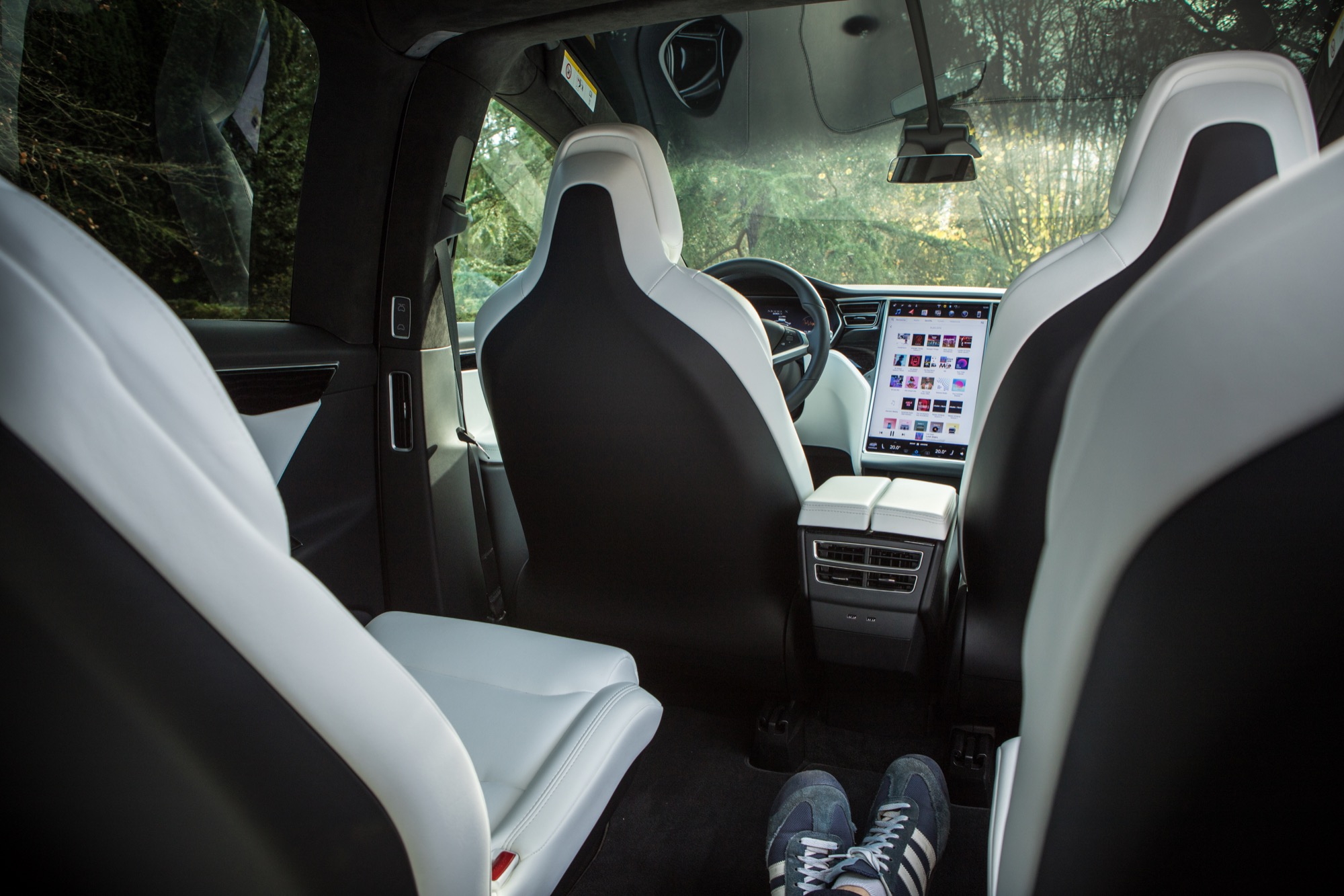 On pourrait en douter mais il suffit de regarder quelques vidéos et photos sur les internets pour se rendre compte que s’il y avait bien quelques difficultés au début, les différentes mises à jour sorties depuis rendent la chose vraiment efficace. L’accès aux places arrières se fait en repoussant électriquement les sièges de la rangée 2. On peut alors monter sans se baisser (oui, oui, tout droit) et s’asseoir tranquillement à l’arrière. L’espace entre les sièges devant permet de déployer ses jambes sans souci et deux adultes de bonne taille peuvent s’installer très confortablement. Une vraie six places, avec un peu de lumière tombant via les fenêtres intégrées dans le panneau sommital des portes Falcon.