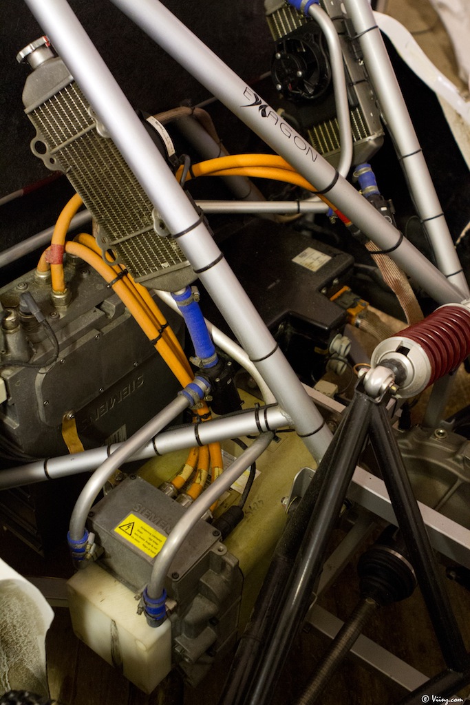 En revanche, dans les entrailles, c’est un petit régal avec les batteries Saft assurant 35 minutes d’autonomie à plein « régime », le moteur Siemens transformant l’électricité en couple qui est alors transmis aux roues via un petit différentiel. La batterie court en fait tout du long de la voiture tandis que le moteur et le diff sont situés sous le capot arrière. On pourrait croire que ce véhicule électrique est un peu gentil, c’est oublier que les meilleurs en électrique courent dans les temps de certains en Silhouette ! Alors, imaginez ce véhicule avec un moteur un chouïa plus performant et 4 roues motrices… peut-être dans quelques années.