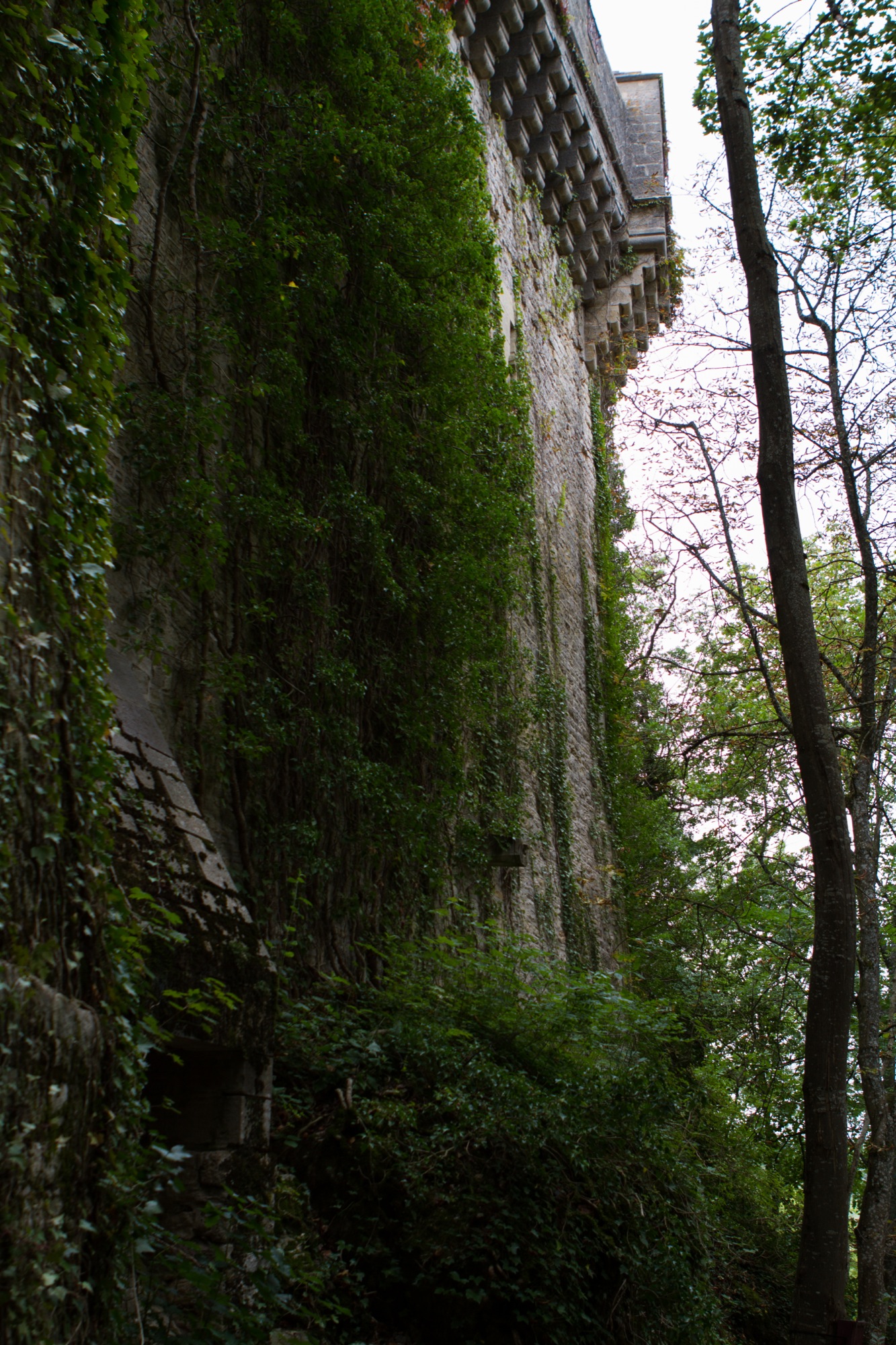 On redescend pour atteindre la cour et la grande terrasse qui domine le village. C’est ici que se dressait le donjon médiéval qui ne fut quant à lui pas rebâti. On découvre néanmoins quelques éléments du château, reconstruits à l’identique sous la pergola de pierre qui sert de support à la splendide vigne vierge. Plus loin, c’est la cuisine que l’on découvre et enfin la petite chapelle du château, datant quant à elle des origines du château au XIème siècle. Sans oublier le puis de 70 mètres de fond, creusé à l’explosif.