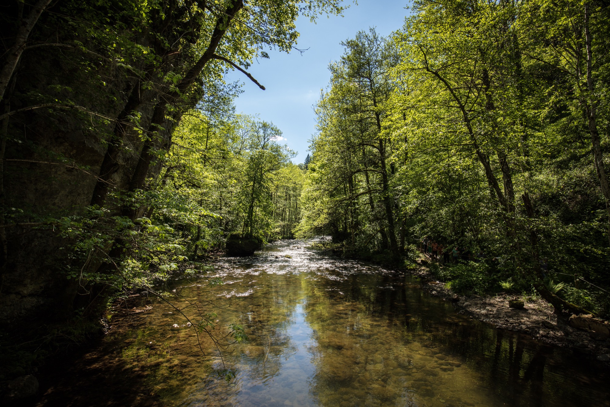 Aujourd’hui, c’est un parcours aménagé au bord de l’eau, mêlant ponts suspendus, ouvrages techniques, passerelles, parcours découvertes des empreintes et animaux de la région ; mais c’est aussi un endroit frais, calme et de toute beauté. Autrement dit, on laisse filer le petit groupe familial devant soi ou on le dépasse franchement pour être ensuite quasiment en solitaire. Bon, pas sûr que ça fonctionne en été.