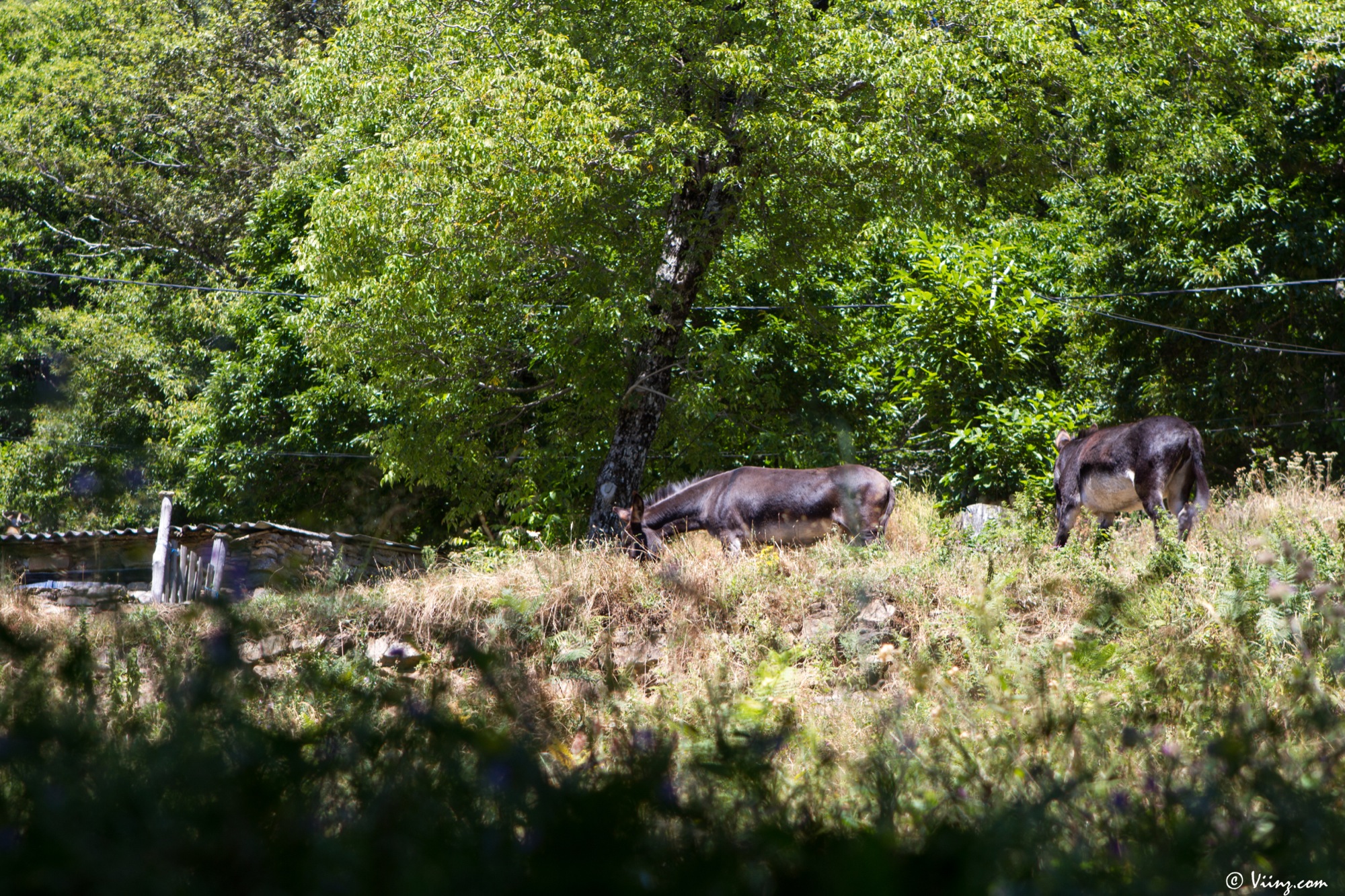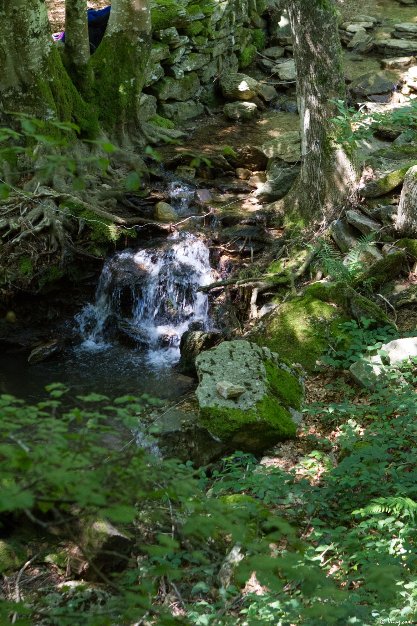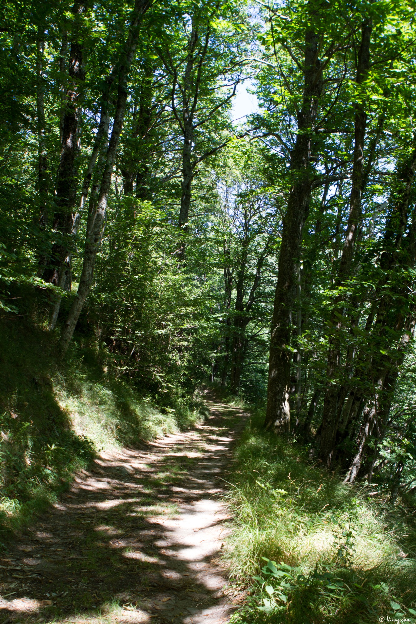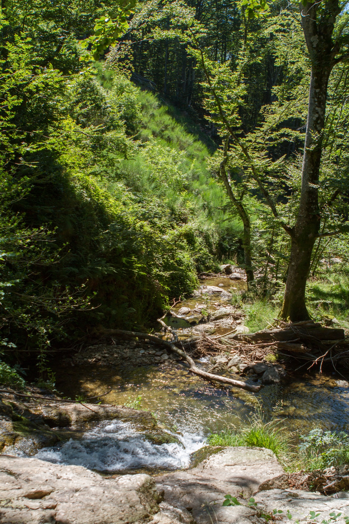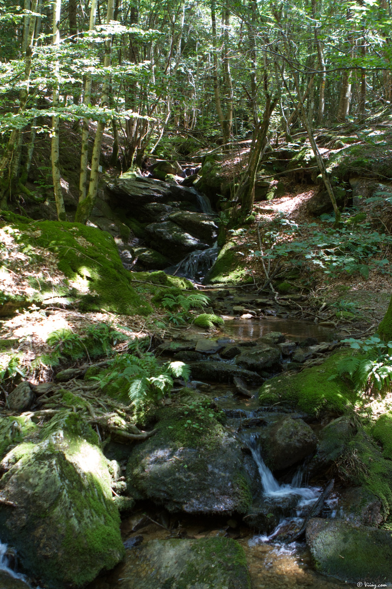 8 kilomètres et assez peu de dénivelé, ce qui explique la présence d’un peu plus de monde et d’enfants que d’ordinaire, weekend aidant ; mais la première descente n’en demeure pas moins raide ! On se retrouve ainsi vite en forêt, passant de ru en ruisseau, plus ou moins vivace, plus ou moins asséché. Le mois d’août n’est pas la période idéale pour voir l’eau cascader en trombes mais ce n’est pas un mal car le sentier peut vite se retrouver impraticable en cas de fortes pluies. Attention donc à tout de même bien choisir votre moment de passage, quand bien même certains des ruisseaux bénéficient d’un petit pont / d’une grosse pierre pour faciliter le passage. Chose amusante également, après avoir dépassé le premier point de vue, on redescend rapidement pour alterner entre forêts de feuillus et de conifères. L’ambiance y est fondamentalement différente mais c’est finalement au milieu d’une de ces dernières que l’on croise le plus beau point d’arrêt (et une souris affolée au passage), invite au pique-nique s’il en est ! La fin de la randonnée alterne montées et descentes, entre les hameaux de Quintaine et de Lagarde (dîtes donc, c’est fort mignon et paumé, Quintaine, j’aime beaucoup, surtout avec cette guimbarde abandonnée !)…