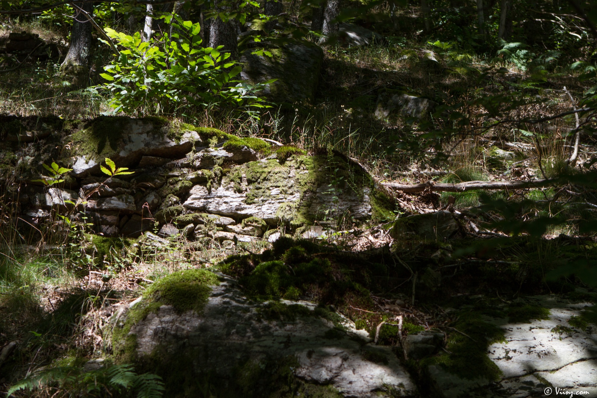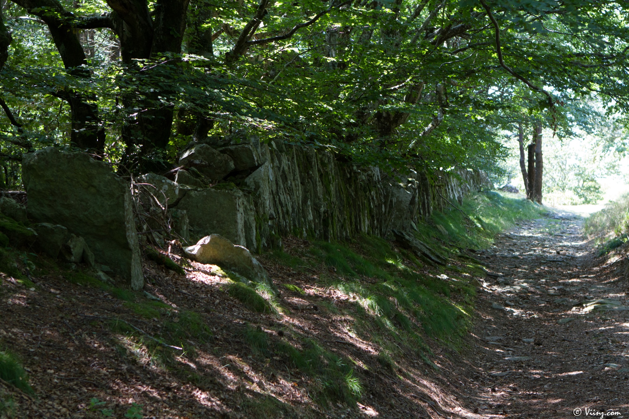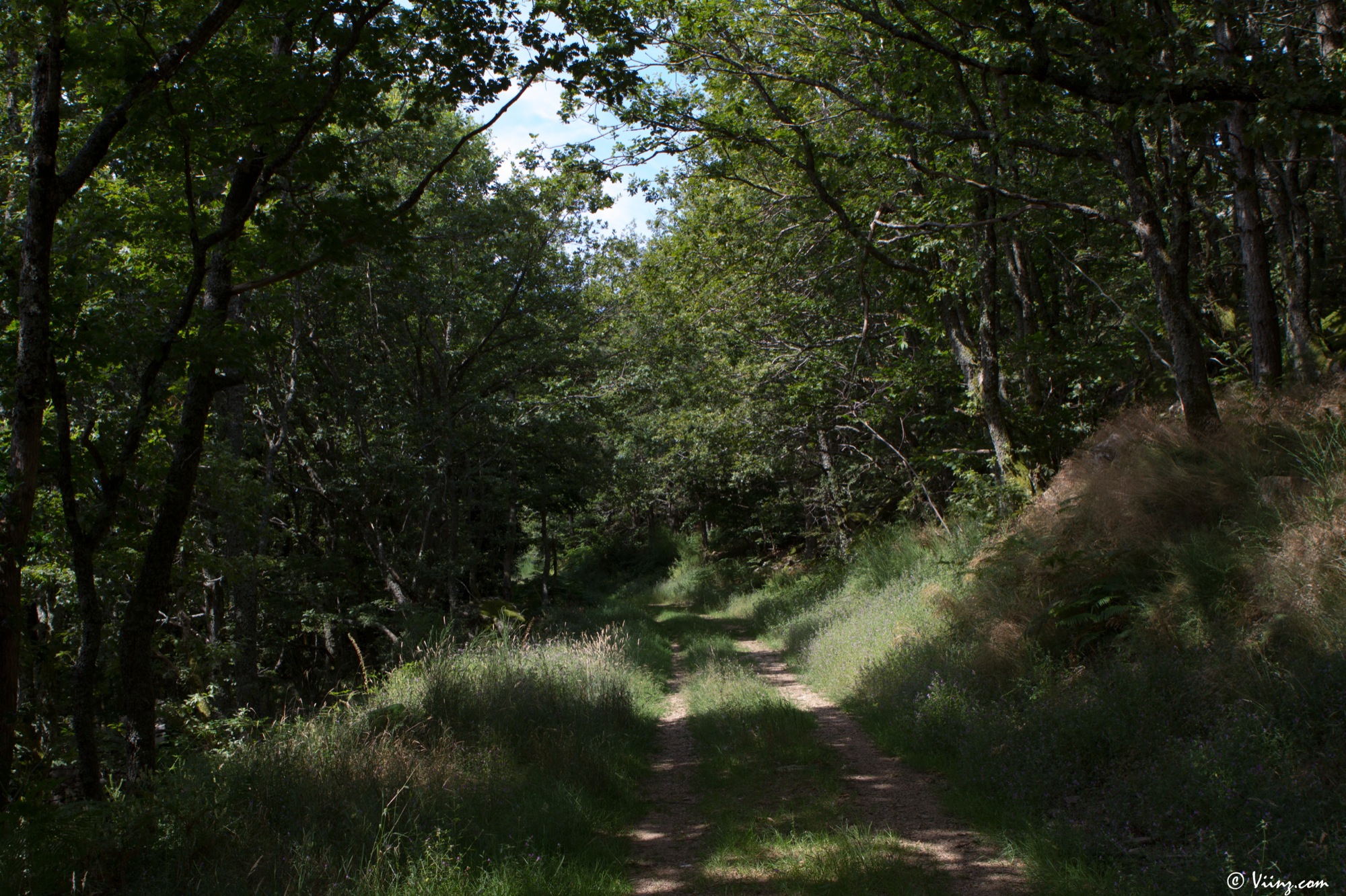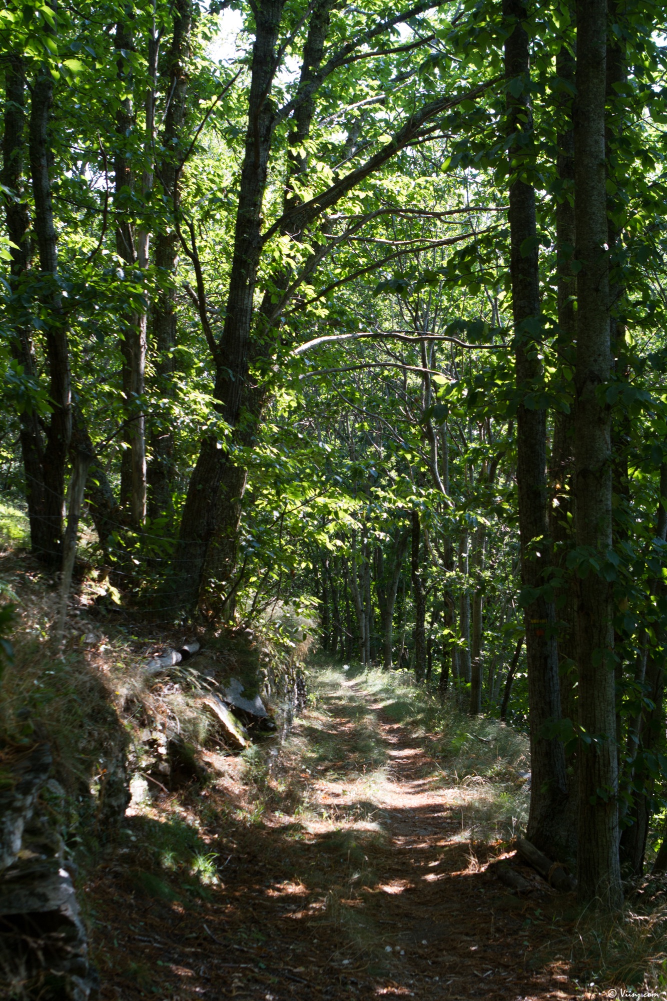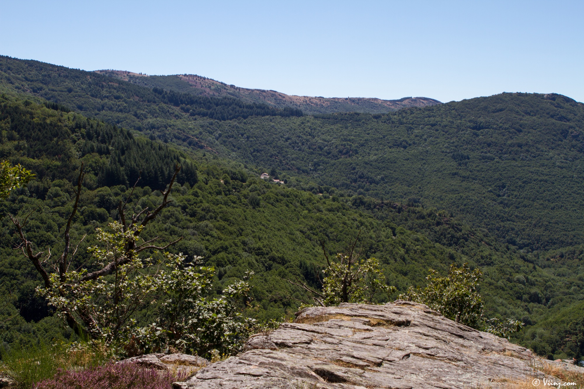 8 kilomètres et assez peu de dénivelé, ce qui explique la présence d’un peu plus de monde et d’enfants que d’ordinaire, weekend aidant ; mais la première descente n’en demeure pas moins raide ! On se retrouve ainsi vite en forêt, passant de ru en ruisseau, plus ou moins vivace, plus ou moins asséché. Le mois d’août n’est pas la période idéale pour voir l’eau cascader en trombes mais ce n’est pas un mal car le sentier peut vite se retrouver impraticable en cas de fortes pluies. Attention donc à tout de même bien choisir votre moment de passage, quand bien même certains des ruisseaux bénéficient d’un petit pont / d’une grosse pierre pour faciliter le passage. Chose amusante également, après avoir dépassé le premier point de vue, on redescend rapidement pour alterner entre forêts de feuillus et de conifères. L’ambiance y est fondamentalement différente mais c’est finalement au milieu d’une de ces dernières que l’on croise le plus beau point d’arrêt (et une souris affolée au passage), invite au pique-nique s’il en est ! La fin de la randonnée alterne montées et descentes, entre les hameaux de Quintaine et de Lagarde (dîtes donc, c’est fort mignon et paumé, Quintaine, j’aime beaucoup, surtout avec cette guimbarde abandonnée !)…