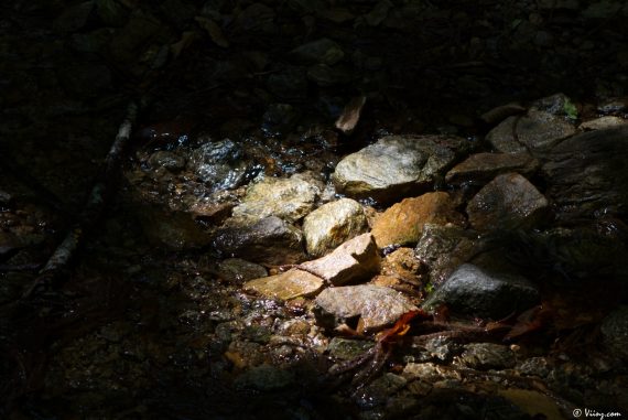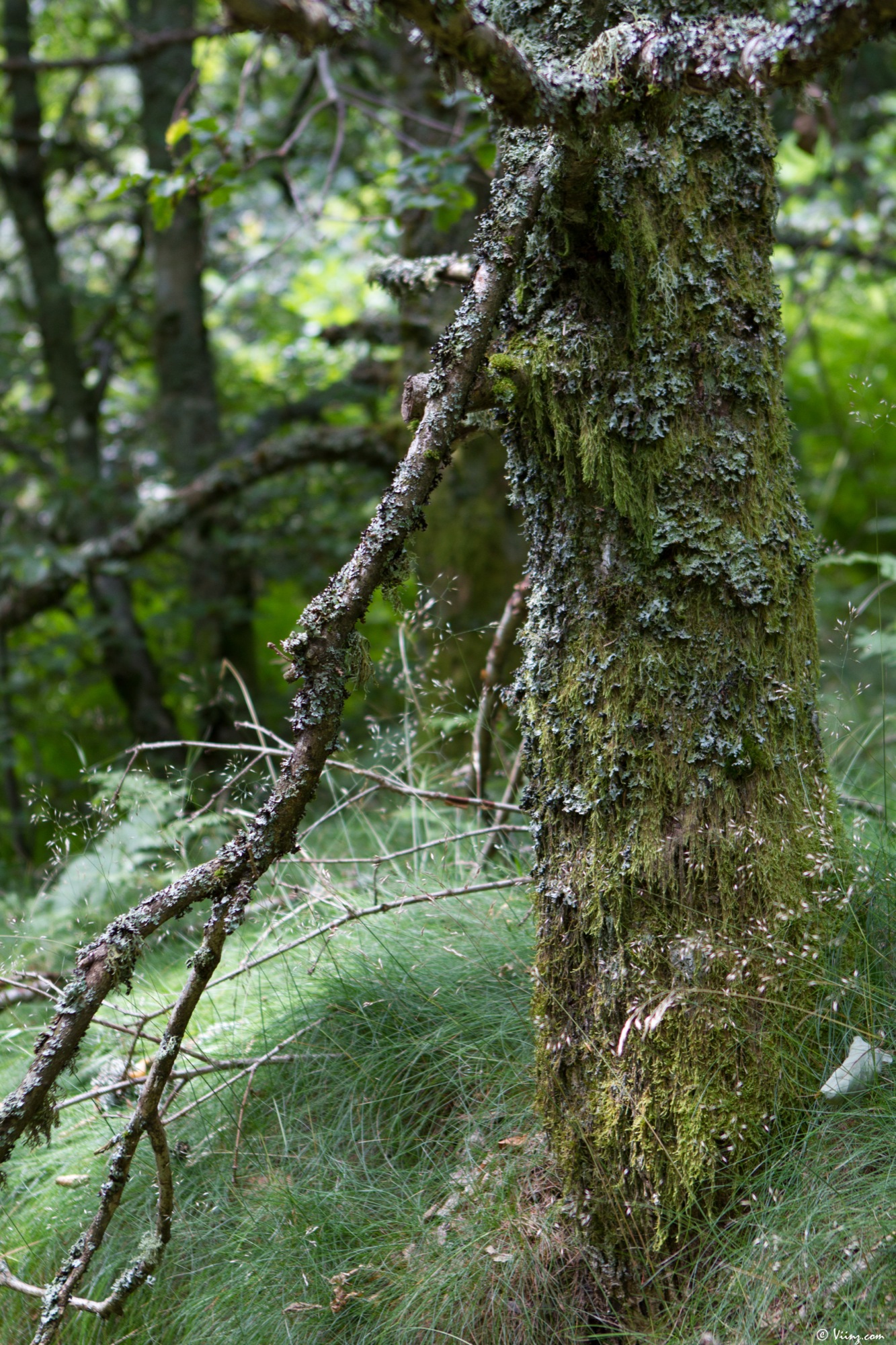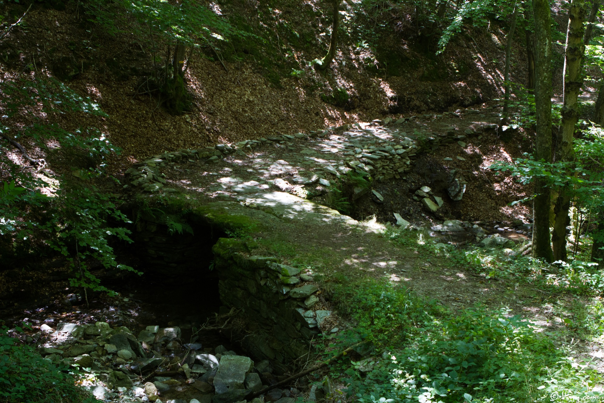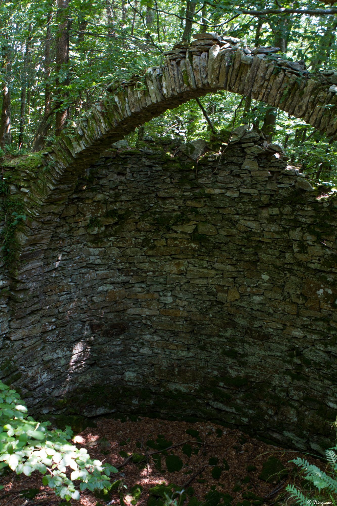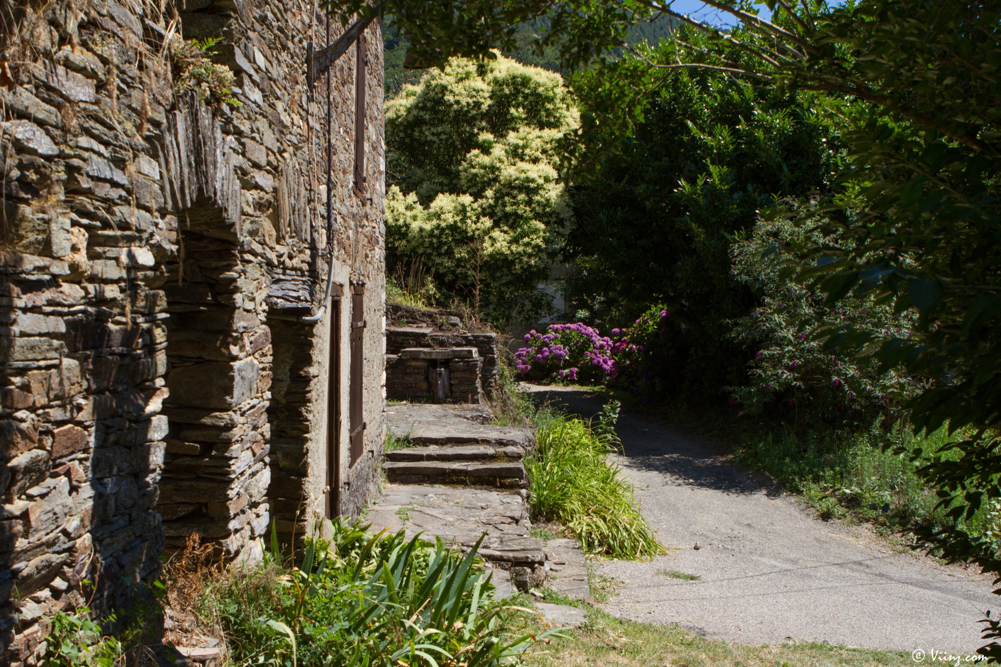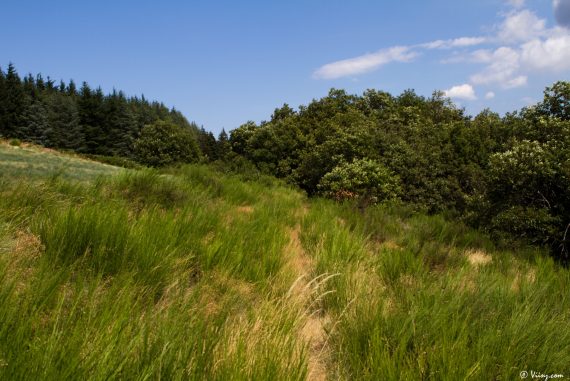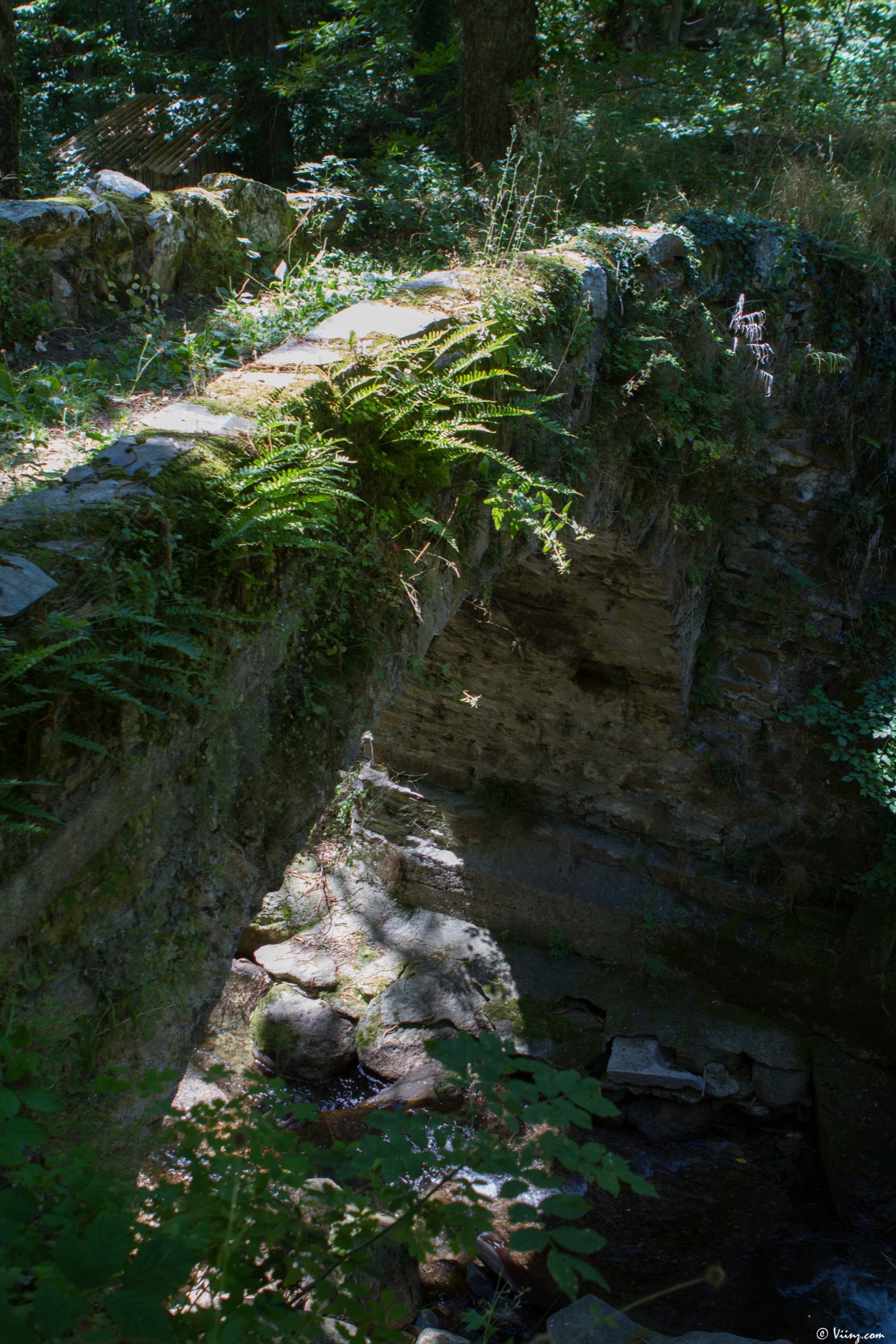 8 kilomètres et assez peu de dénivelé, ce qui explique la présence d’un peu plus de monde et d’enfants que d’ordinaire, weekend aidant ; mais la première descente n’en demeure pas moins raide ! On se retrouve ainsi vite en forêt, passant de ru en ruisseau, plus ou moins vivace, plus ou moins asséché. Le mois d’août n’est pas la période idéale pour voir l’eau cascader en trombes mais ce n’est pas un mal car le sentier peut vite se retrouver impraticable en cas de fortes pluies. Attention donc à tout de même bien choisir votre moment de passage, quand bien même certains des ruisseaux bénéficient d’un petit pont / d’une grosse pierre pour faciliter le passage. Chose amusante également, après avoir dépassé le premier point de vue, on redescend rapidement pour alterner entre forêts de feuillus et de conifères. L’ambiance y est fondamentalement différente mais c’est finalement au milieu d’une de ces dernières que l’on croise le plus beau point d’arrêt (et une souris affolée au passage), invite au pique-nique s’il en est ! La fin de la randonnée alterne montées et descentes, entre les hameaux de Quintaine et de Lagarde (dîtes donc, c’est fort mignon et paumé, Quintaine, j’aime beaucoup, surtout avec cette guimbarde abandonnée !)…