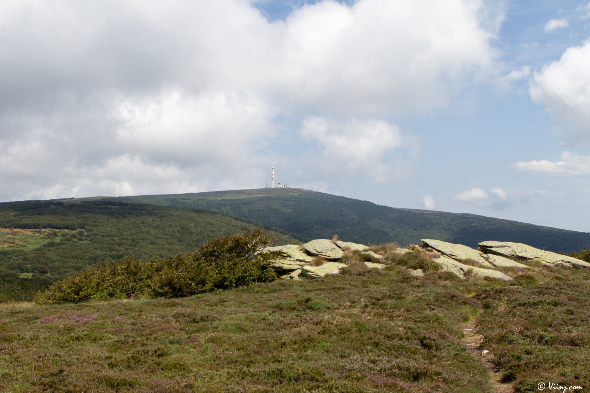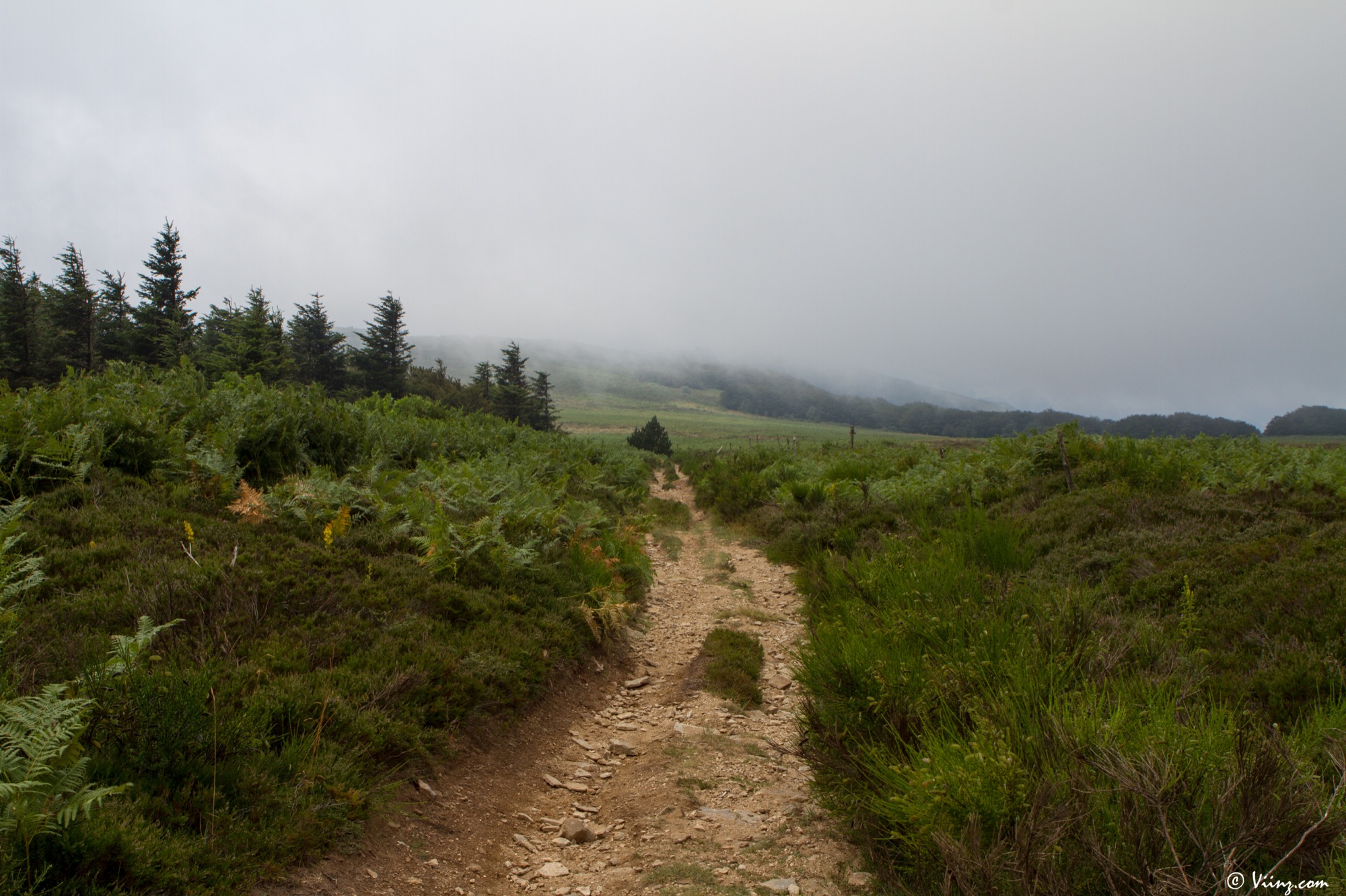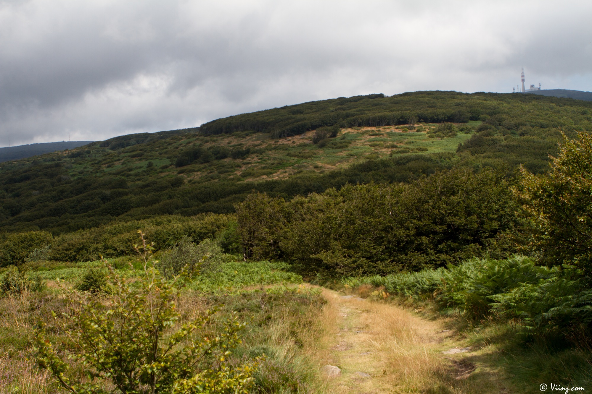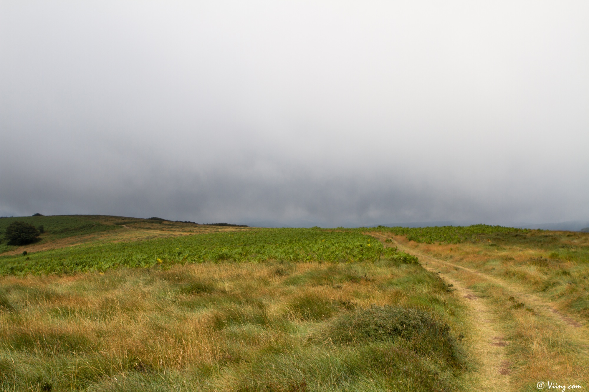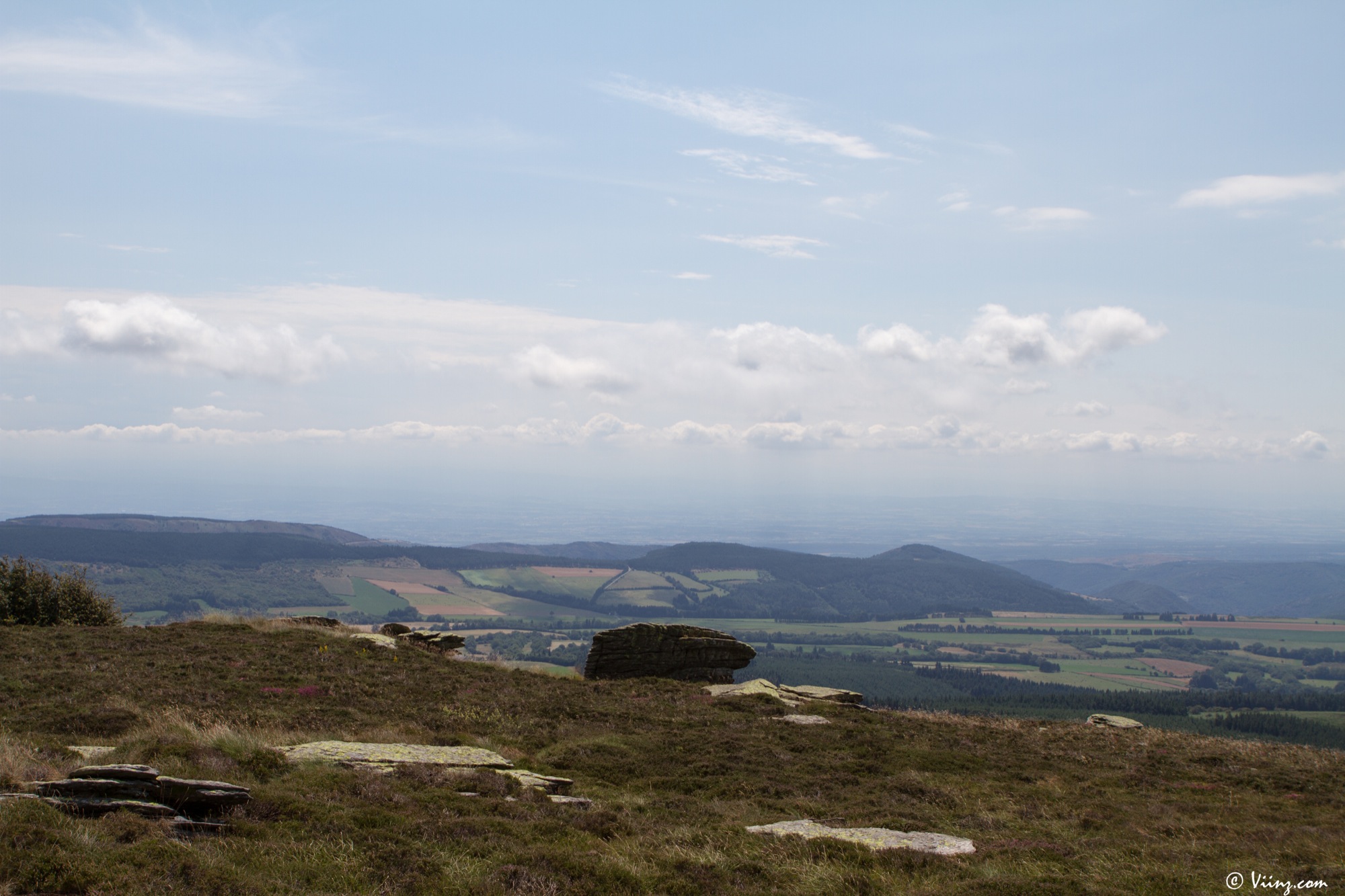Manque de bol ce jour-là, il fait relativement moche sur le pic et le vent souffle (bon, il souffle tout le temps ici, à dire vrai). Il faudra attendre une bonne demie-heure pour que le soleil daigne se lever et darde ses rayons sur nos peaux dénuées de crème. Le vent frais, ce vil fourbe, couvrira le crime. Sacrée alliance, inattendue au vu du manteau nuageux mais si vous voulez vous balader là-haut : prenez de la crème. C’est d’autant plus dommage de brûler que le paysage change et donne envie d’en profiter. Lande de bruyères et de fougères, énorme chenille au milieu du chemin et une vue à couper le souffle depuis le Roc du Nouret ! Splendide, d’autant plus que le soleil se fait plus présent et moins fourbe. Voilà qui pousse à redescendre, un peu plus vite.